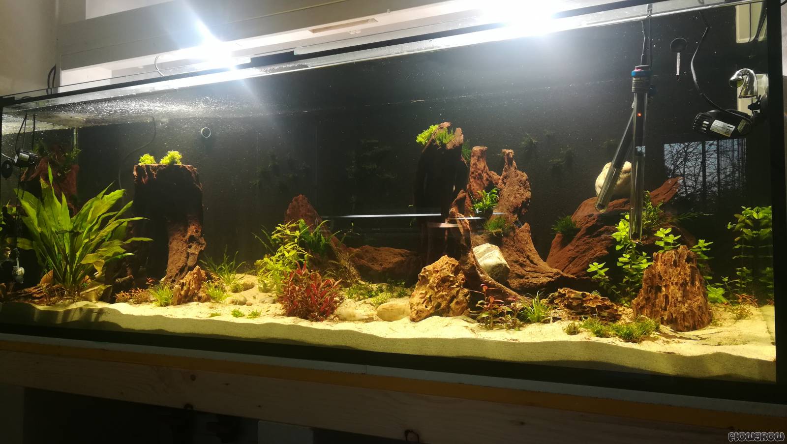 02.01.20 - Einrichtung Abgeschlossen! 130kg Sand und viele Steine bilden den Bodengrund. Derweil läuft das Aquarium filterlos mit ausschließlich 3 Strömungspumpen.