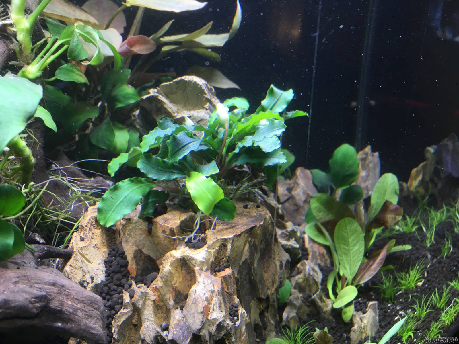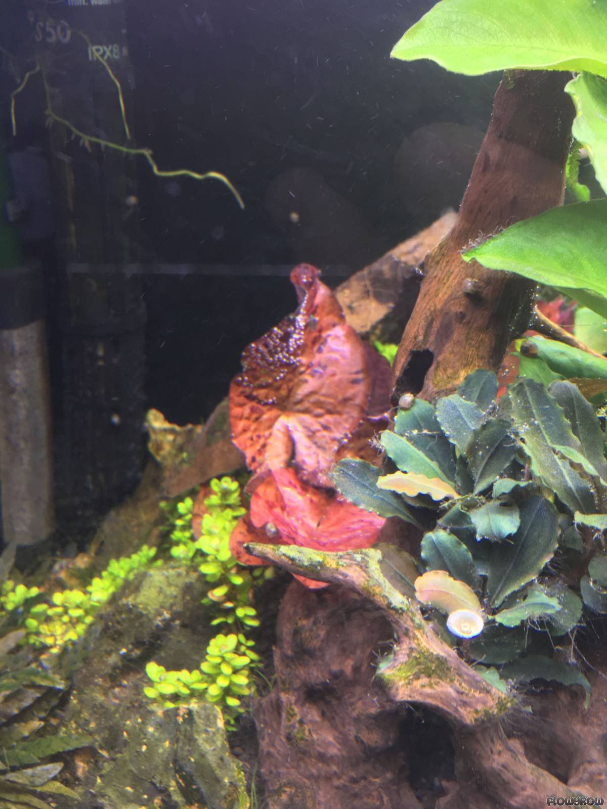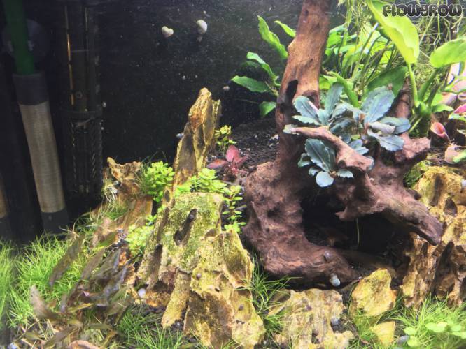 Von den Anubias habe ich ein paar rausgenommen, als ich die Strömungspumpe wieder in Betrieb genommen hatte. Dafür sind paar neue Pflanzen nachgerückt. Unter anderen "Echte" Rotala - Rotala indica, Roter Tigerlotus - Nymphaea lotus rubra, Bucephalandra sp. "Red".
