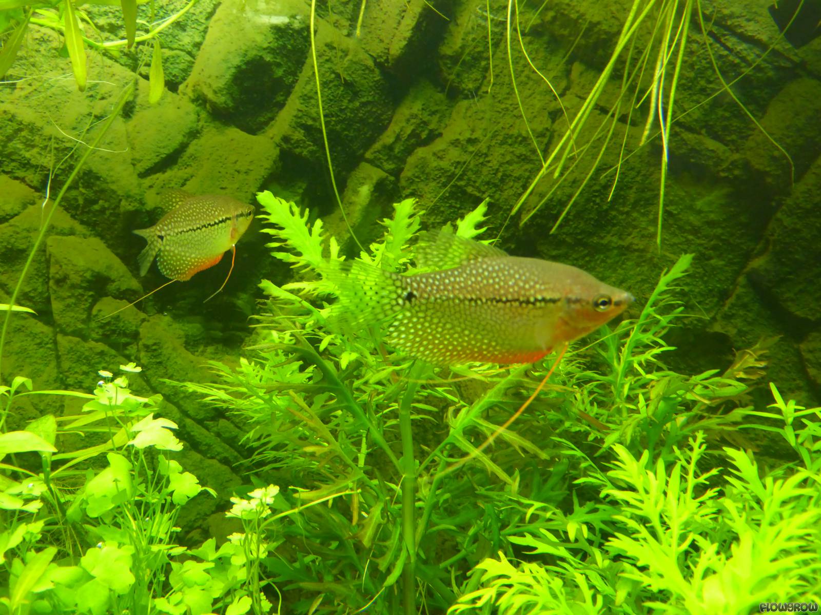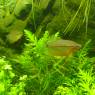 Bei der Wahl der Fische habe ich einerseits auf die Herkunft und andererseits auf die Farbe der Tiere geachtet, denn die Rotala und die Cryptocorne sind bräunlich gefärbt und dies sollte sich in den Fischen widergespiegeln. Daher habe ich mich für Espes Keilfleckbärbling als Hauptgruppenfisch und die Mosaikfadenfische als etwas größere Tiere entschieden. Die Garra-Art dient hauptsächlich der Algenbekämpfung, obwohl diese bisher noch sehr gering ausfällt. Weiterhin gibt es nicht viele Welse aus Asien, worauf ich relativ schnell auf dieses Prachtexemplar gestoßen bin.