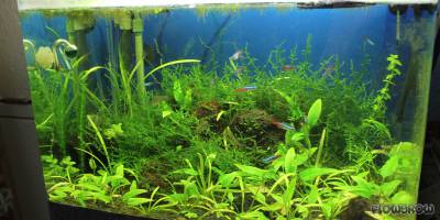 Seit August sind nun 5 uralte Sternflecksalmler und 9 Neonsalmler als Besatz drinnen.
