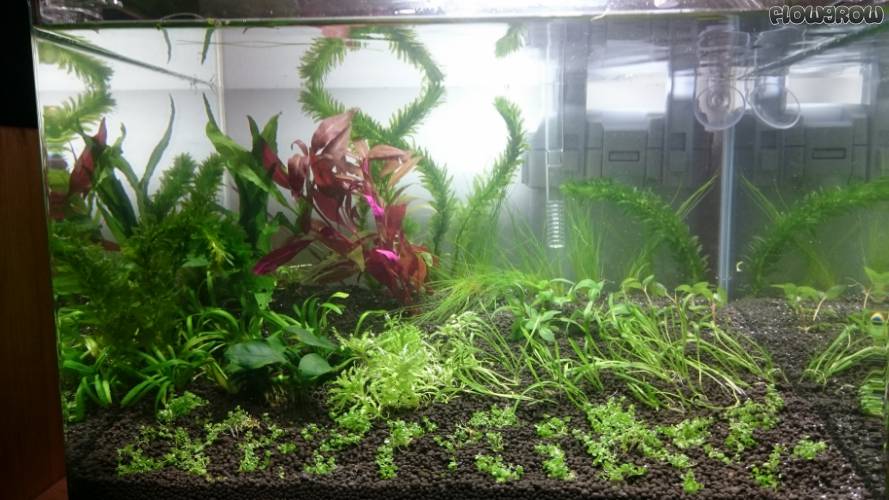 Dennerle Scapers Tank, mit allem, was sie dazu geben (Licht, Filter). Weil ich einen Umzug plane, habe ich entschieden erstmal ohne Steine, nur mit Boden und Pflanzen zu anfangen. So kann ich einfacher umbauen, neu gestalten nach dem Umzug. Und ich kann Erfahrungen sammeln mit verschiedenen Pflanzen. Ich mag selber ausprobieren, wie sie sich verhalten, wie sie auf die verschiedene Behandlungen reagieren. So habe ich mehrere Pflanzen, was ich schon lange halten wollte, gekauft, und reingepflanzen. Erst wollte ich keine Tiere, aber ich konnte mich nicht zurückhalten, jetzt habe ich Garnelen und Fische auch.