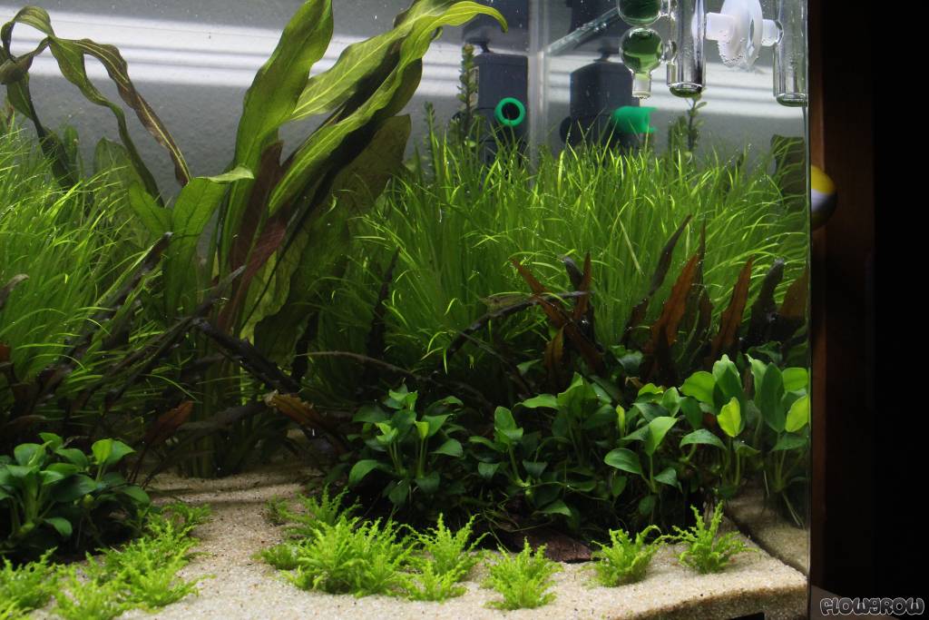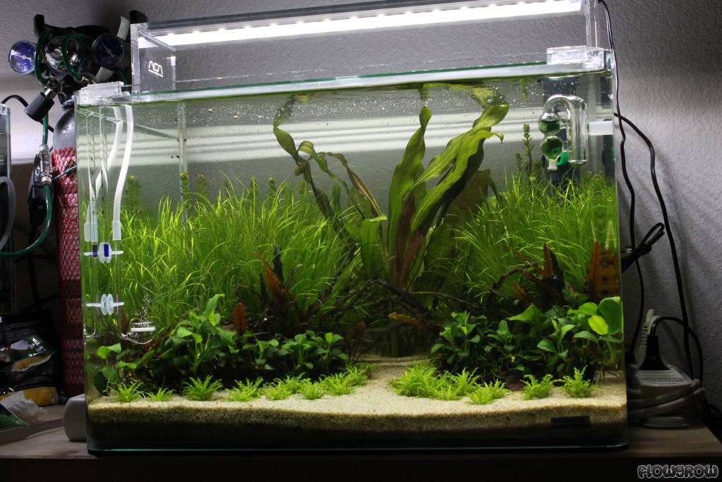 Das Becken ist das 50l "Scaper's Tank" von Dennerle und das Wasser wird nur mit einer Strömungspumpe umgerührt (Geringfilterung). CO2 aufgrund Starklicht vorhanden.