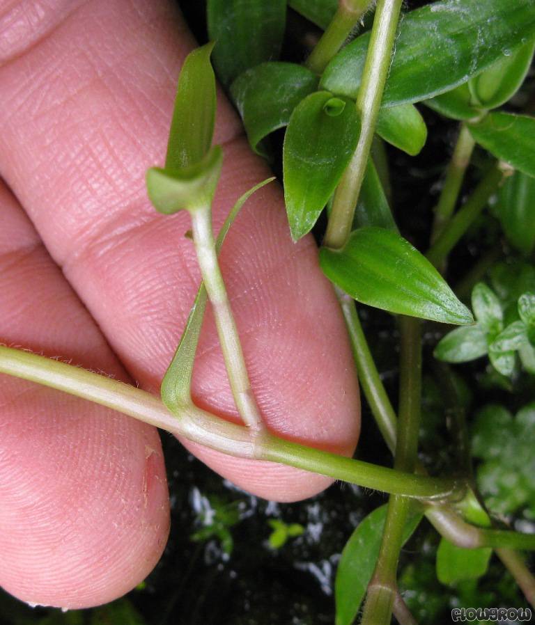 Cyanotis sp. is a relatively fast-growing marsh plant with a creeping growth habit. However, when cultivated submersed it is a relatively slow grower and forms distinctly smaller, shorter leaves on upright, straight stems. It resembles Murdannia keisak (which also belongs to the Commelinaceae family), but stays smaller and more delicate in its submersed as well as in its emersed form. The somewhat succulent leaves are lanceolate and grow alternating in two rows.