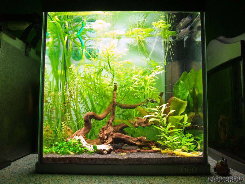 Das Becken war eigentlich nur übergangsweise geplant im Rahmen eines Umzugs. Da es nun einmal da stand, blieb es (natürlich) doch, und beherbergt nun Yellow Fire Garnelen. Das Interessante, für mich, an diesem Aquarium: Es ist wirklich knapp beleuchtet (nach Scaper-Standards) und dazu noch hoch und schmal. Dennoch ist es möglich, es mit der passenden Pflanzenwahl und etwas Bio-CO2 schön grün werden zu lassen.
