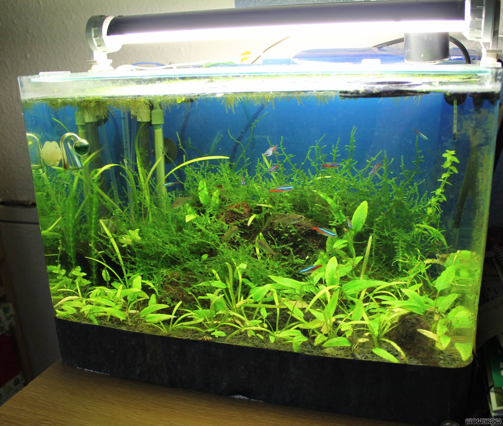 Seit August sind nun 5 uralte Sternflecksalmler und 9 Neonsalmler als Besatz drinnen.