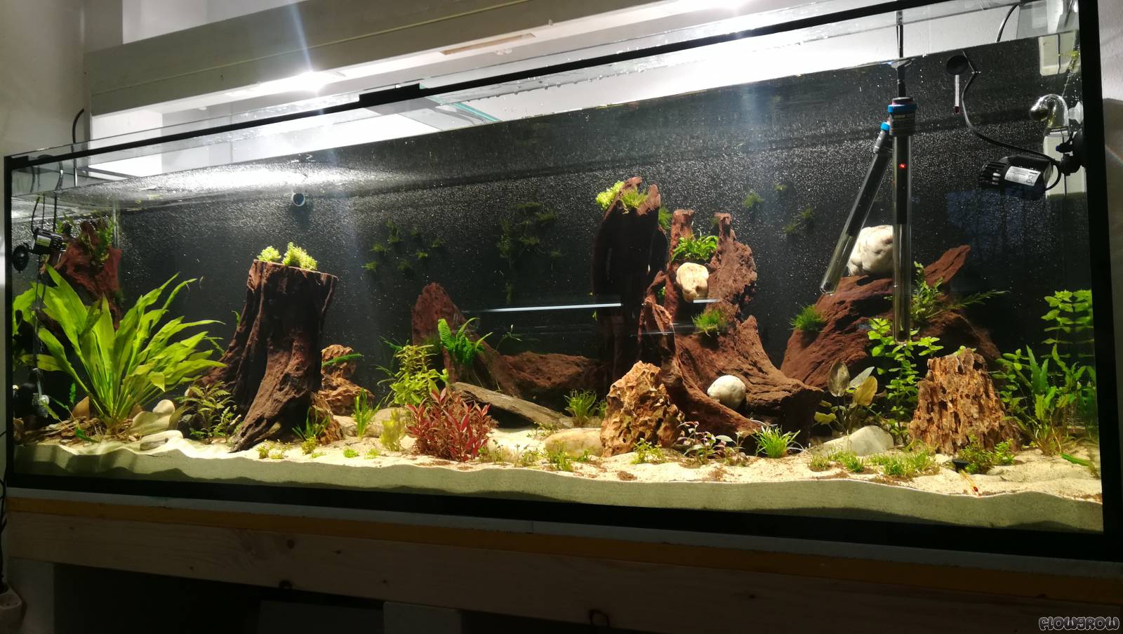 02.01.20 - Einrichtung Abgeschlossen! 130kg Sand und viele Steine bilden den Bodengrund. Derweil läuft das Aquarium filterlos mit ausschließlich 3 Strömungspumpen.