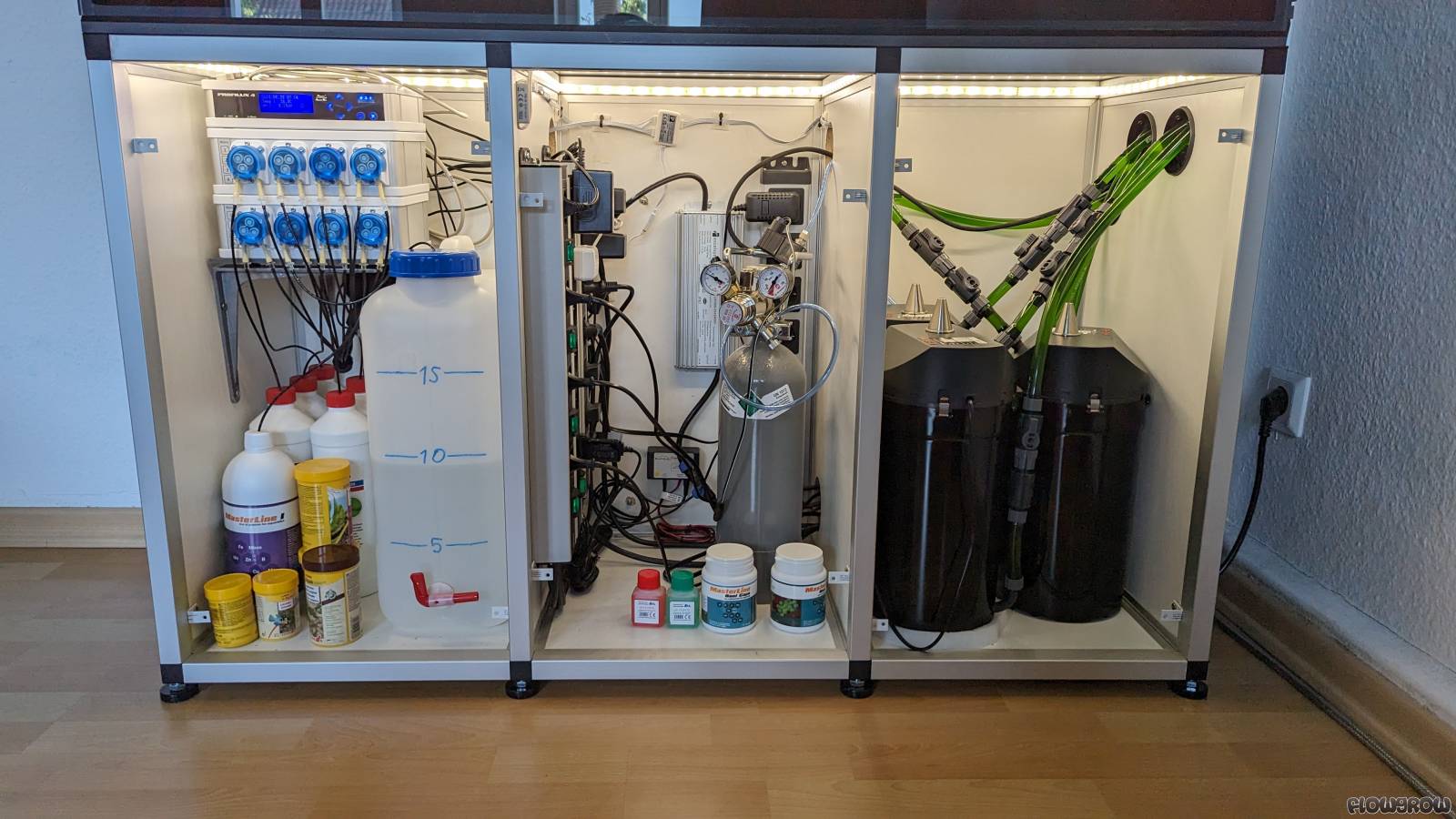 - automatische Wasserauffüllung (ca. 0,6 Liter pro Tag mittels Tunze Turbelle High Jet),