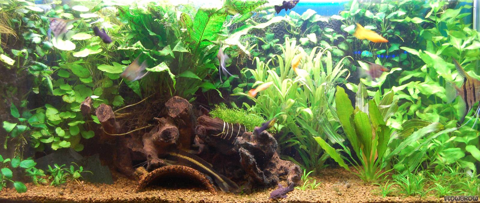 Becken beherbergt seit 22 Jahren einen Liniendornwels sowie wechselnde Skalare. Gesamte Bepflanzung muss mit diesem Besatz vereinbar sein, daher keine feinfiedrigen Pflanzen.