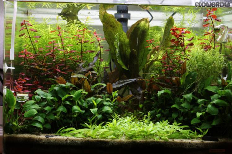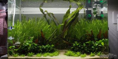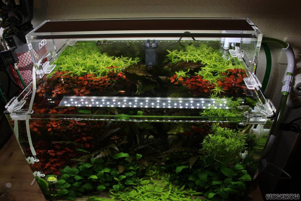 Das Becken ist das 50l "Scaper's Tank" von Dennerle und das Wasser wird nur mit einer Strömungspumpe umgerührt (Geringfilterung). CO2 aufgrund Starklicht vorhanden.