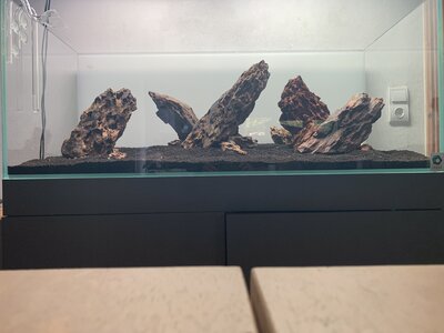 Das Hardscape ist jetzt erstmal grob eingerichtet. Es folgen noch 2 Säcke soil um einen höheren Anstieg hinzubekommen.