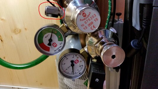 Kannst Du bitte gucken, was auf dem Überdruckventil Deines Druckminderers steht? Das ist das sechskantige Teil rechts neben dem Flaschdruckmanometer.