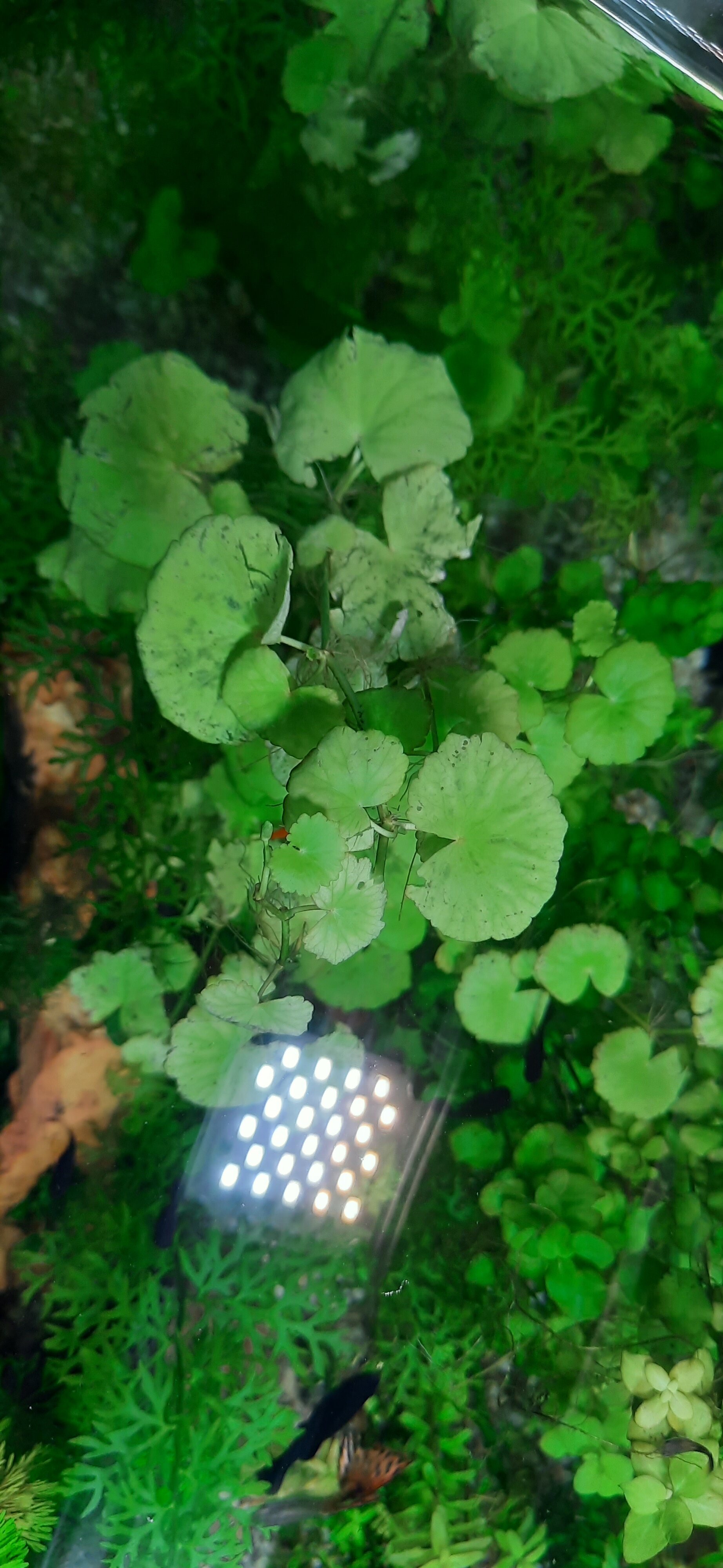 Die Limnophila sessiliflora wächst fröhlich und bekommt schöne rötliche Köpfe, die Cryptocoryne crispatula scheint sich an ihrer neuen Stelle auch wohl zu fühlen, ich vermute mal sie macht dann einen Sprung, wenn sie mit den Wurzeln in den Bodengrunddünger kommt. Der Hydrocotyle tripartita eskaliert im Vordergrund und als Filterbegrünung.