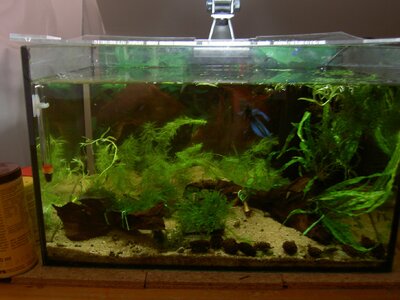 eigentlich noch ein Betta spendlens Bock, der sitzt allerdings momentan alleine im 54er Becken, da er mir zu sehr an die Garnelen gegangen ist. Er darf wieder rein wenns dichter bewachsen ist.