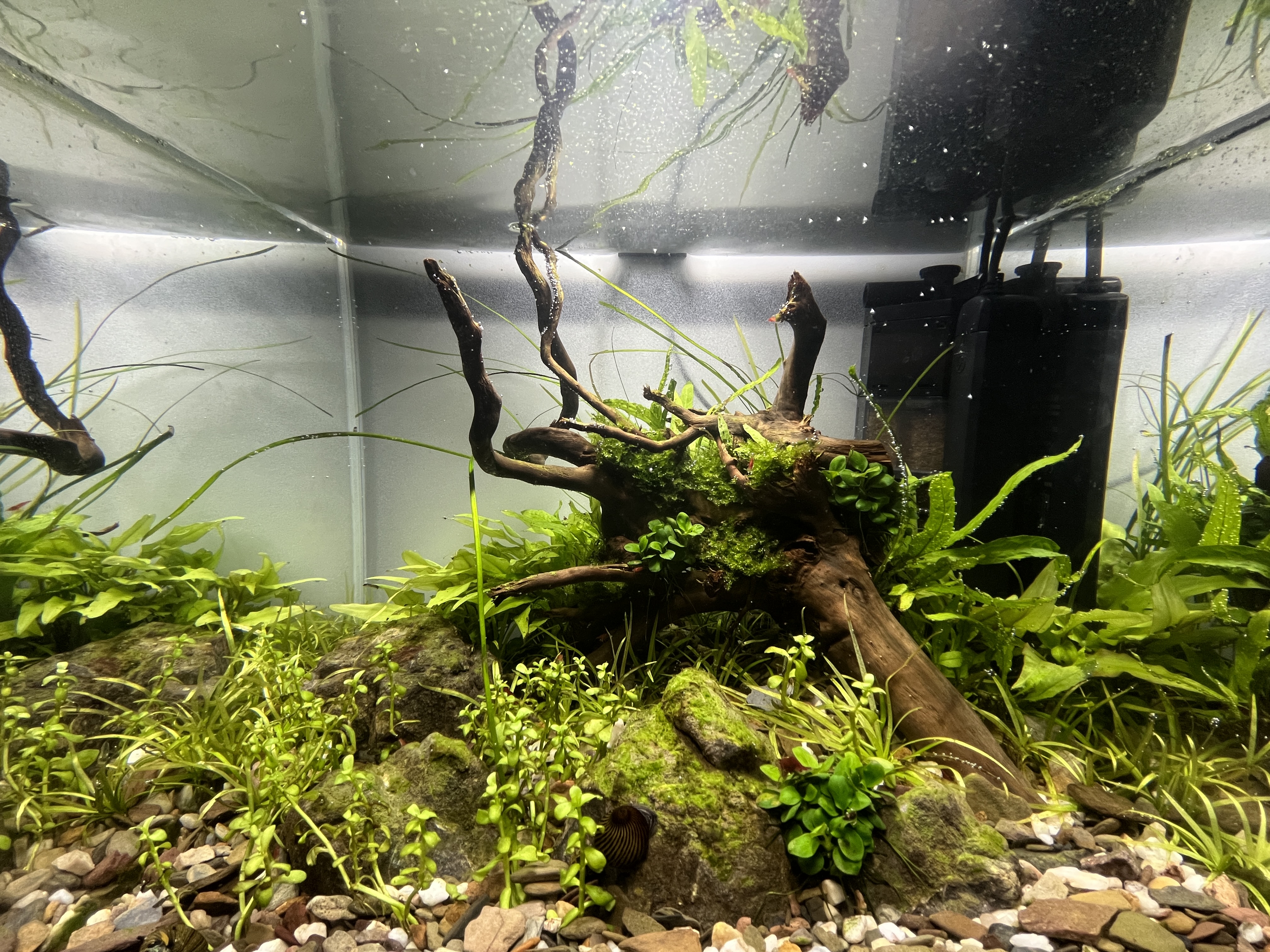 Pflanzen waren nicht von Anfang an alle drin und es kommen auch jetzt noch mehr dazu. Besatz sind 2x Geweihschnecken 2x Zebrarennschnecken und