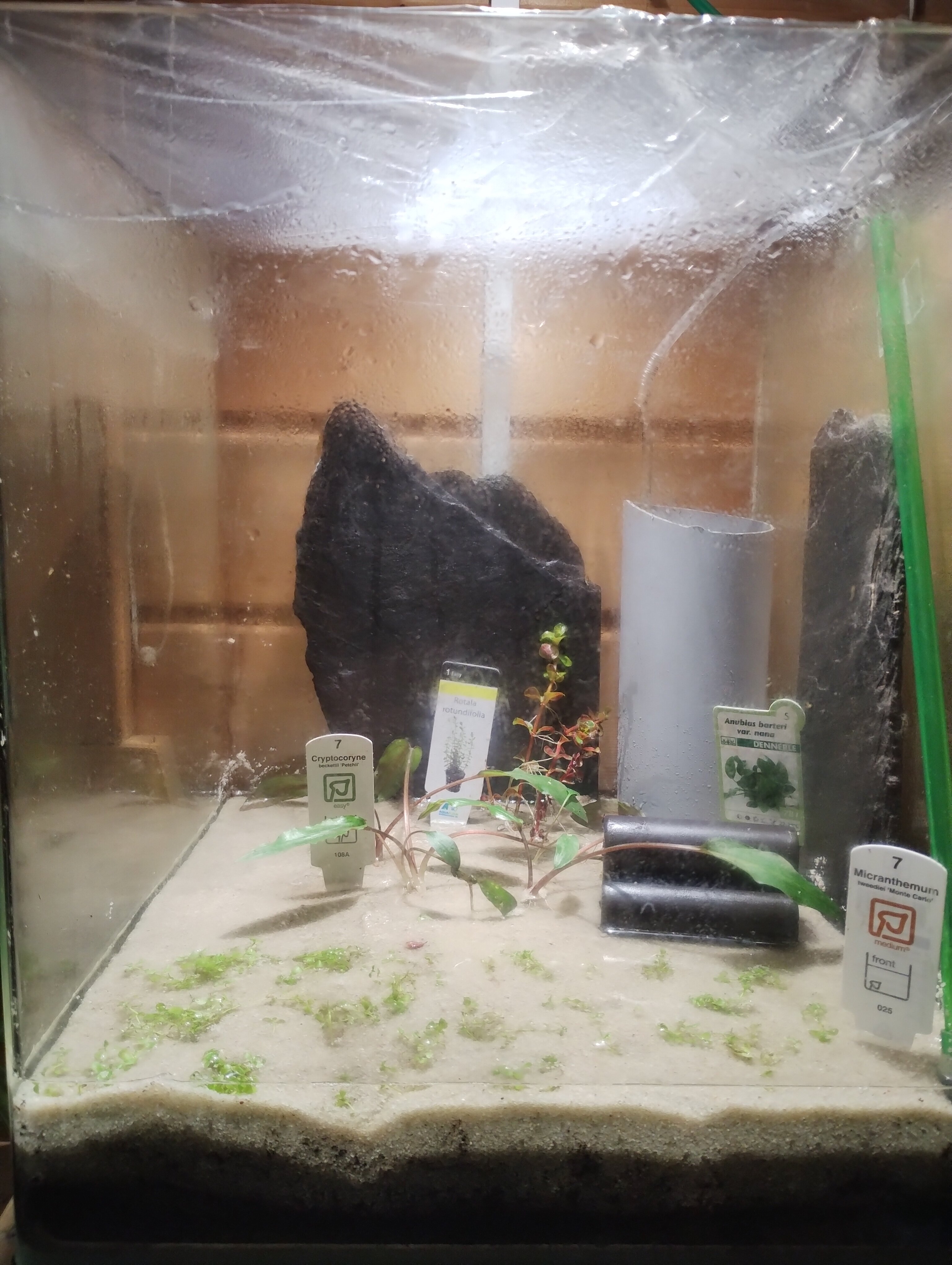 Ich würde dann das MMC eher noch an der Frontscheibe (wie gesagt links auf dem Foto) entlang setzen, S. repens und die Flamingo jeweils rechts (vor die Keramikröhre) bzw. hinter C. beckettii "Petchii" - schauen wie es besser aussieht.