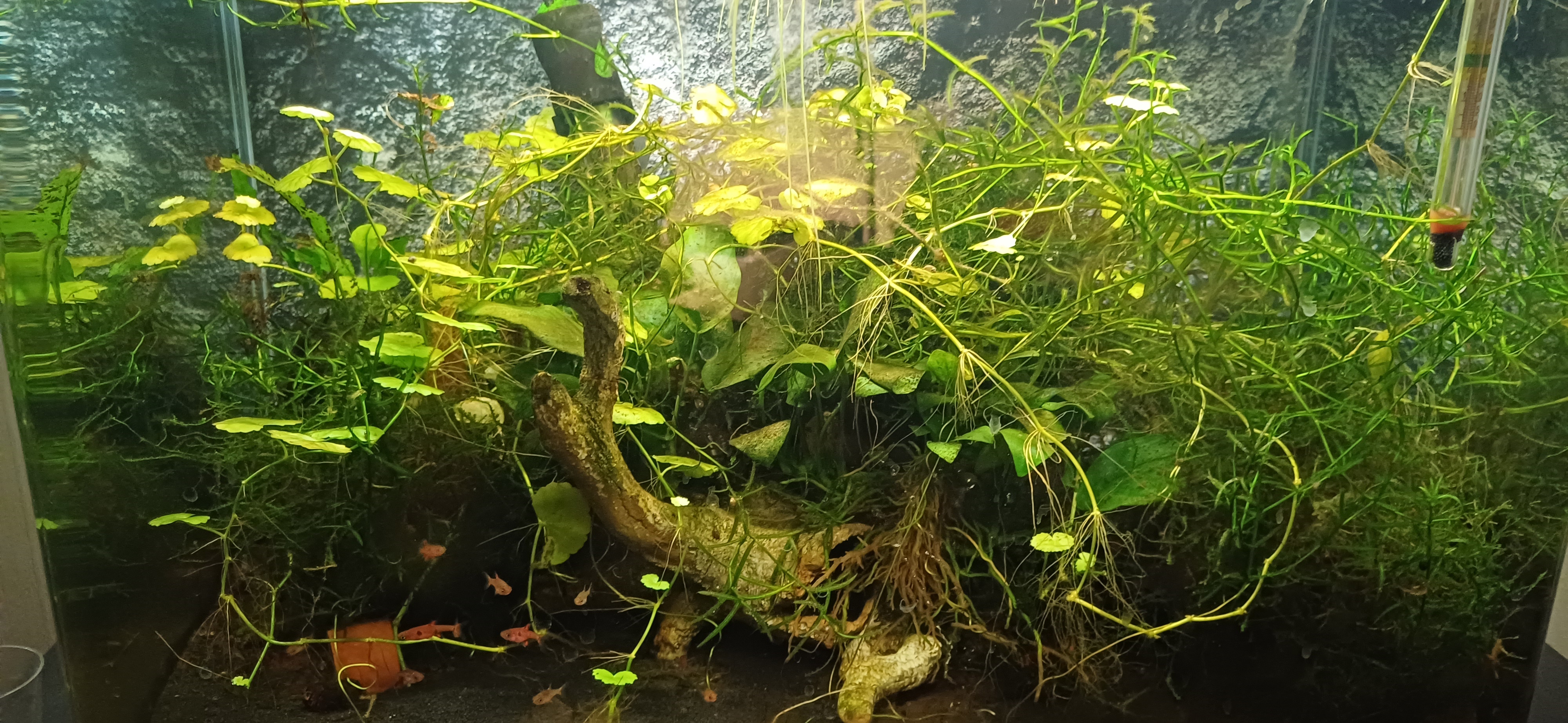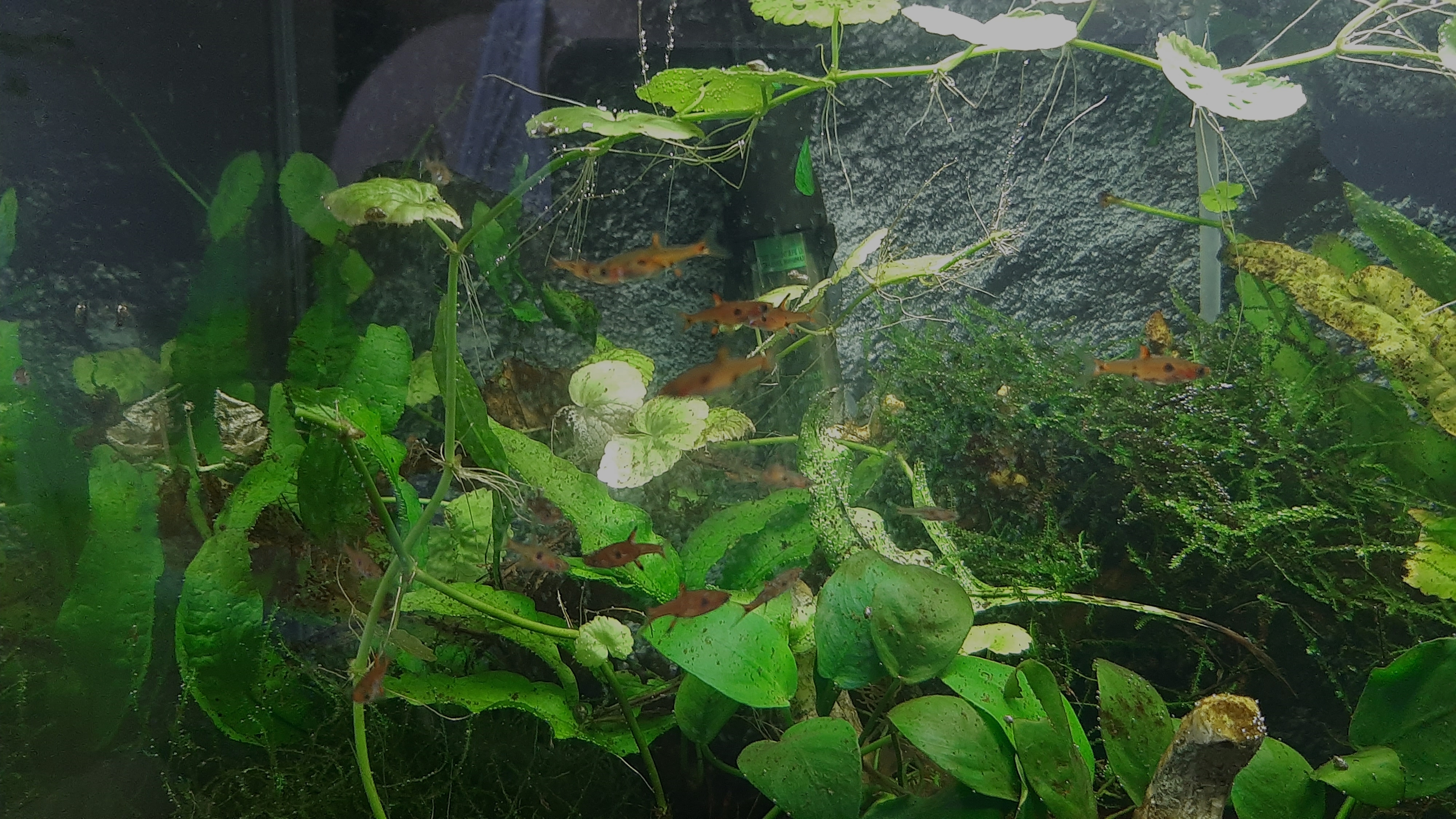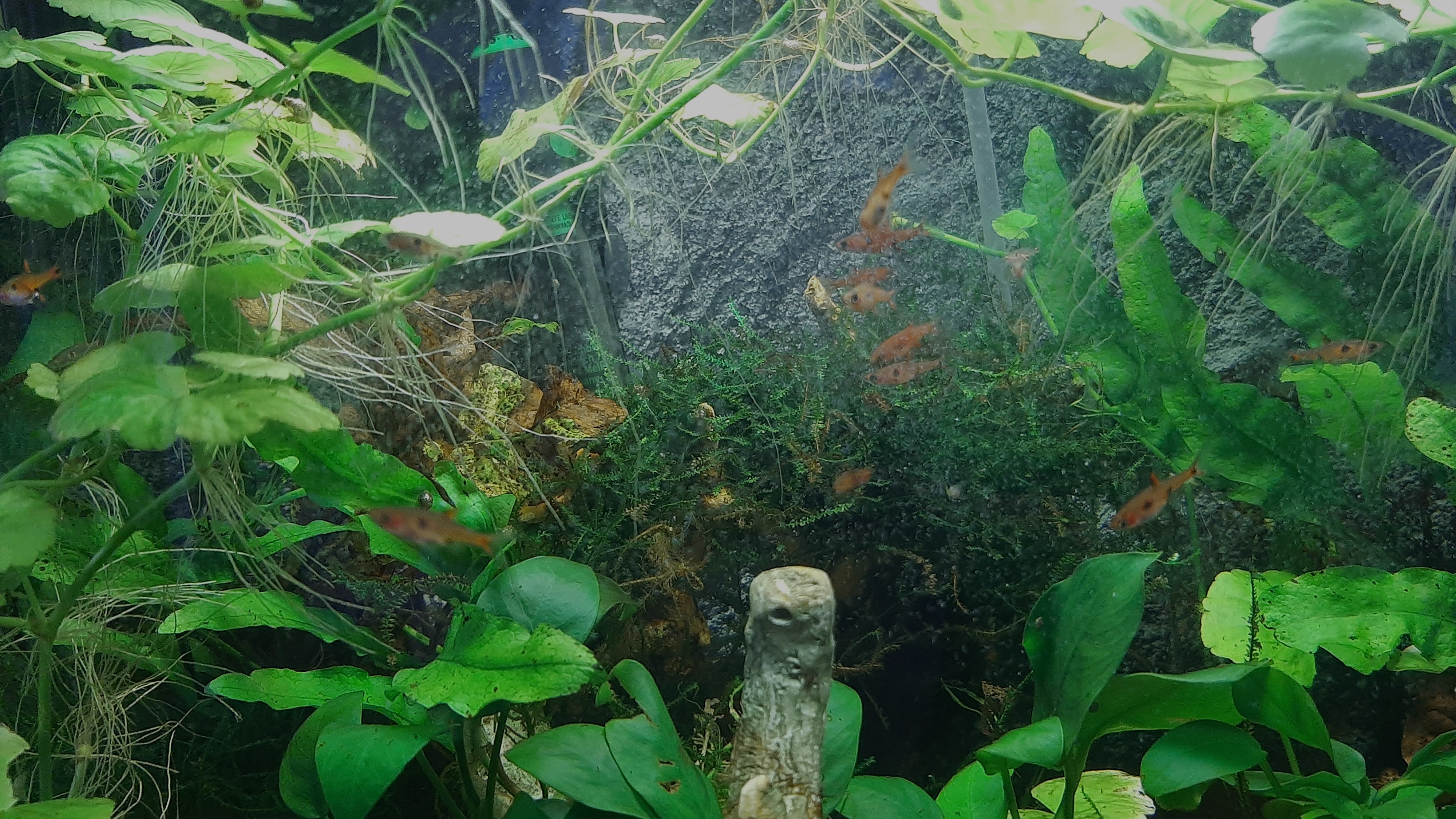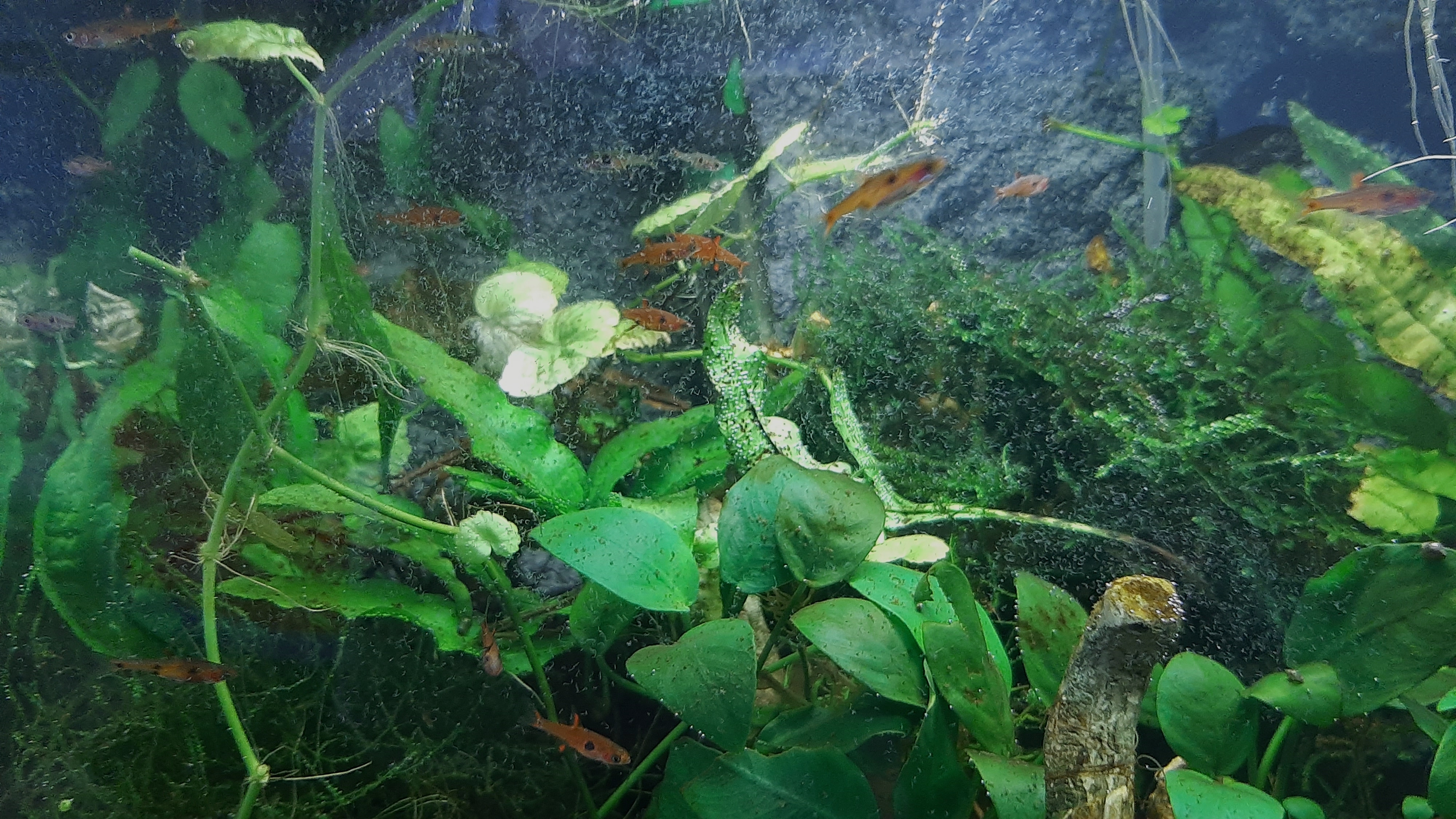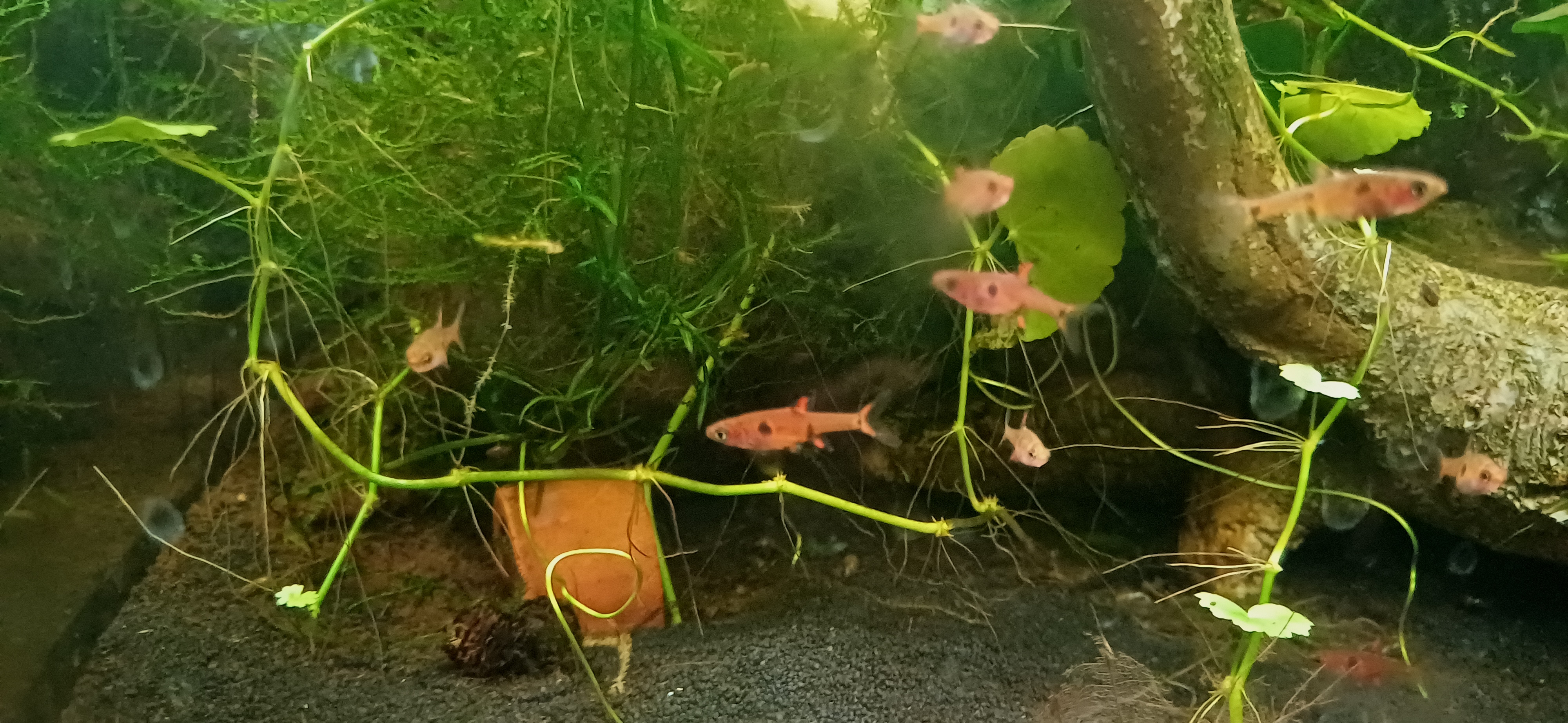 Im 38er ist ein weiterer Jungfisch aufgetaucht. Das nach langer Pause doch wieder Nachwuchs kommt freut mich doch sehr. Ich vermute mittlerweile als Ursache sowohl ein ppm = Verringerung des Pflanzendschungels als auch eine allmähliche Absenkung der Wasserhärte. Nachdem ich heute wieder mit Regenwasser aufgefüllt habe, ueigt das Messgerät derzeit 168ppm = 9,5°dH an. Der pH-Wert beträgt 9°.