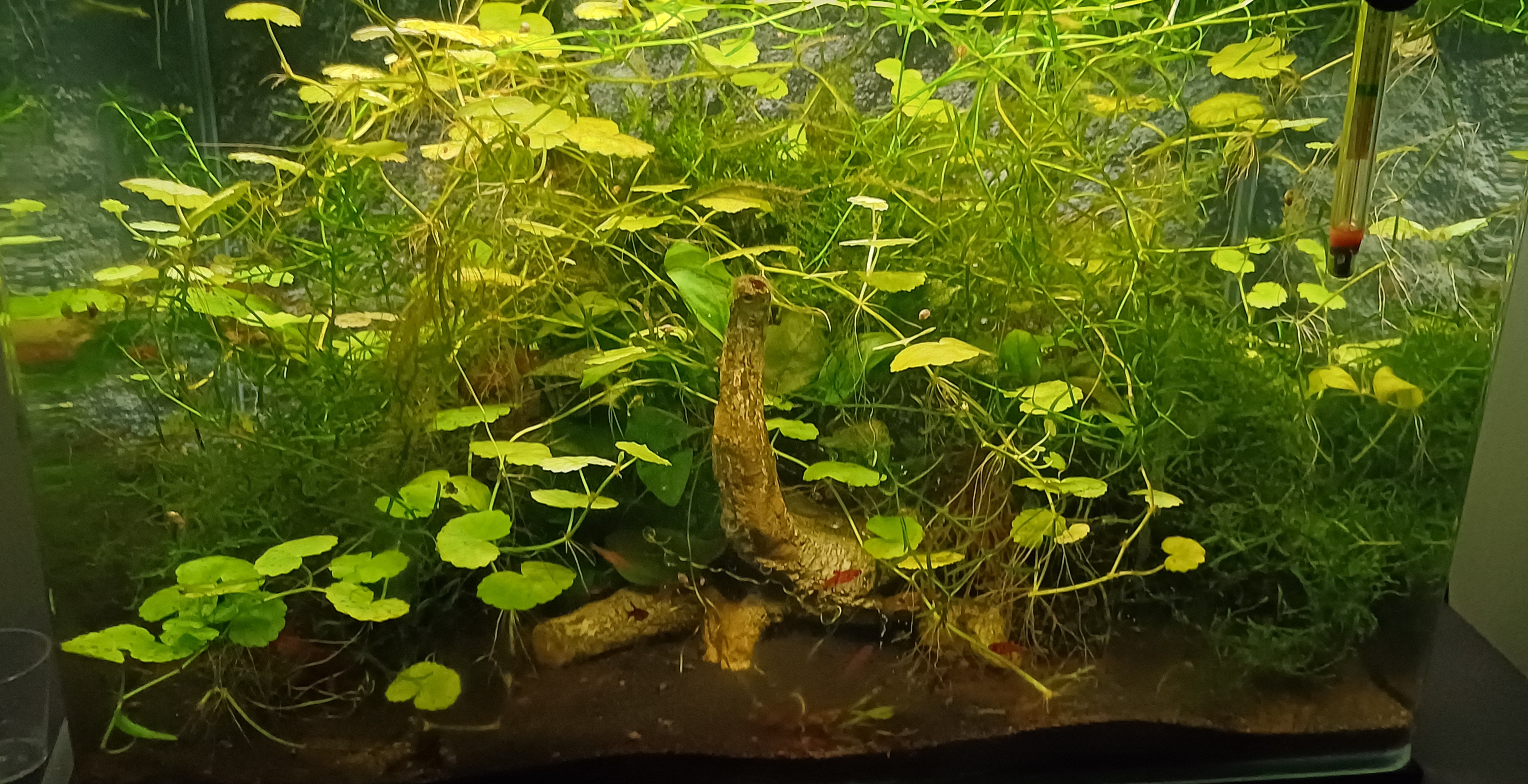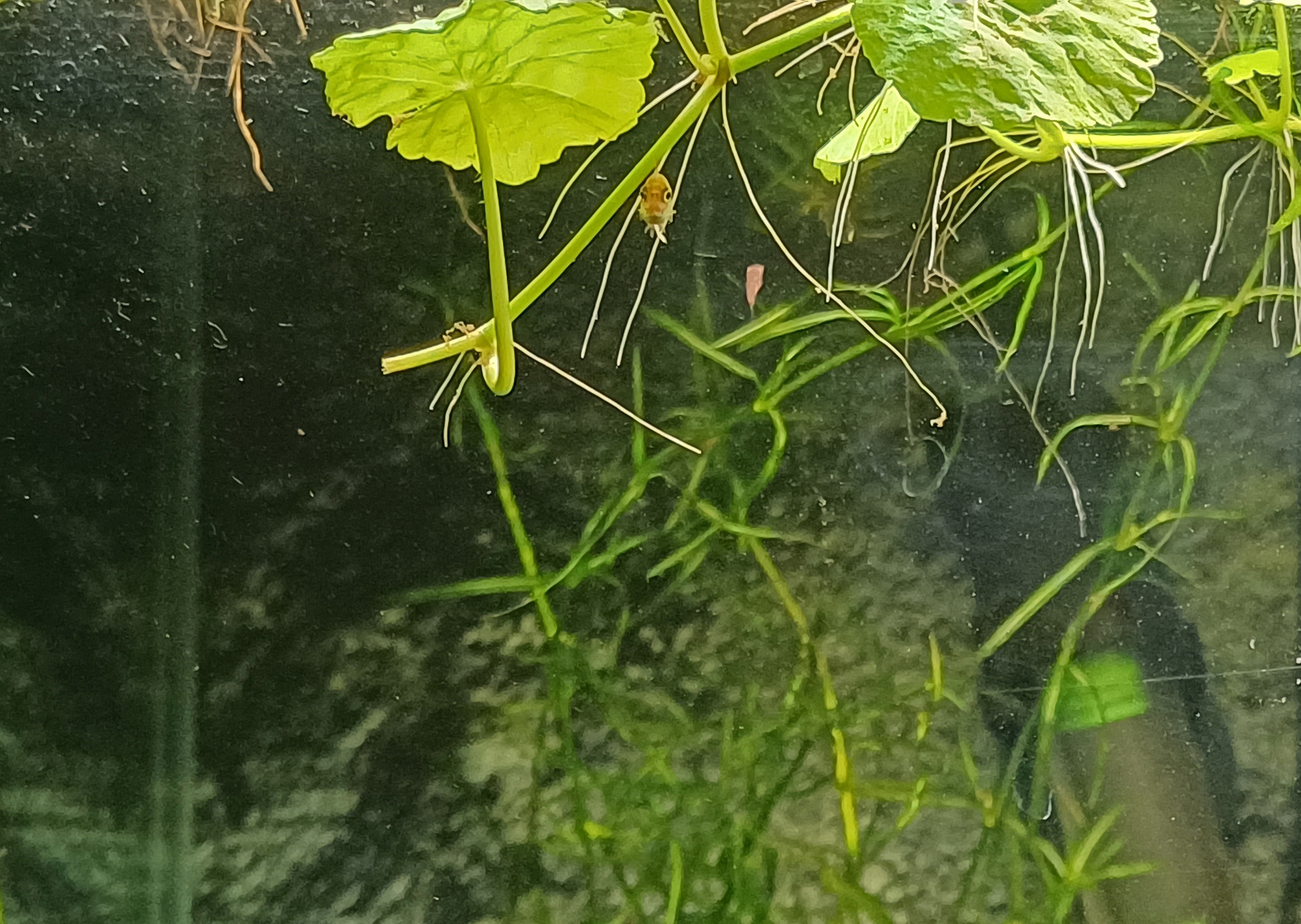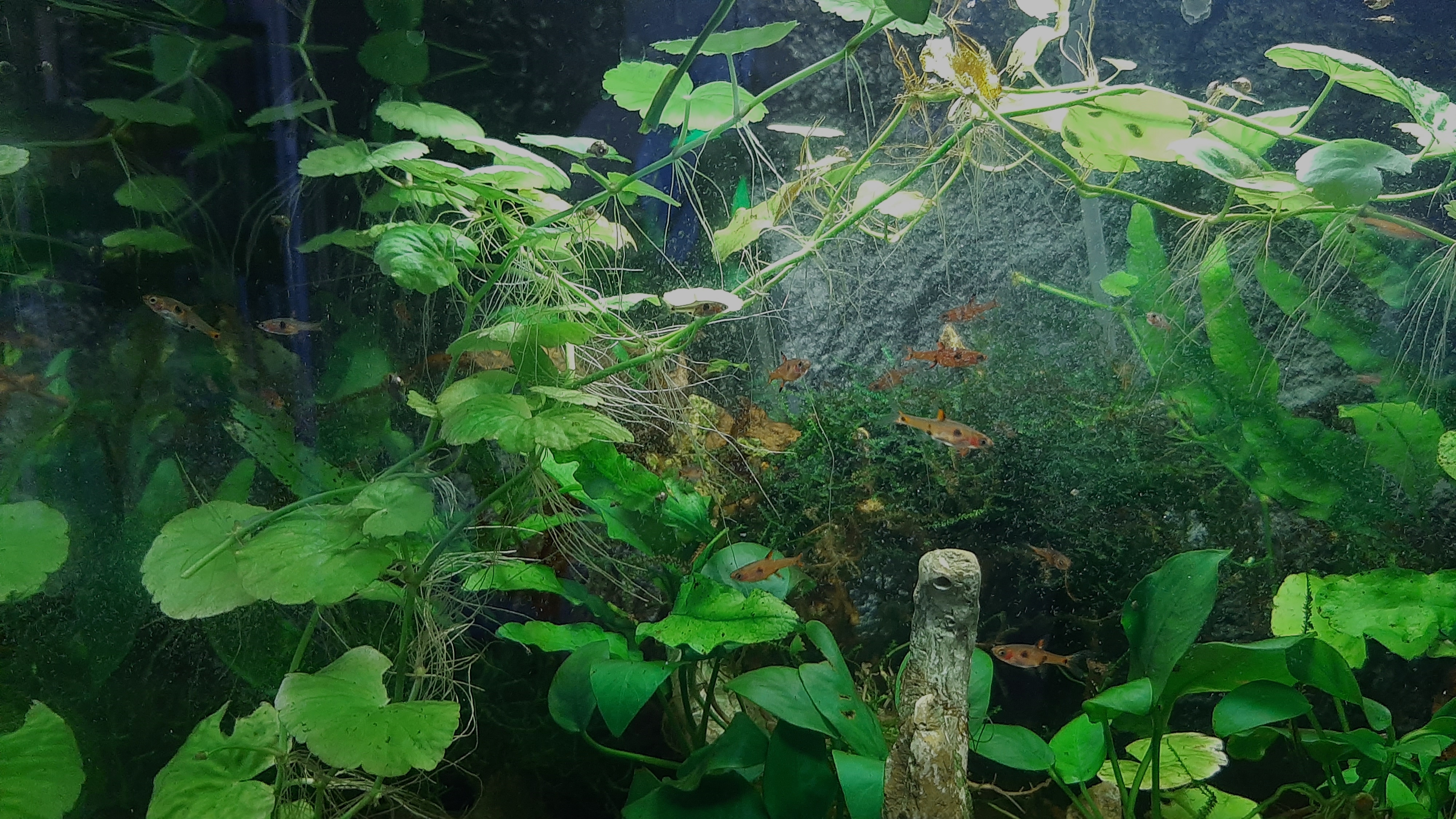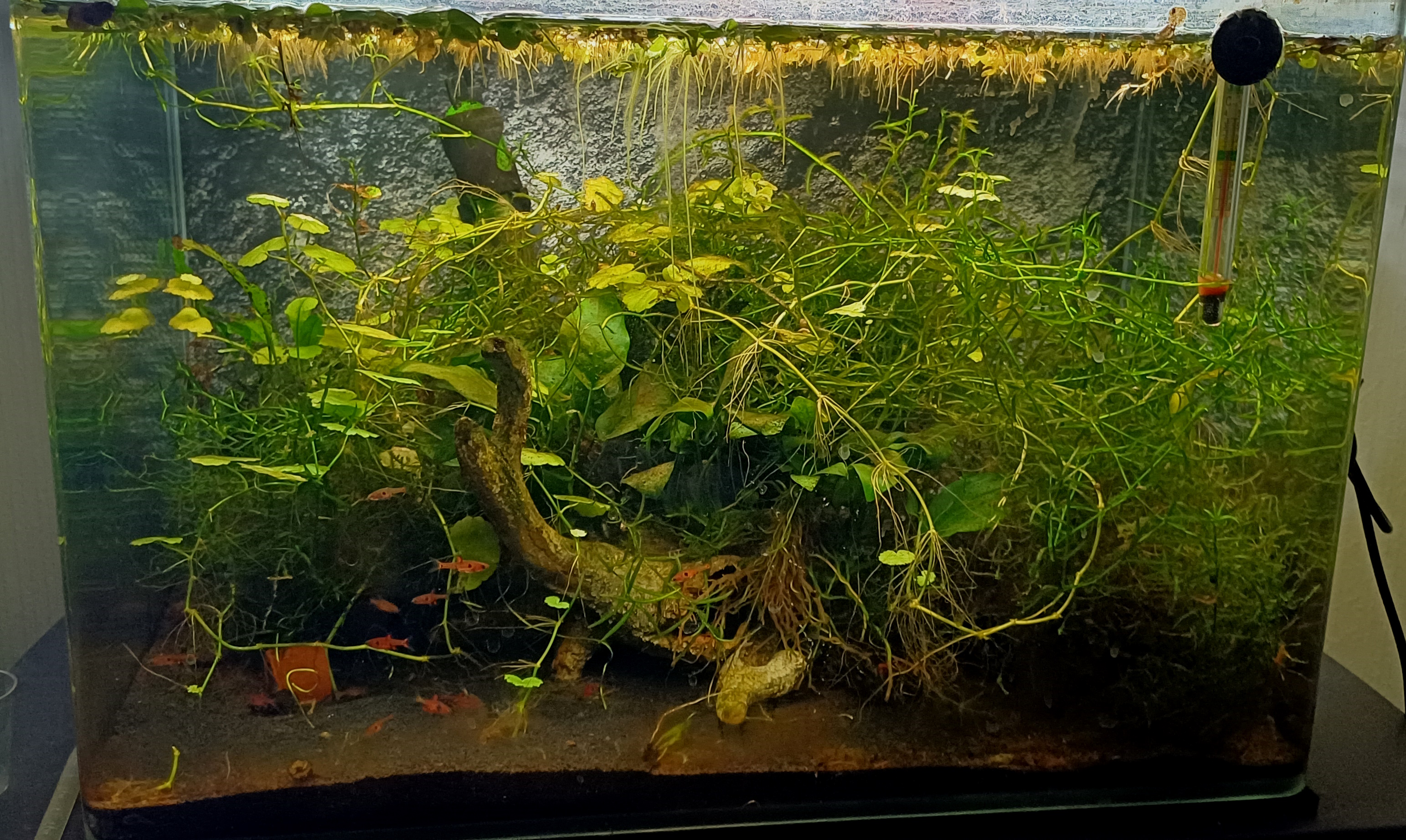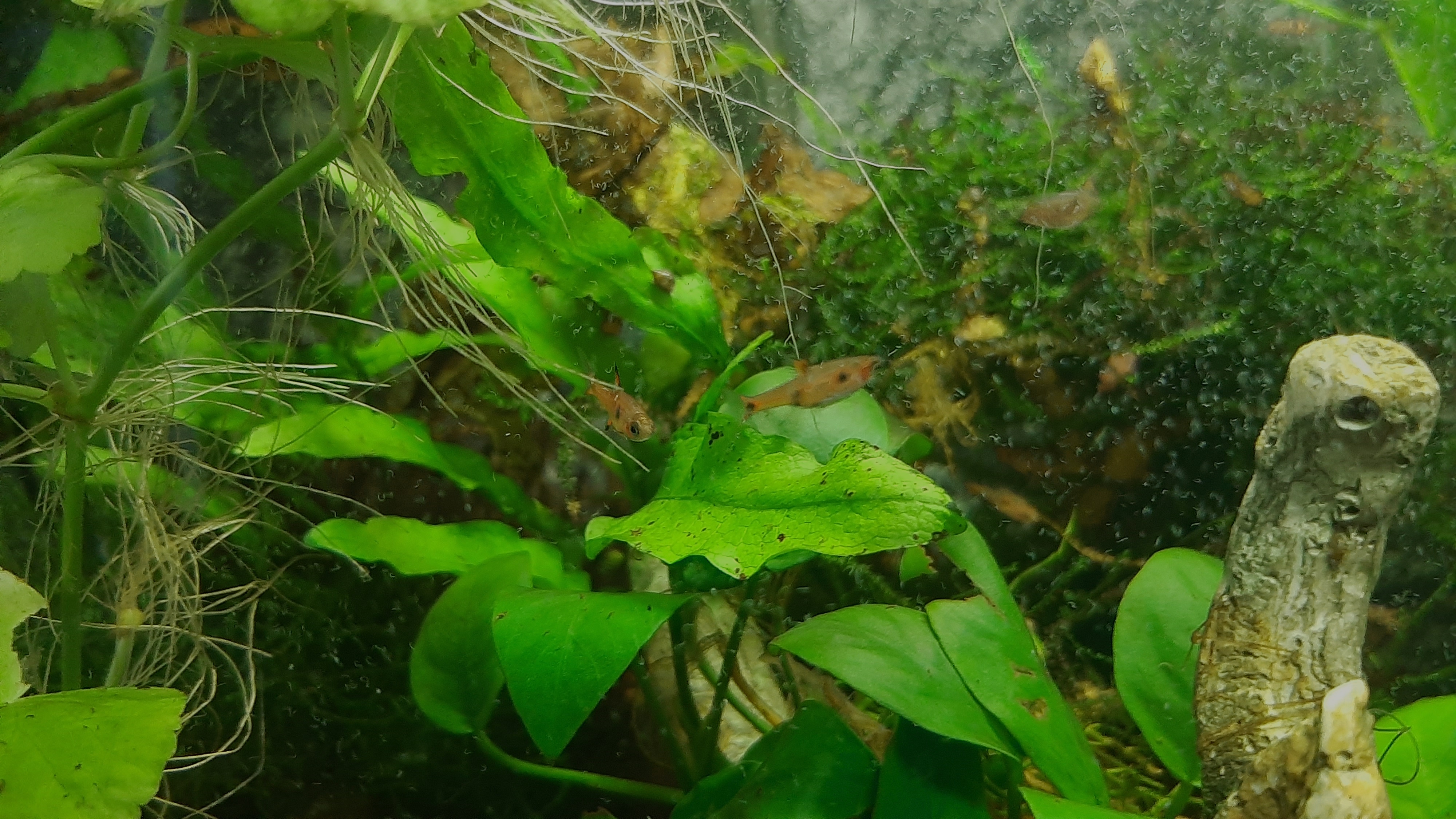 Im 38er ist ein weiterer Jungfisch aufgetaucht. Das nach langer Pause doch wieder Nachwuchs kommt freut mich doch sehr. Ich vermute mittlerweile als Ursache sowohl ein ppm = Verringerung des Pflanzendschungels als auch eine allmähliche Absenkung der Wasserhärte. Nachdem ich heute wieder mit Regenwasser aufgefüllt habe, ueigt das Messgerät derzeit 168ppm = 9,5°dH an. Der pH-Wert beträgt 9°.