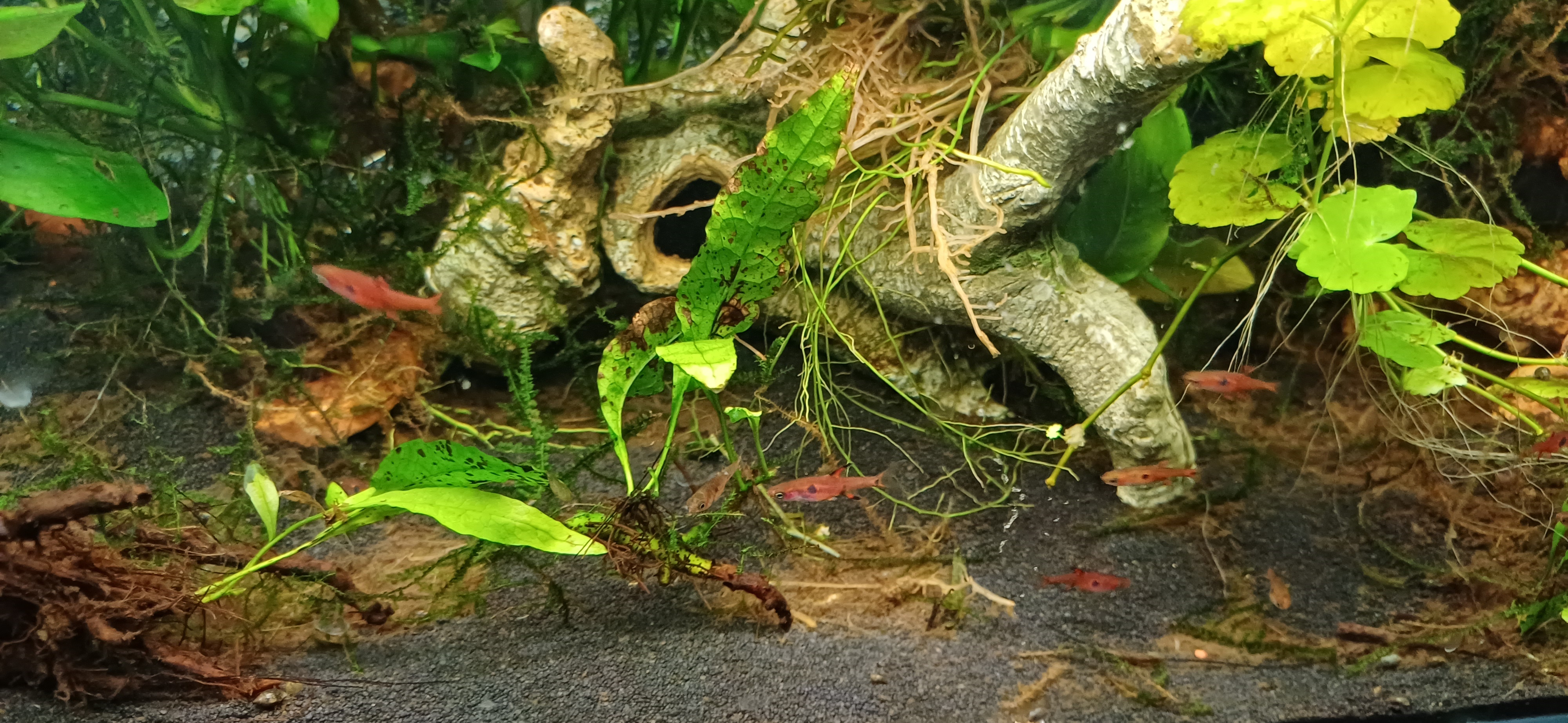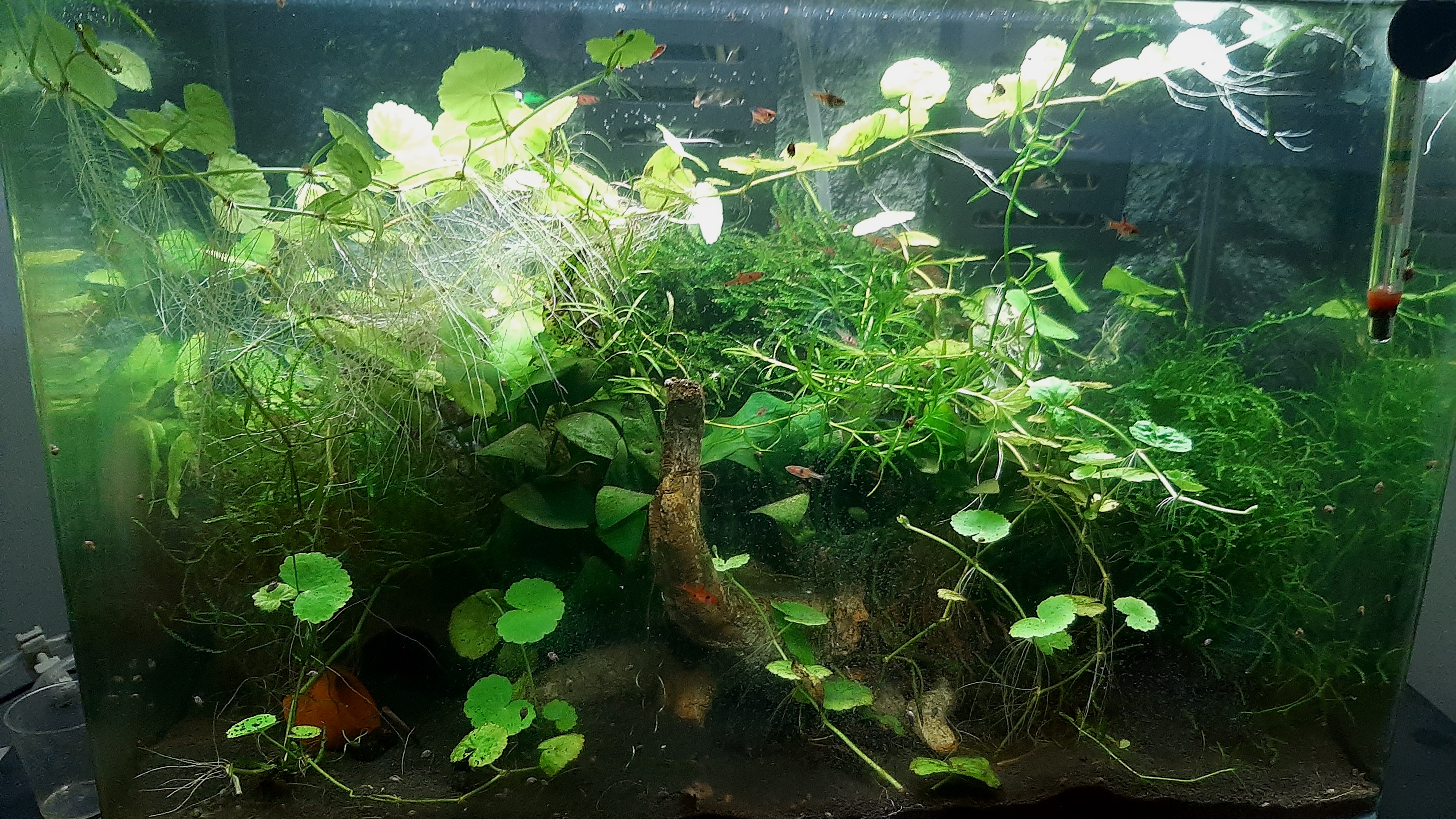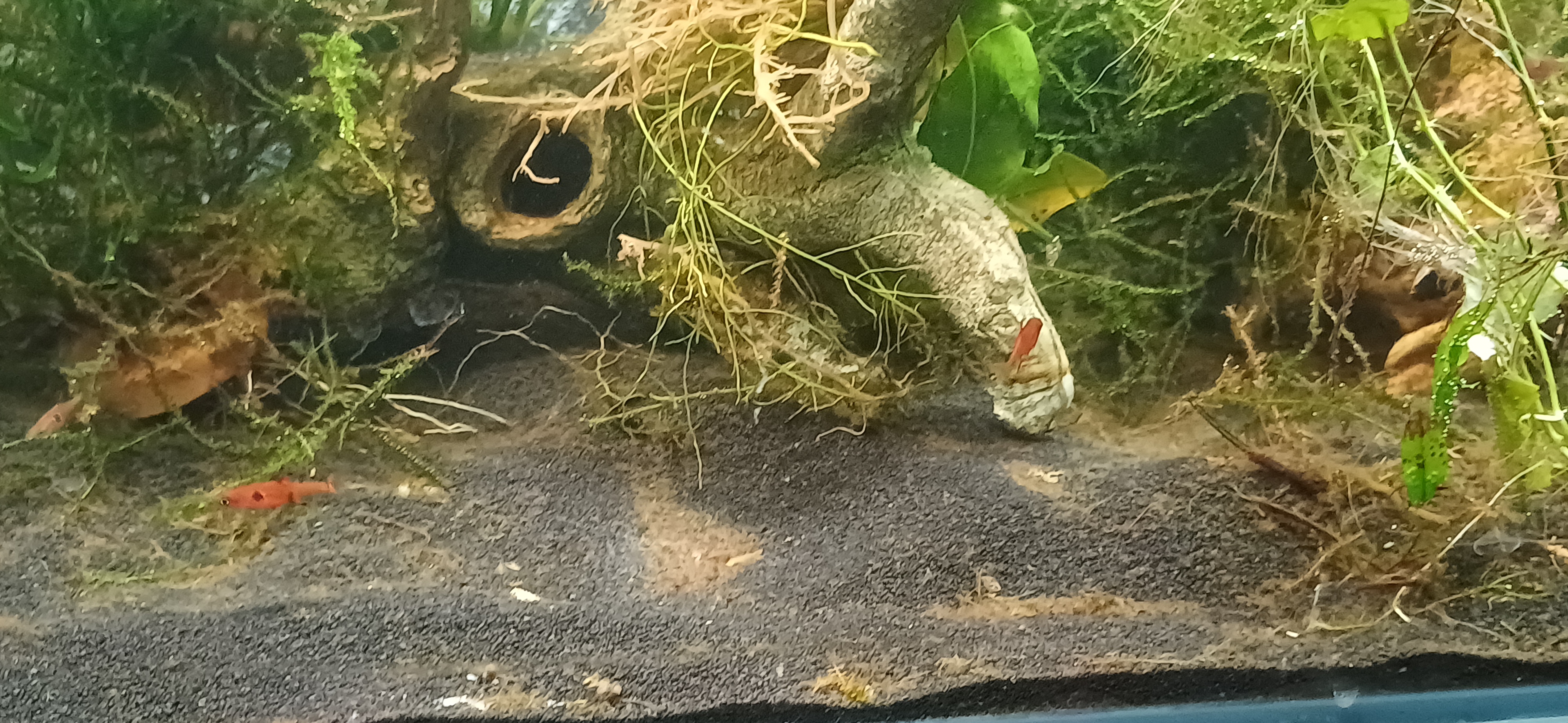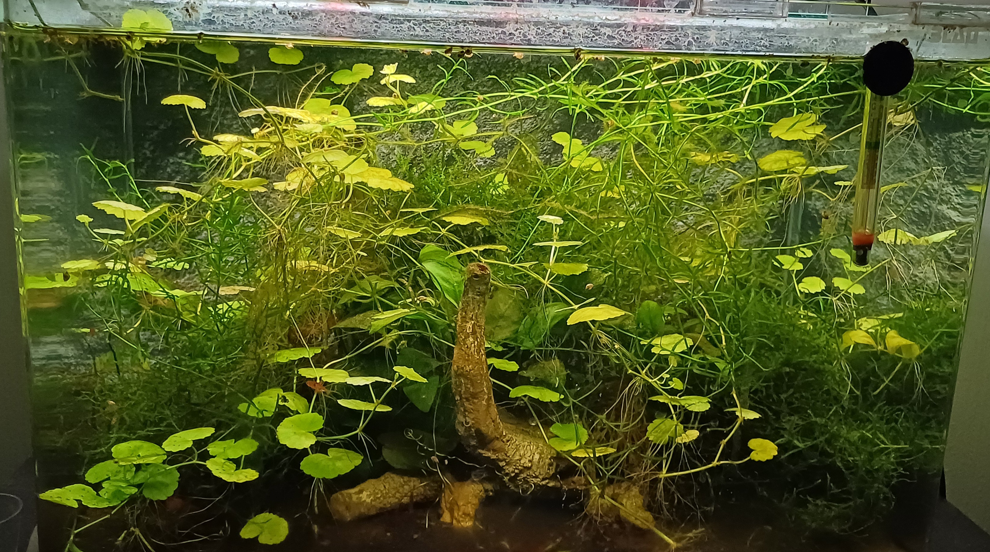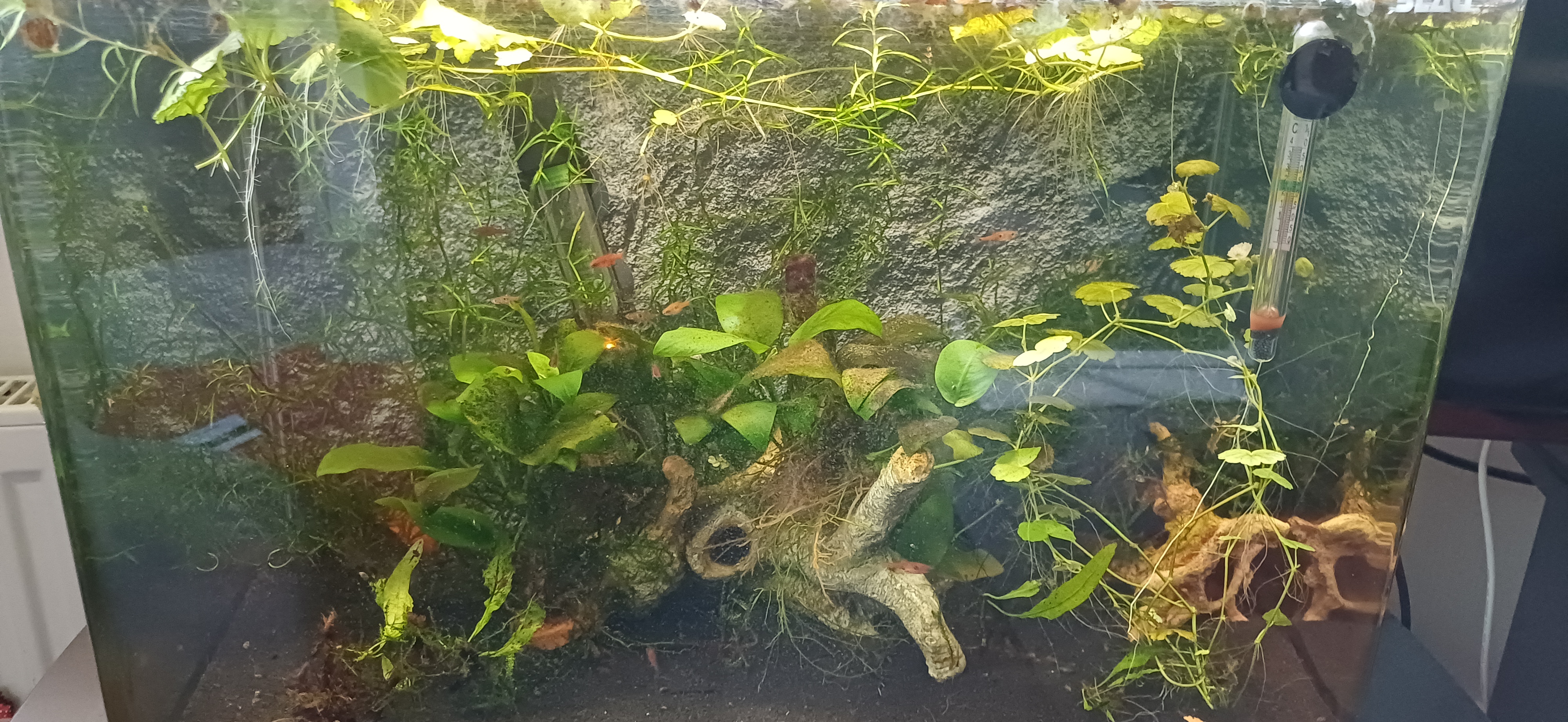 Im 38er ist ein weiterer Jungfisch aufgetaucht. Das nach langer Pause doch wieder Nachwuchs kommt freut mich doch sehr. Ich vermute mittlerweile als Ursache sowohl ein ppm = Verringerung des Pflanzendschungels als auch eine allmähliche Absenkung der Wasserhärte. Nachdem ich heute wieder mit Regenwasser aufgefüllt habe, ueigt das Messgerät derzeit 168ppm = 9,5°dH an. Der pH-Wert beträgt 9°.