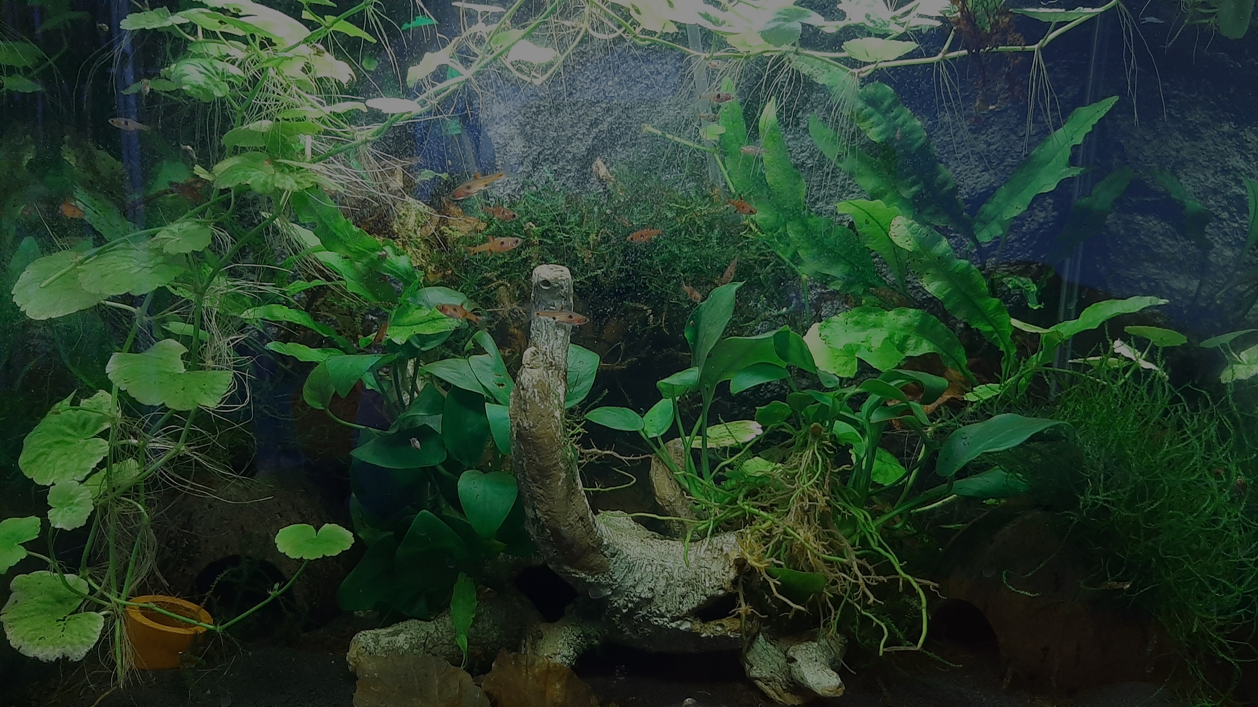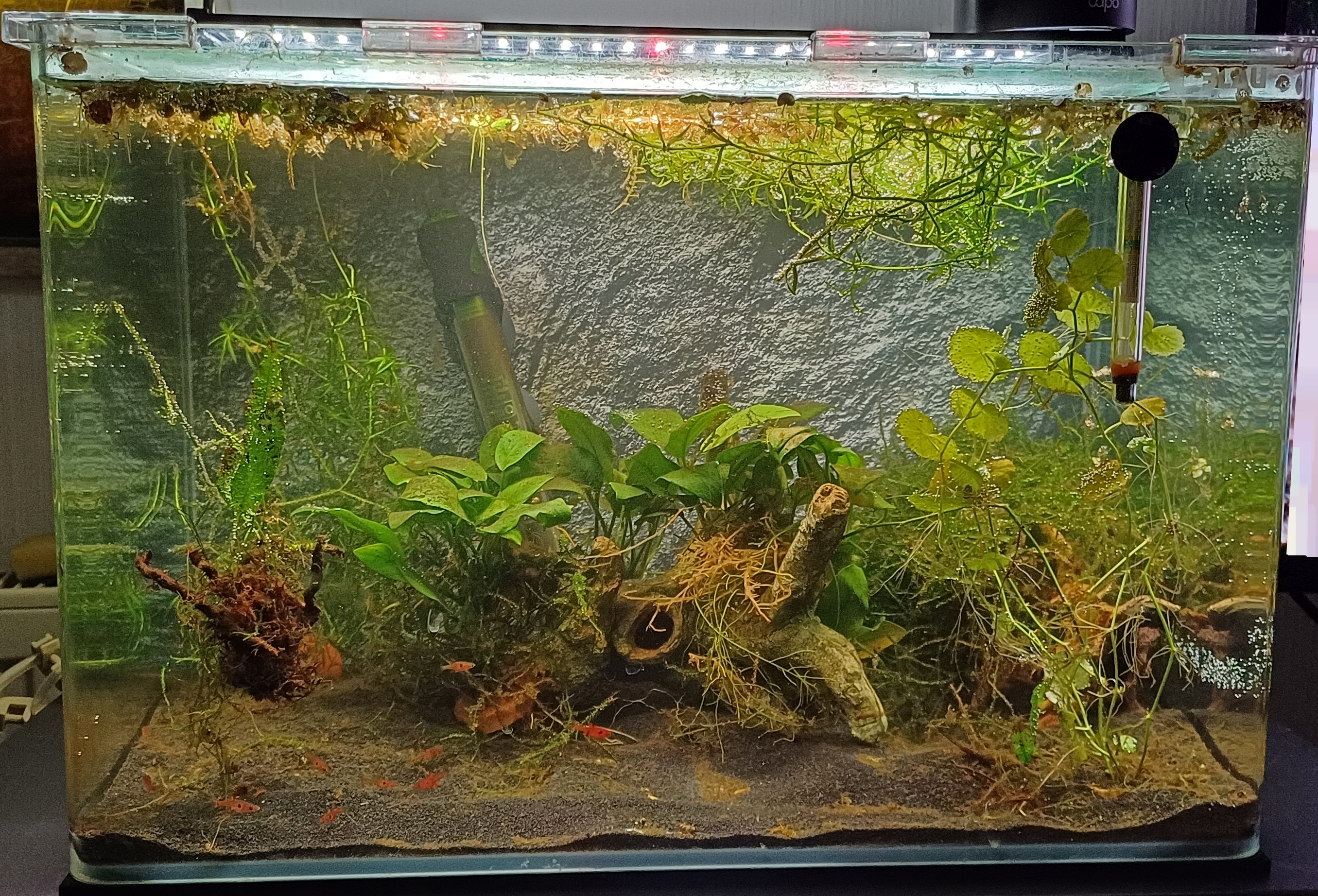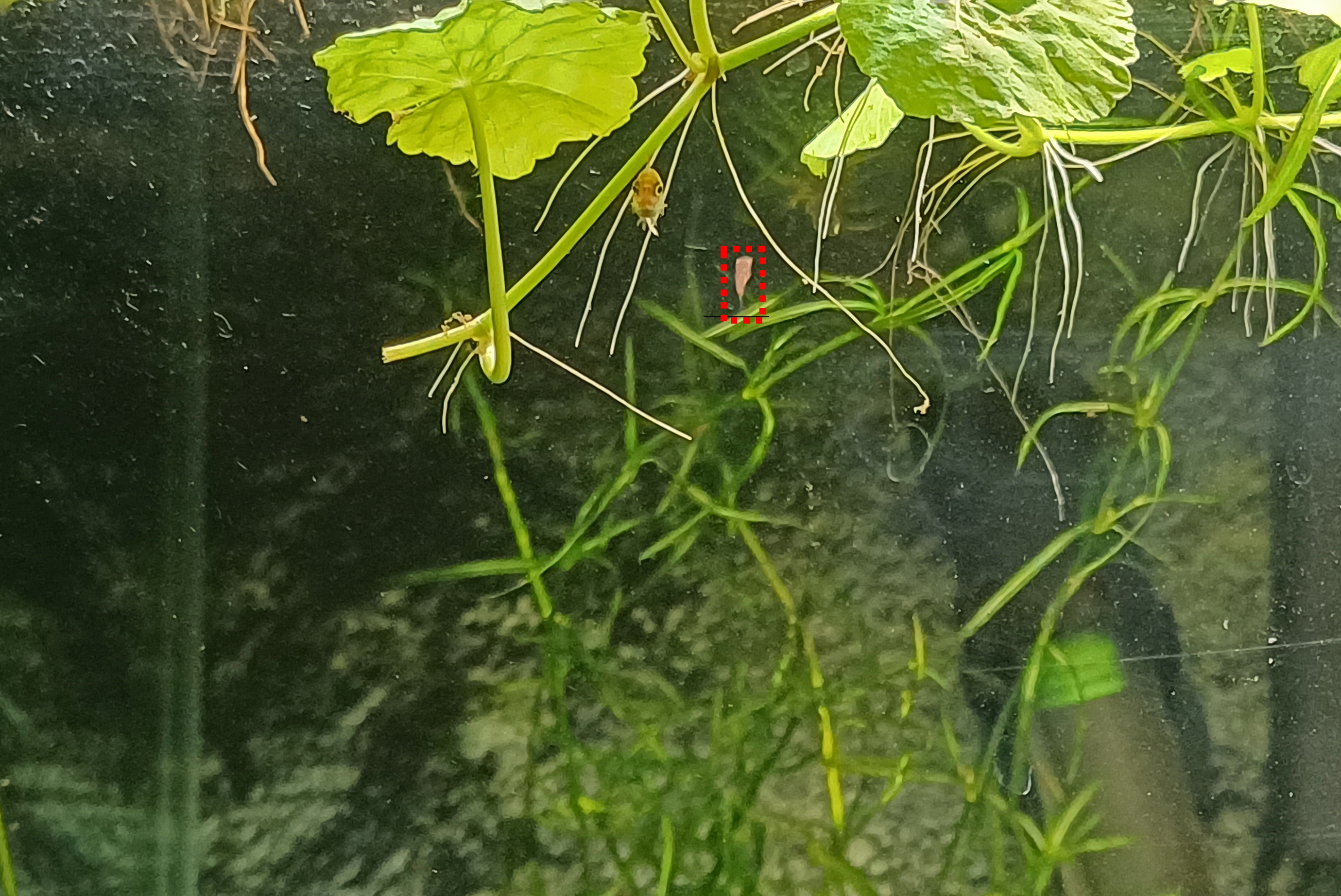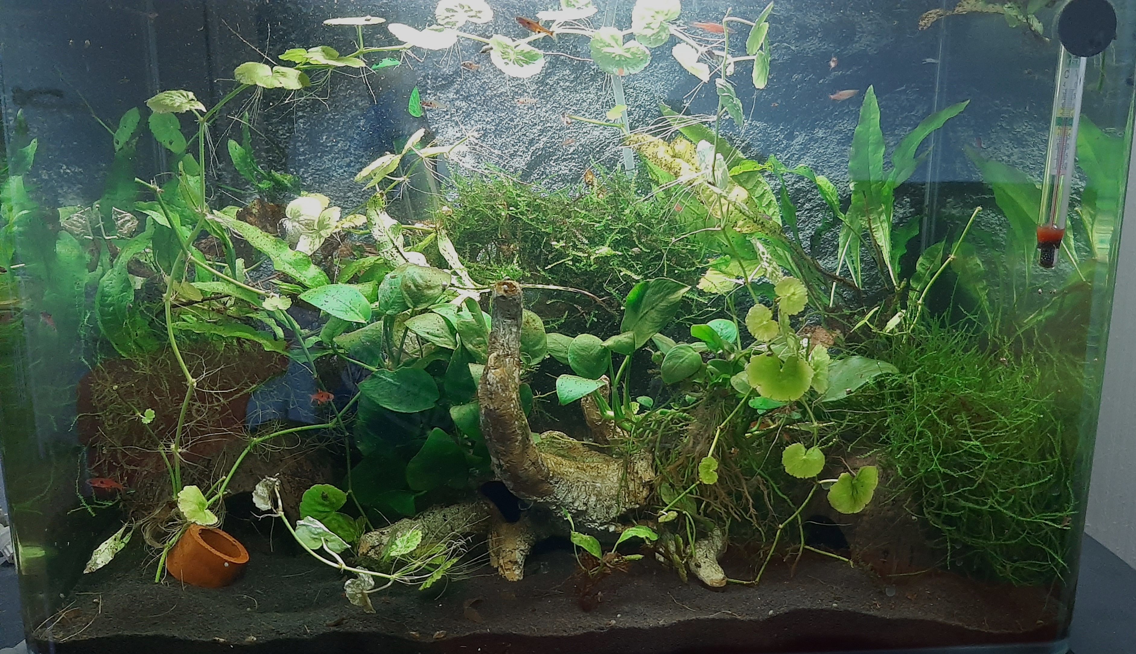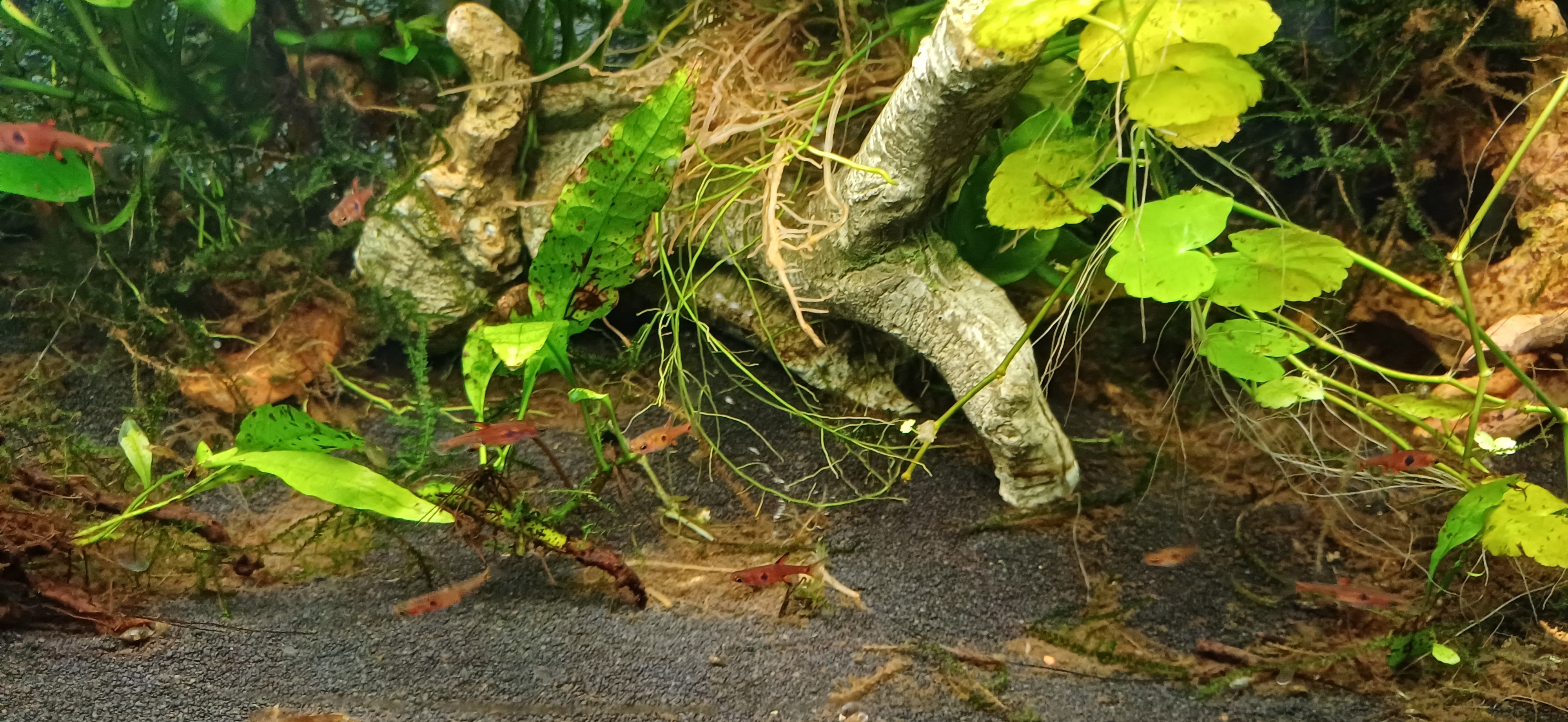 Im 38er ist ein weiterer Jungfisch aufgetaucht. Das nach langer Pause doch wieder Nachwuchs kommt freut mich doch sehr. Ich vermute mittlerweile als Ursache sowohl ein ppm = Verringerung des Pflanzendschungels als auch eine allmähliche Absenkung der Wasserhärte. Nachdem ich heute wieder mit Regenwasser aufgefüllt habe, ueigt das Messgerät derzeit 168ppm = 9,5°dH an. Der pH-Wert beträgt 9°.