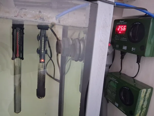 Die beiden Heizstäbe sind im kleinen Technikbecken auf der Rückseite des Aquariums platziert.