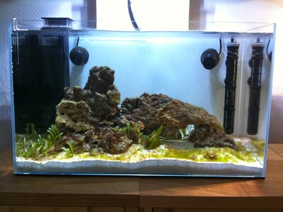 das sieht alles sehr gut aus, die Einfahrphase ist ja voll im Gange und du hast wirklich super Steine mit tollen Algen erwischt. Die Schmieralgen gehen hoffentlich schnell weg, wenn die Einsiedler eingezogen sind.