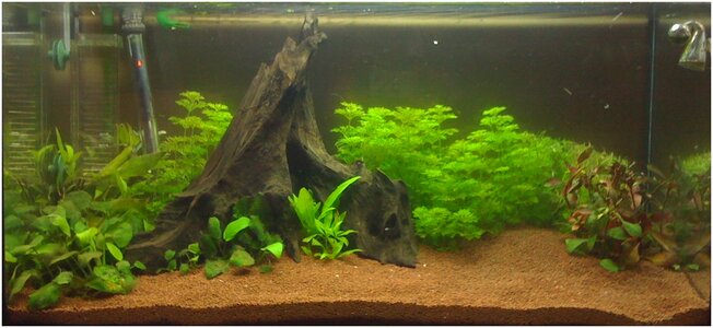 Verwendet habe ich ca 12-15 Liter. Vor Einbringung habe ich das Material gründlich mit warmem Wasser ausgewaschen. Hinzufügen möchte ich, dass einiges an Schwebeteilchen davongeflossen ist, aber sicherlich erheblich weniger als 1%. Zudem stand der Bodengrund für ca 1 Woche in einem Eimer mit Wasser, Wasserspiegel deutlich drüber. Das alles hat wohl einiges zum guten Gelingen beigetragen.