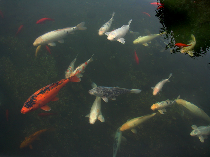 Besatz: Wie schon erwähnt ca. 20 Kois, (bis 5 kg) wobei jetzt der 1. Trauerfall zu beklagen ist: ein 50cm-Koi ist leider nach 6 Jahren an Herzversagen gestorben.