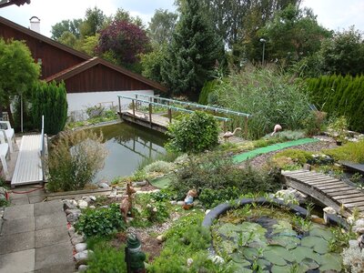 Insgesamt sind es etwa 70.000 l Wasser in 6 Hartschalen- und Folienteichen. Sie sind miteinander durch Wasserläufe verbunden (leichte Hanglage). Auf den Fotos seht ihr dann auch die hölzernen Brücken über die Wasserläufe. Von Weiher zu Weiher entstehen kleine Wasserfälle, die eine gute Sauerstoffversorgung gewährleisten.