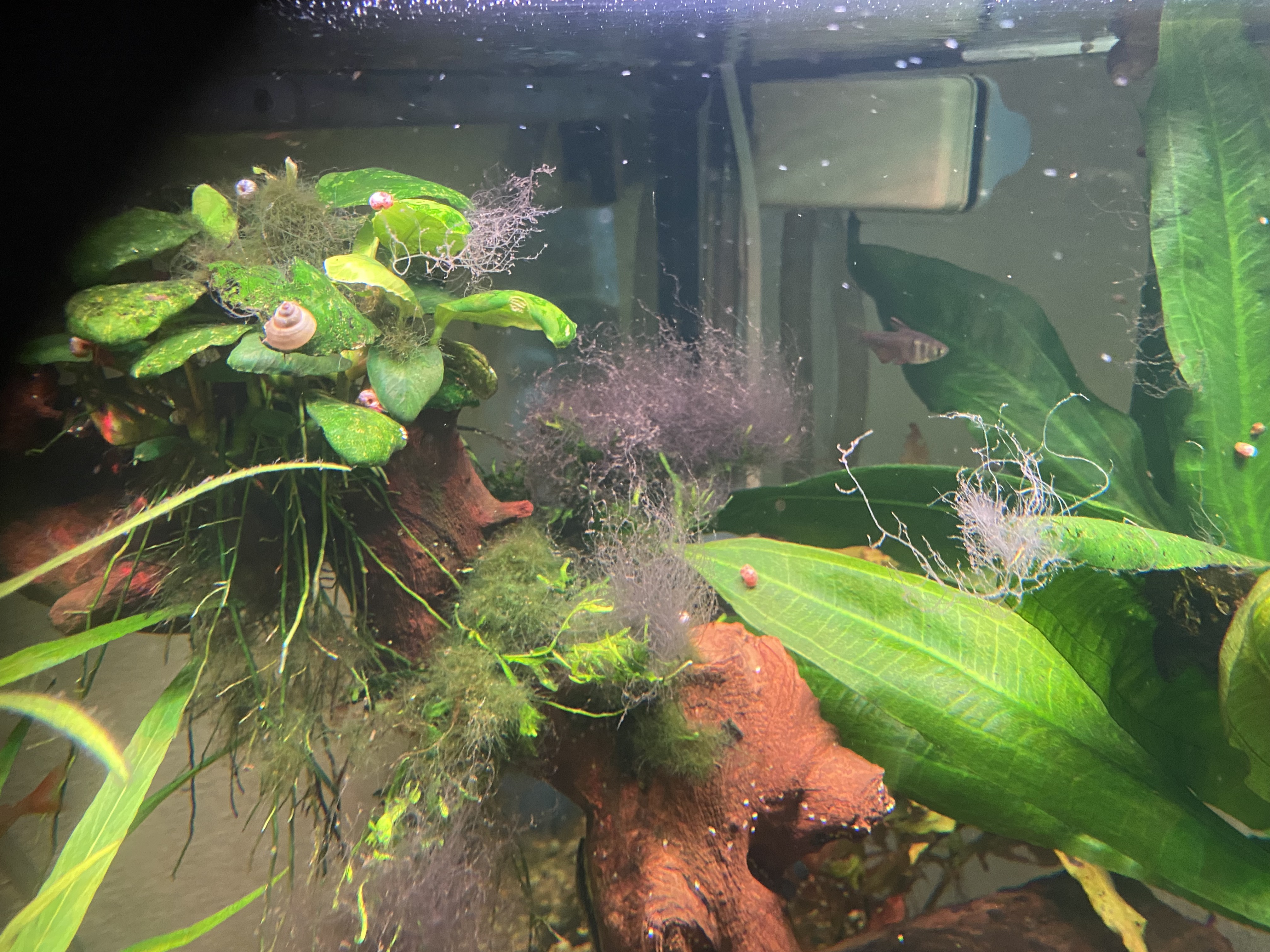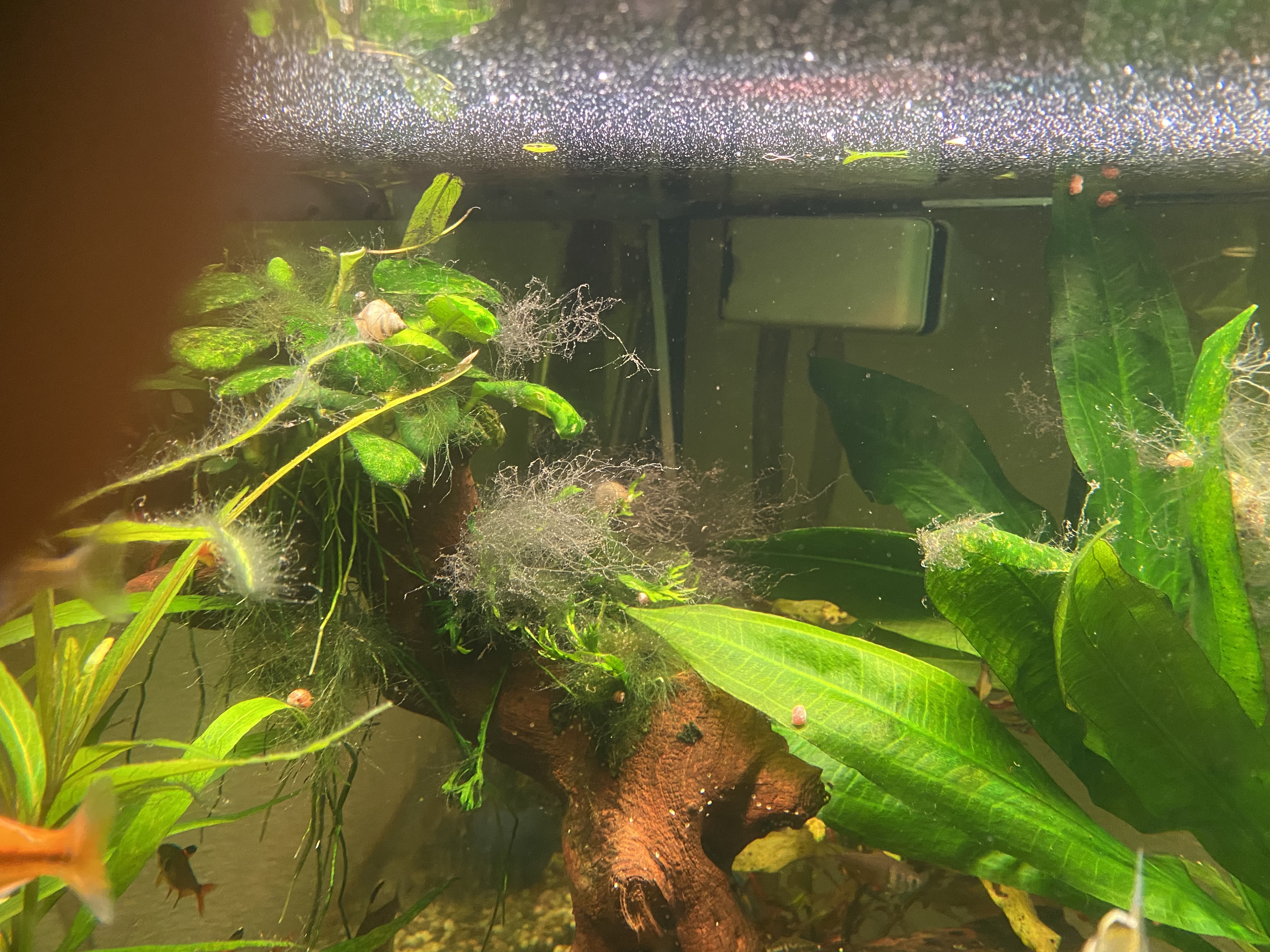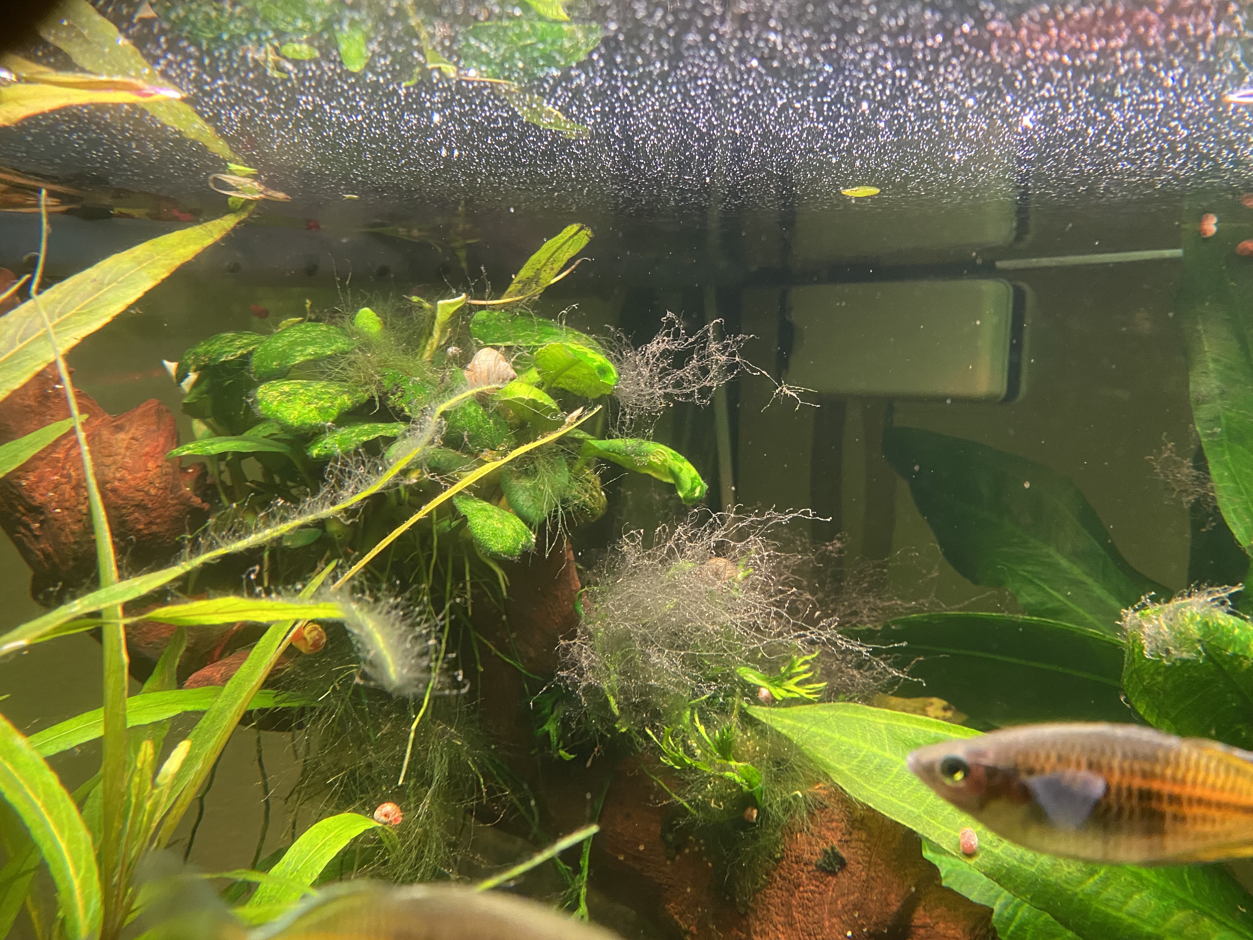 Ich habe ein JUWEL 190l Eckaquarium, mit Außenfilter Juwel800. Einige Jahre hatte ich das MULTILUX-Lichtsystem von JUWEL drauf. Mit sehr gutem Erfolg. Gutes Wachstum der Pflanzen, Fische fühlten sich wohl. Keine Algen!!! Der Besatz ist "normal", nicht zu viel. Zu Weihnachten gab es dann das HELIALUX SPECTRUM mit Controller. Ich habe es so laufen lassen, noch nicht so viel experimentiert, mit Sonnenauf- und Untergängen und Farbspiel. Es läuft so gute 10 Stunden. Mittagspause 2 Std. nicht mit eingerechnet. Jetzt auf einmal habe ich an vielen Stellen ALGEN... Ich weiß nicht, wie ich die weg bekommen soll, ohne Chemie. Ich habe keine Düngung vorgenommen. CO2 läuft 10 Std bei 50 Bläschen in der Minute. Ich habe auch noch ein paar schicke Schnecken dazu gekauft, die sind schon 1/2 Jahr dort und gut genährt. Wenn ich jetzt Chemie rein gebe, gegen diese Algen (siehe FOTOs), habe ich bestimmt die Schnecken auf dem Gewissen. Weil auch andere Algen abgebaut werden, von denen die leben. BIN RATLOS..