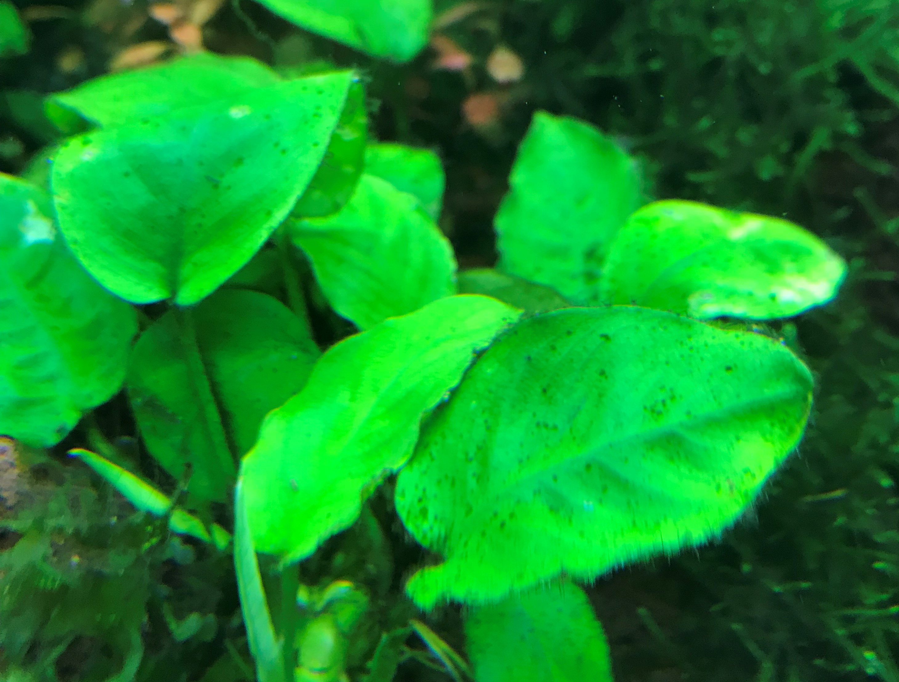 Was mich sehr stört sind die vielen Punktalgen auf den älteren Anubia-Blättern (10 Pflanzen, sehen alle so aus wie auf dem Bild), sowie die Fadenalgen an den Ludwigia- und Microsorum-Pflanzen (sehen auch alle so aus