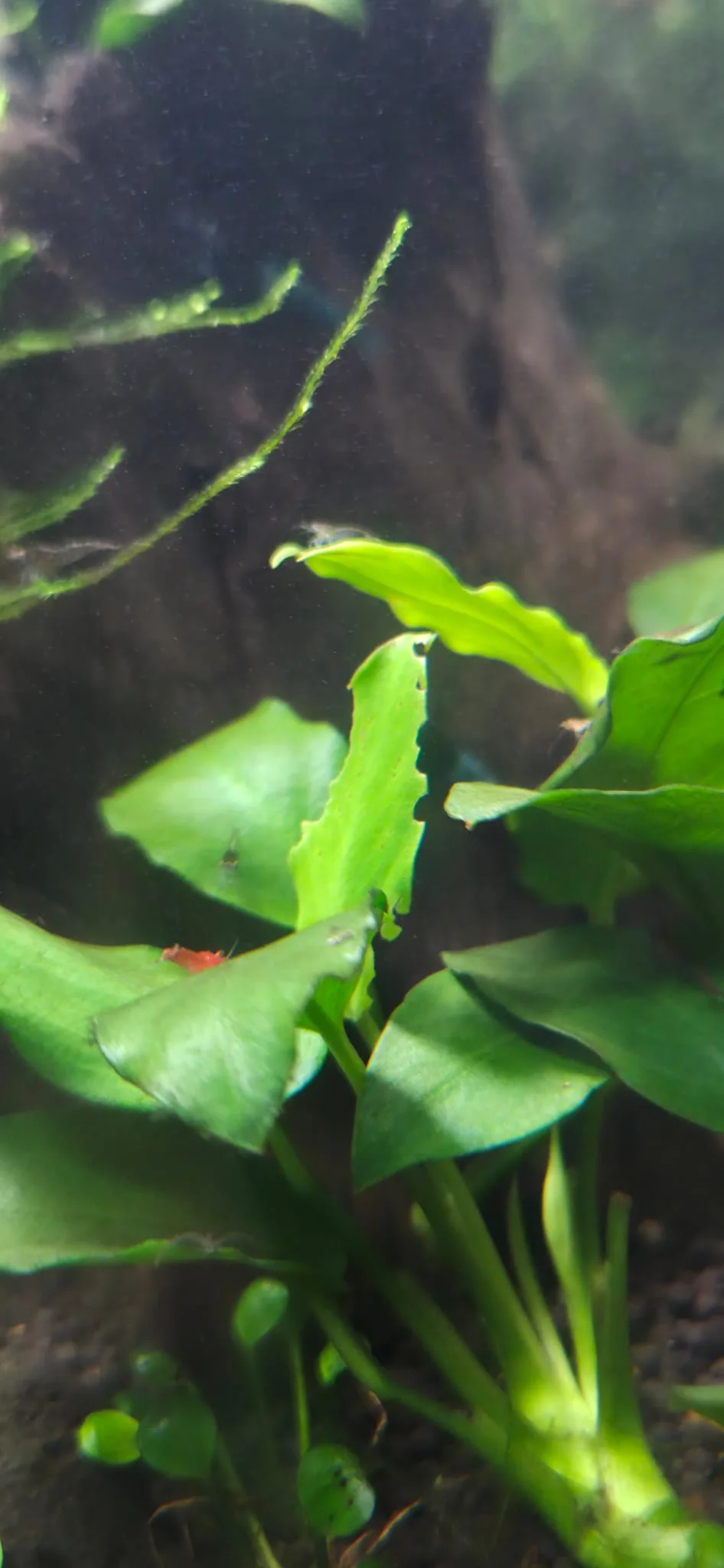 - Gleichzeitig meinte er aber, dass Anubias definitiv nicht von Garnelen gefressen werden – was mich wieder verunsichert, da dort ebenfalls deutliche Fraßstellen zu sehen sind.
