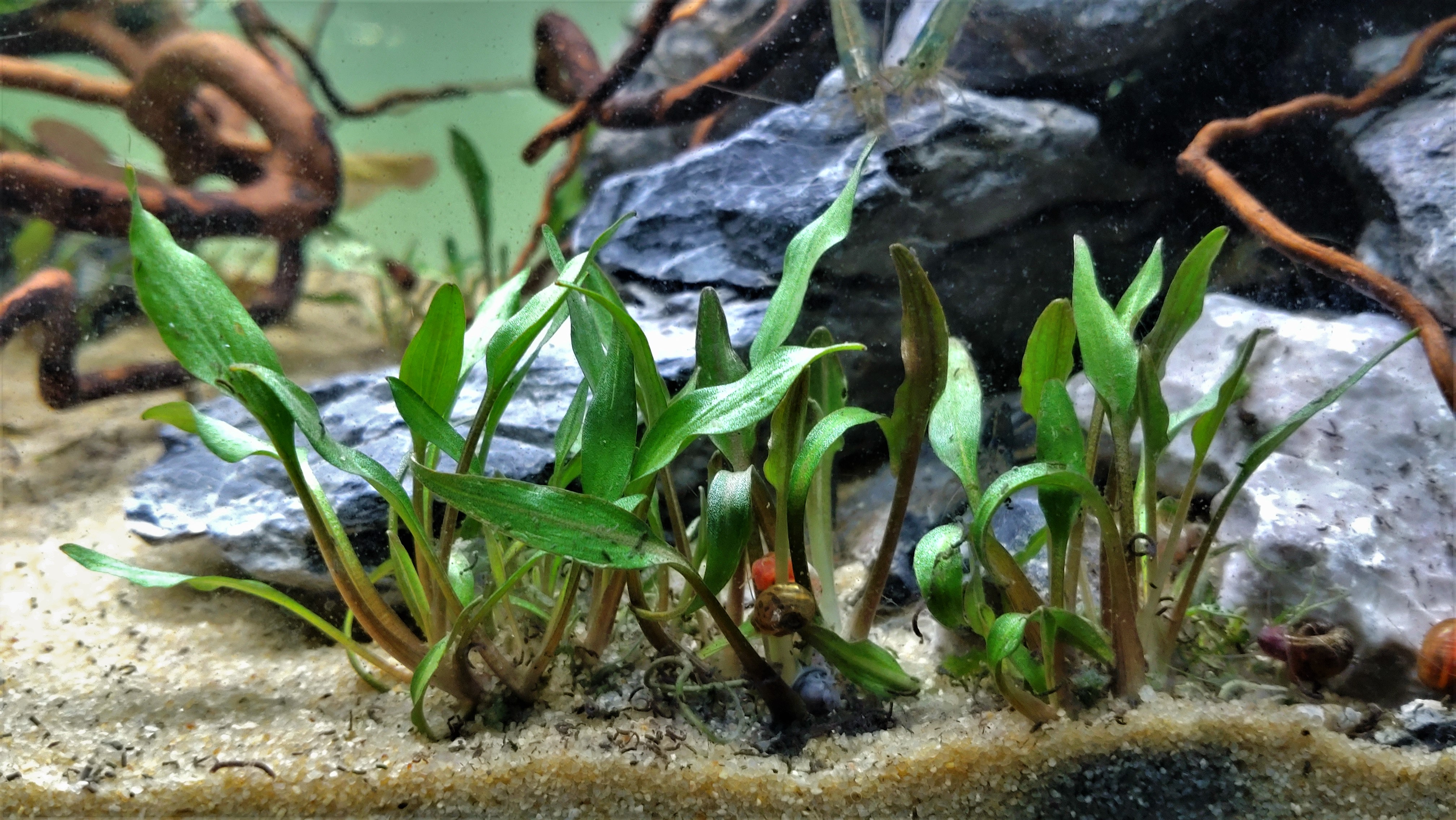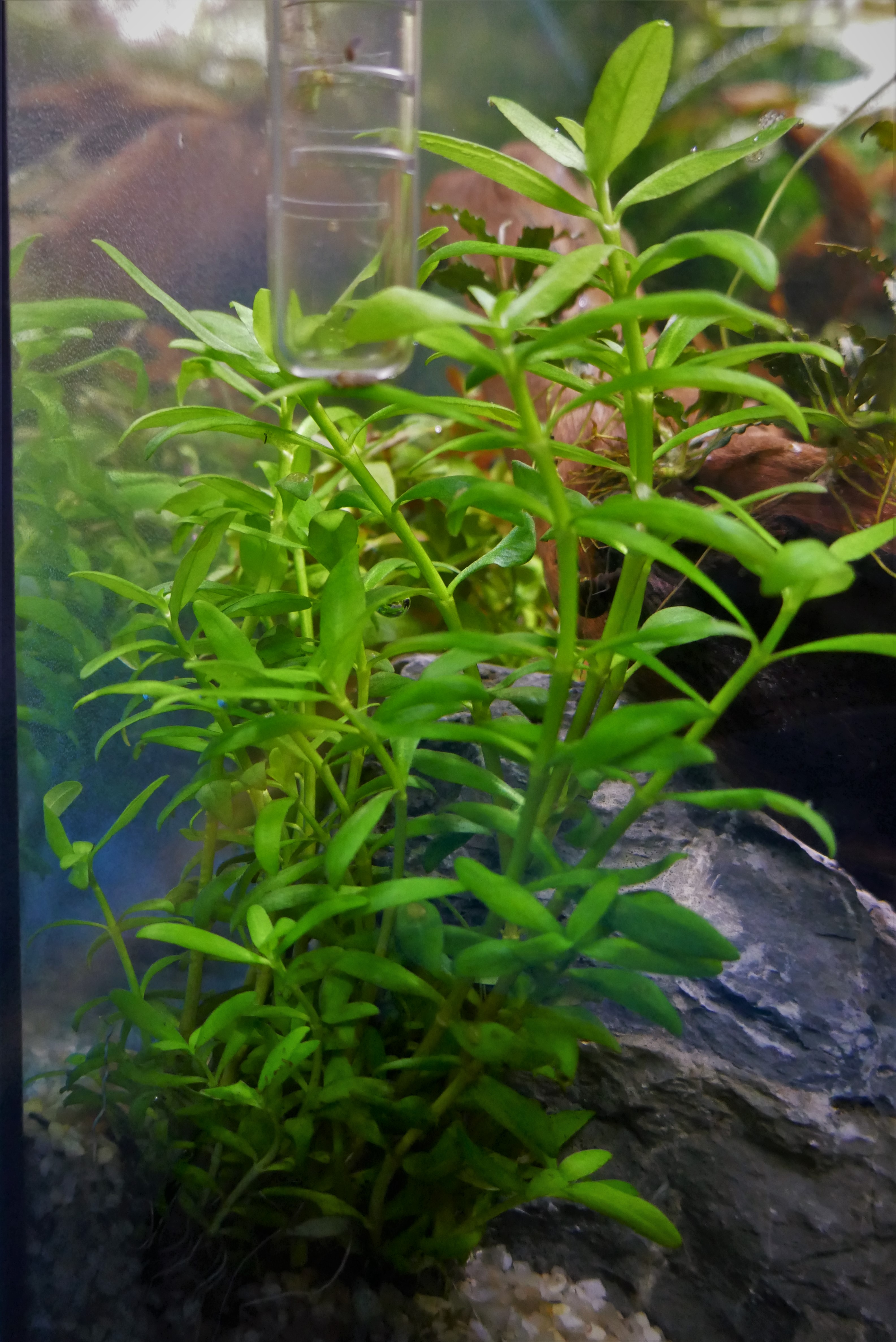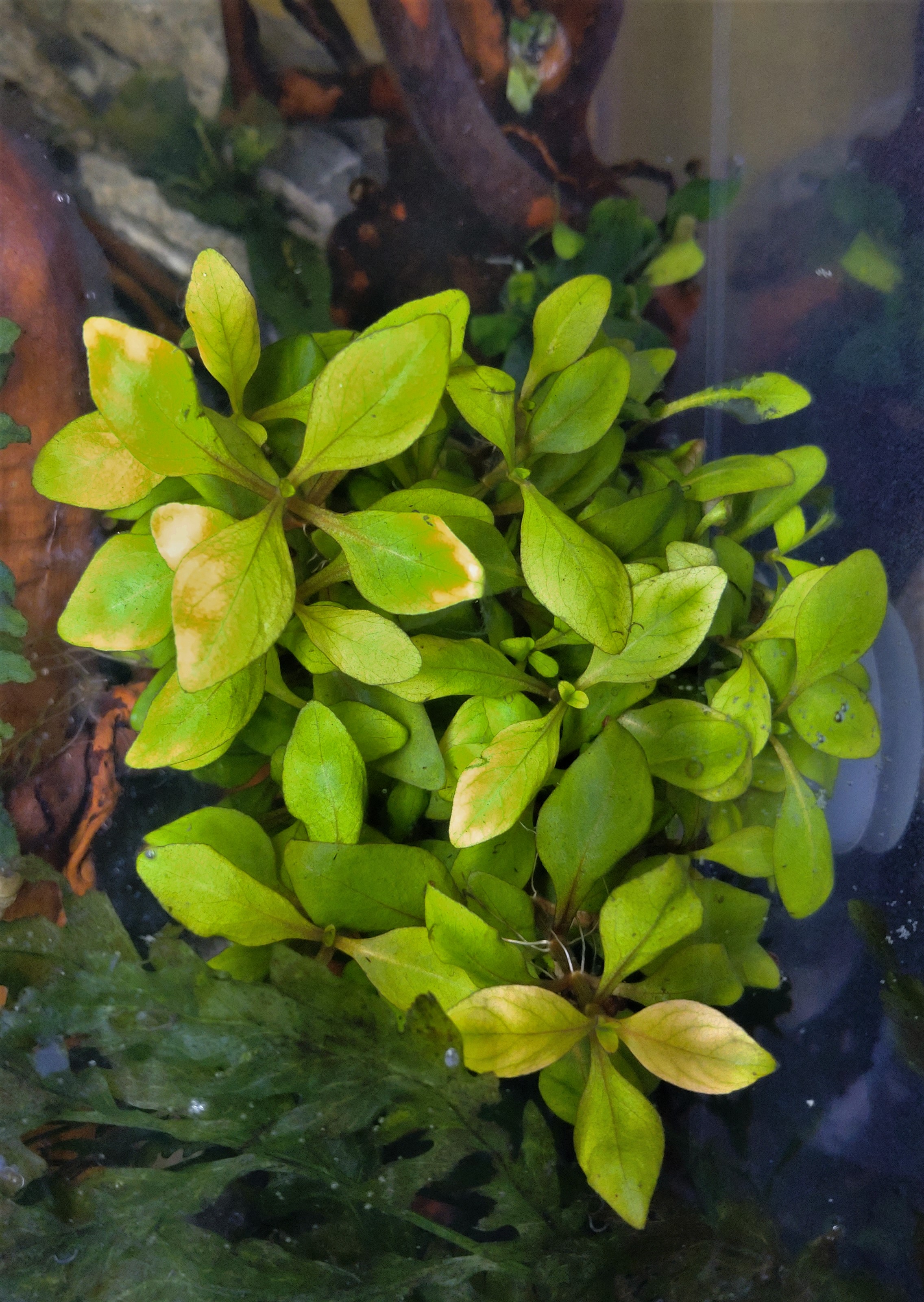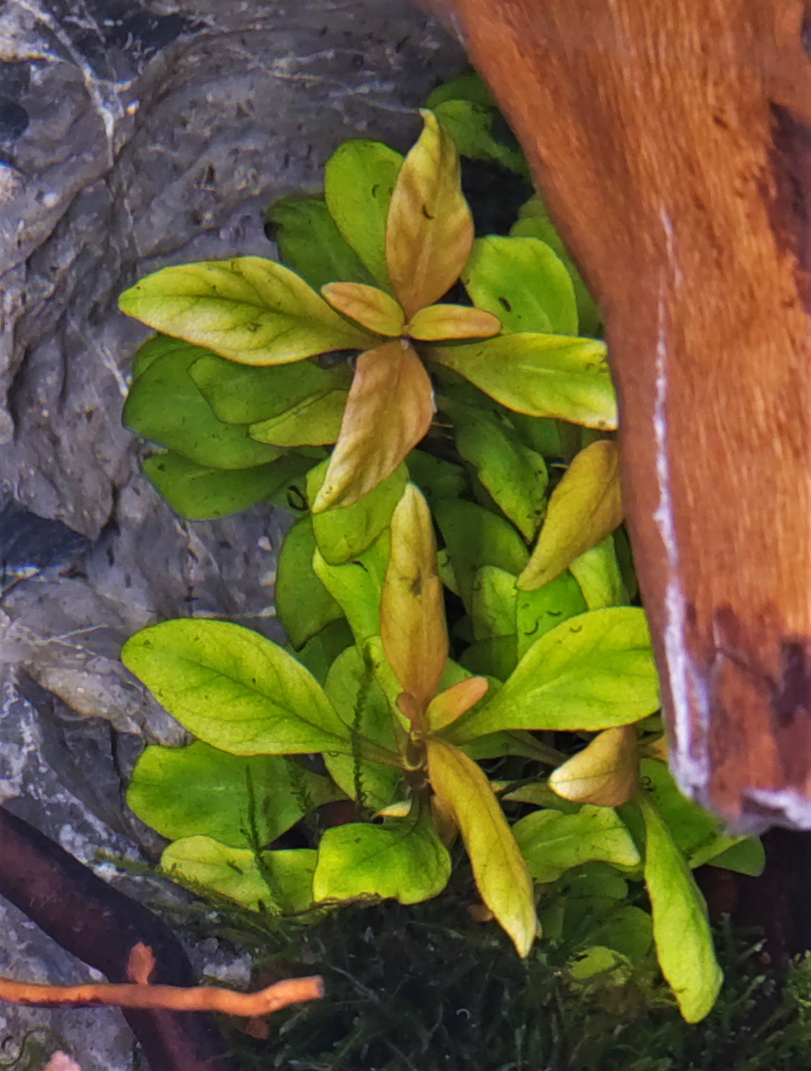 Etwas mehr EI, N und FE Basic und inzwischen sieht sie nicht mehr gar so blass aus. Ich muss mal probieren, ob ich mit Bittersalz erfolgreich bin und sie danach besser steht. Eventuell fängt sich dann auch das Lilaeopsis carolinensis, das auch nunmehr stark gerupft aussieht. Das hat die Umstellung auf submers wesentlich schlechter vertragen als das brasiliensis und ordentlich Federn gelassen. Auch die Mexicana gedeiht in diesem Becken sichtbar schlechter als bspw. in einem der Kampffischbecken, wo ich ein Backup gepflanzt habe.