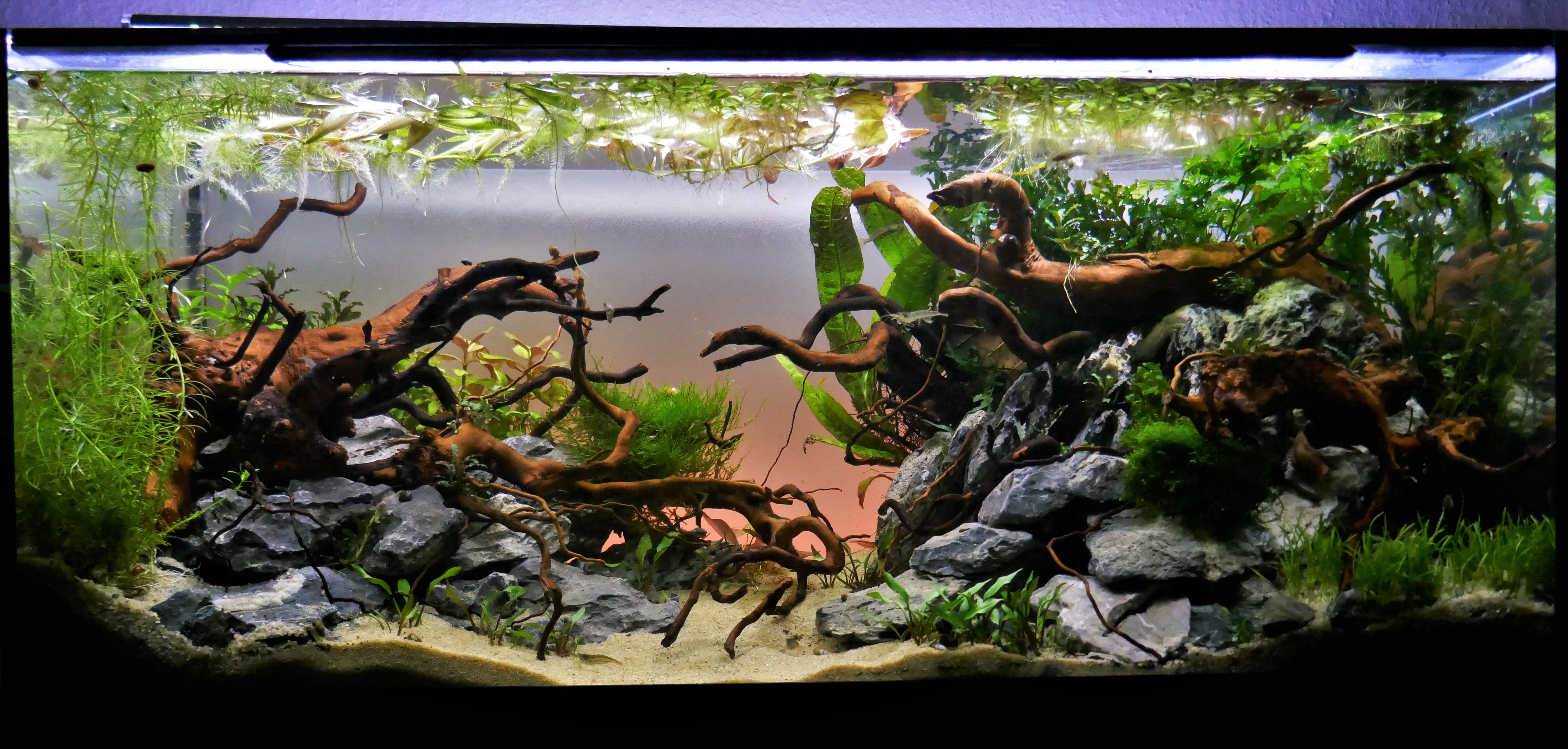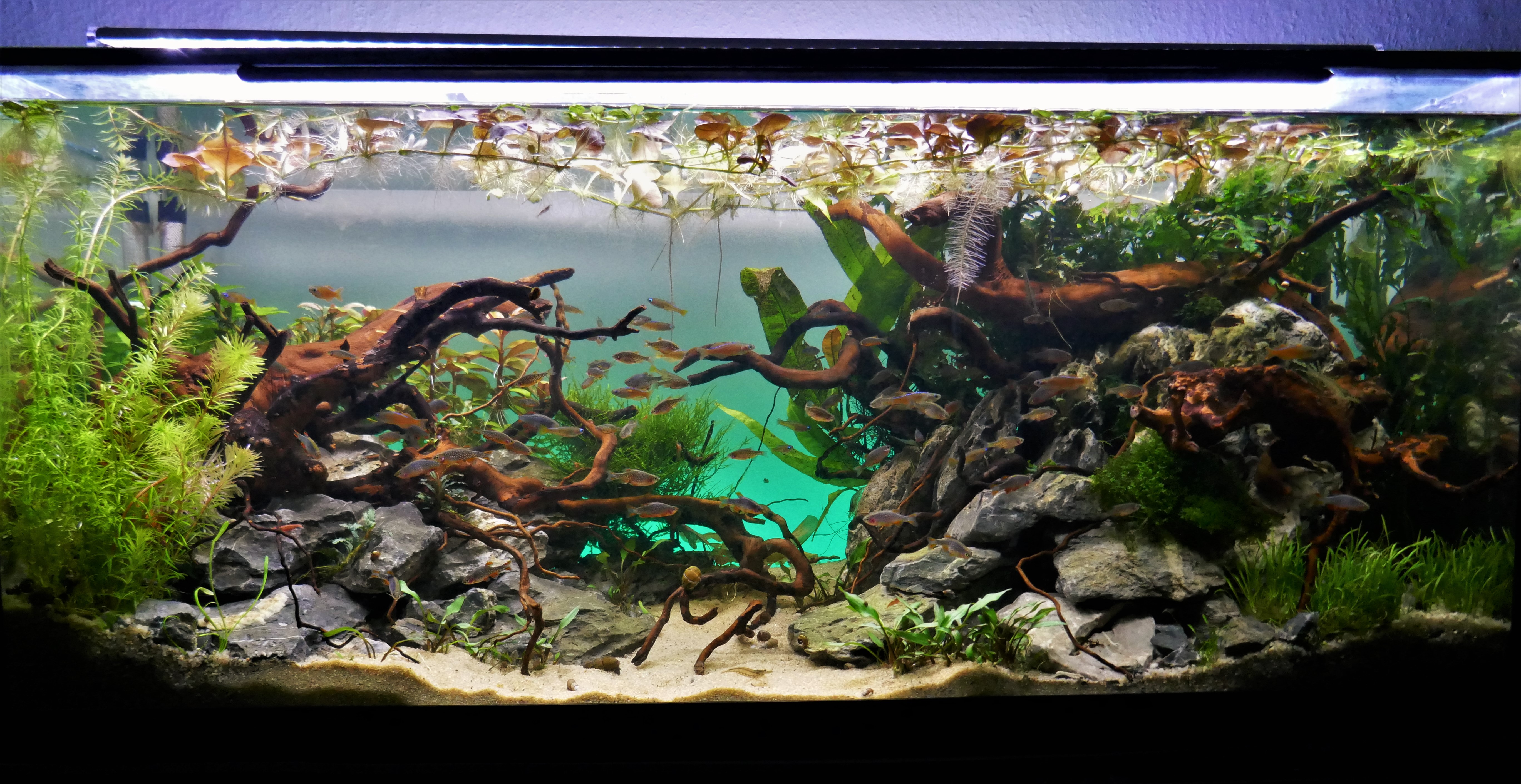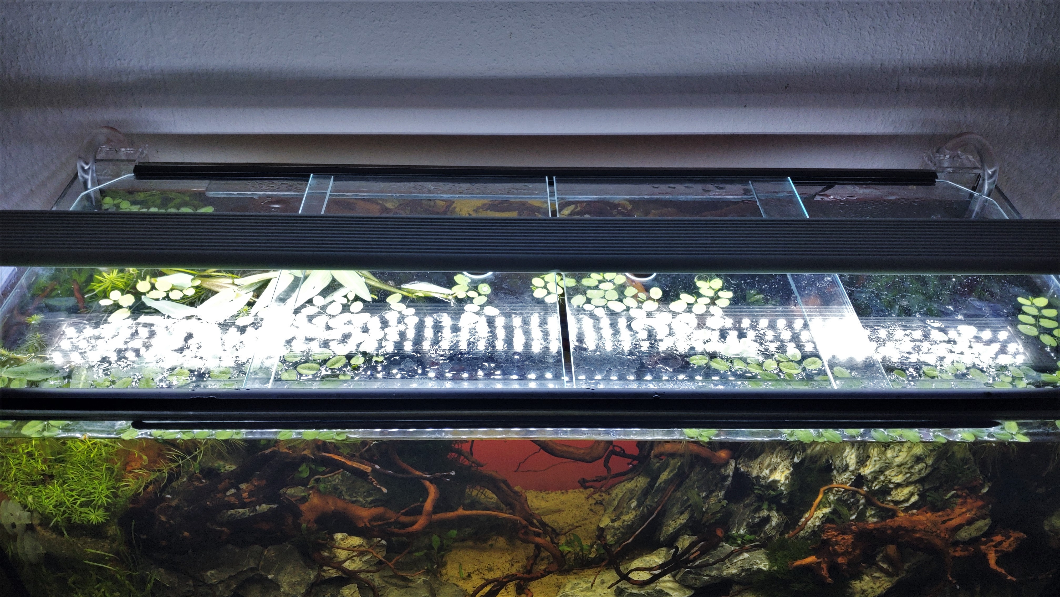 Im AF habe ich zuletzt noch einige Filtermaterialien getauscht, prompt verschwand der Bakterienrasen des Grauens buchstäblich von gestern auf heute. Zusammen mit der neuen Hardware, auch den eingetroffenen Abdeckscheiben, sieht es inzwischen recht manierlich aus. Ich optimiere noch etwas an der Düngung herum, die Stengelpflanzen müssen noch etwas wachsen, der Plant Pod muss raus, und dann können bald weitere Garnelen (Neocaridina) einziehen.
