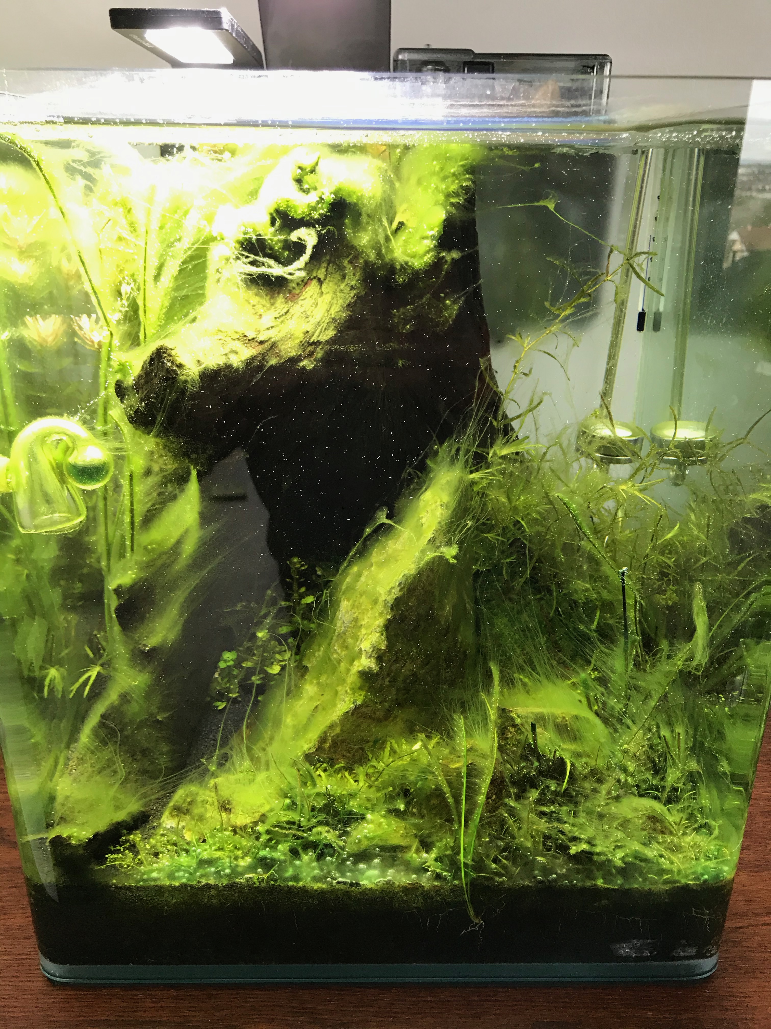 Ich dachte, dass die Pflanzen aufgrund der kurzen Beleuchtungsdauer matschig werden, bin dann schrittweise wieder auf 10 Stunden - leider nur mit dem Effekt noch mehr Algen zu produzieren.