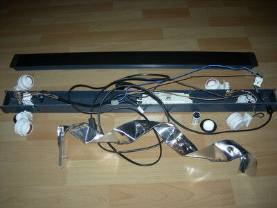 Zuerst habe ich meinen alten 2x18W Lichtbalken, der lange Zeit im Keller lagerte, auseinandergesägt, so dass nur der "Mitteldeckel" übrig blieb. Von Außen sieht es dann völlig unangetastet aus.