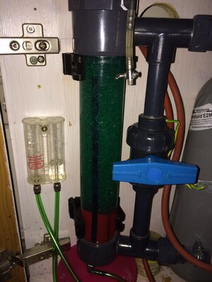 Was auf dem Foto oben noch nicht zu sehen ist, das grüne Kunststoffgespinst das ich im unteren Bereich reingemacht habe in der Hoffnung das sich da die CO2 Blasen verfangen und lösen.