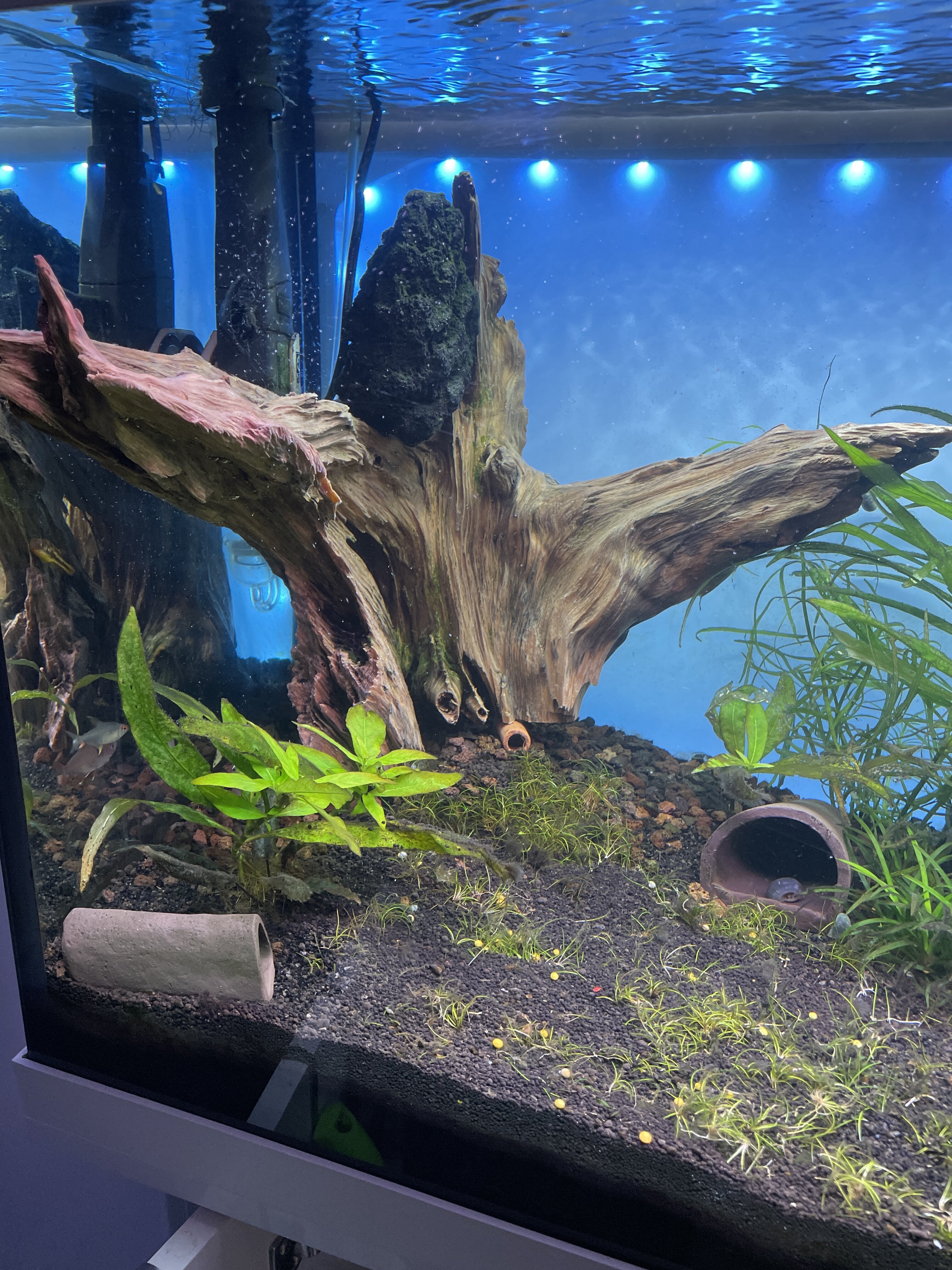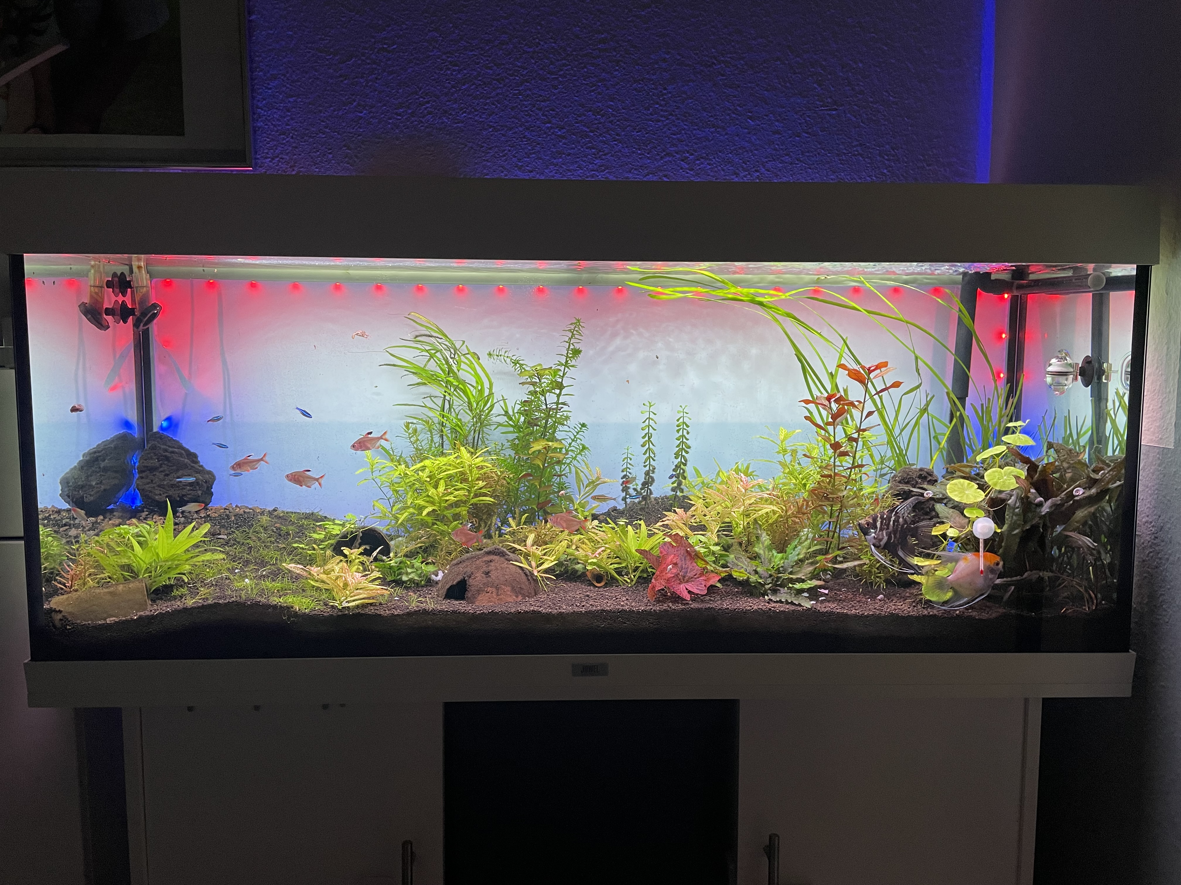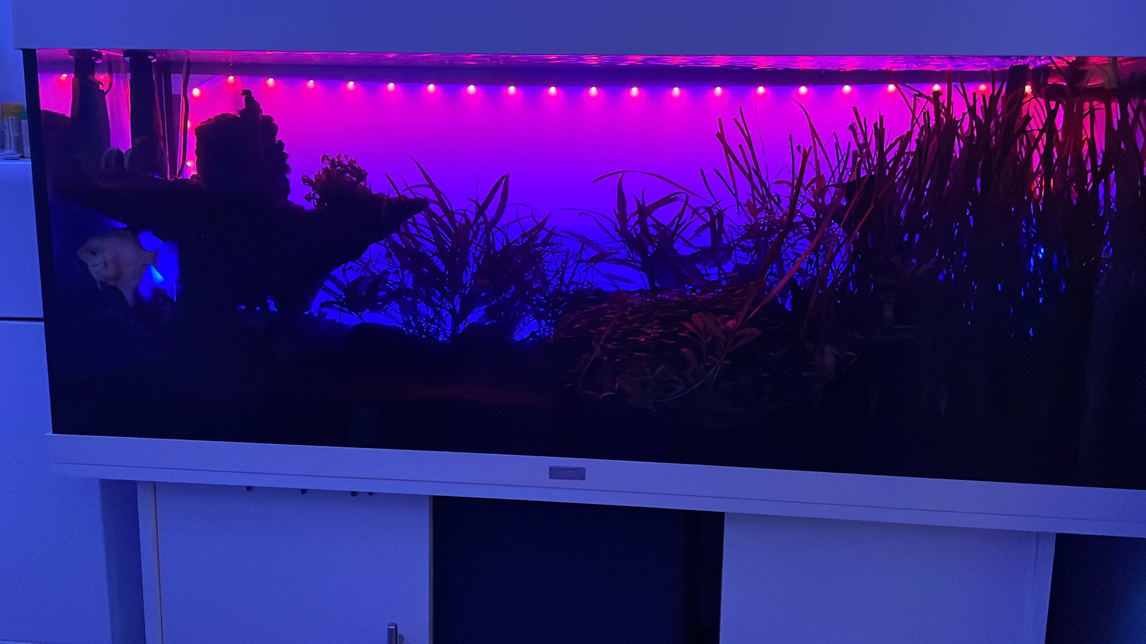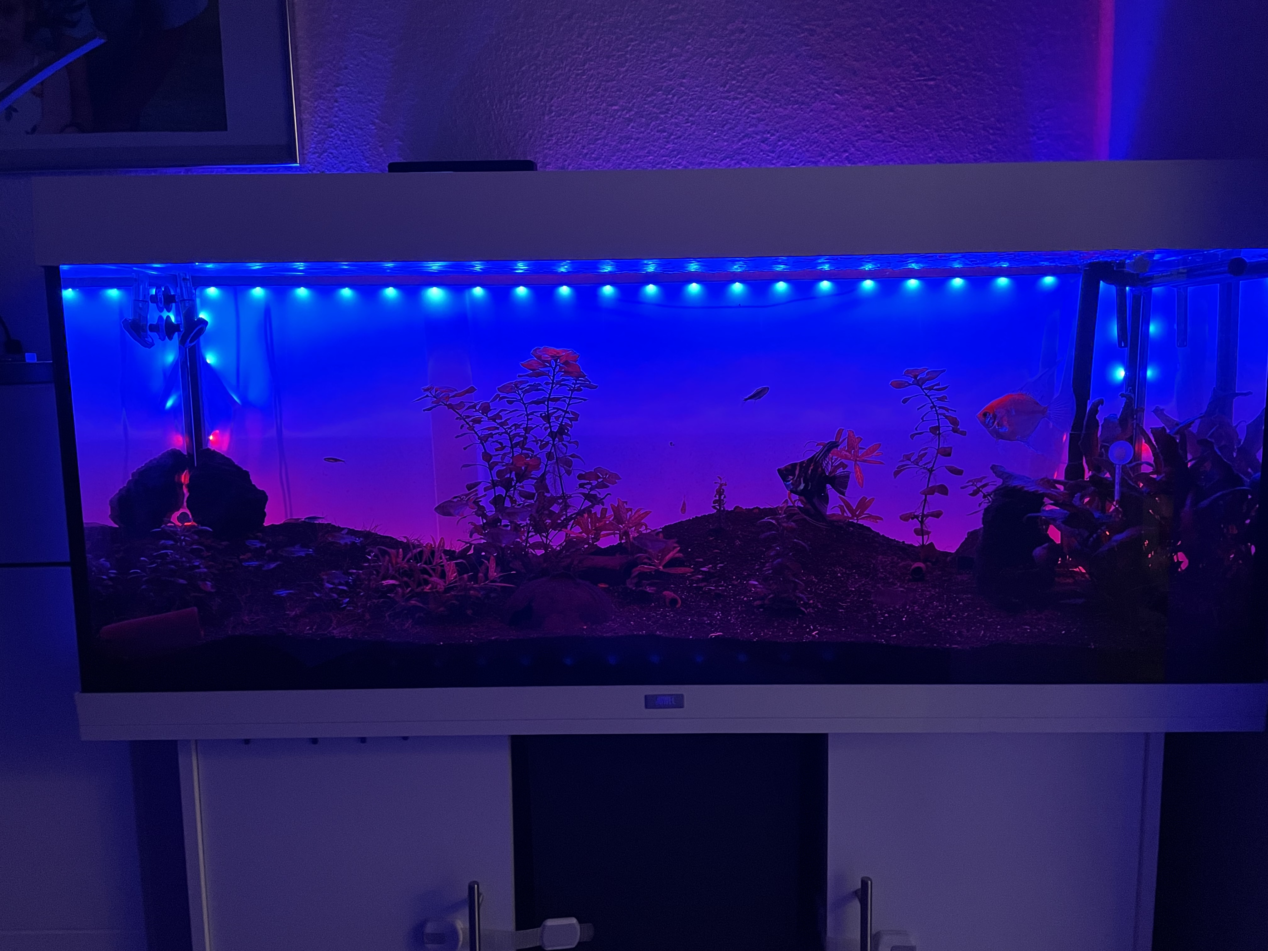 Okay, sollten sich dort mal Cyanobakterien ansiedeln, dann diese entfernen und das Licht abschalten.eigentlich morgens rotblau dann bleibt das den ganzen Tag an wieder blaurot