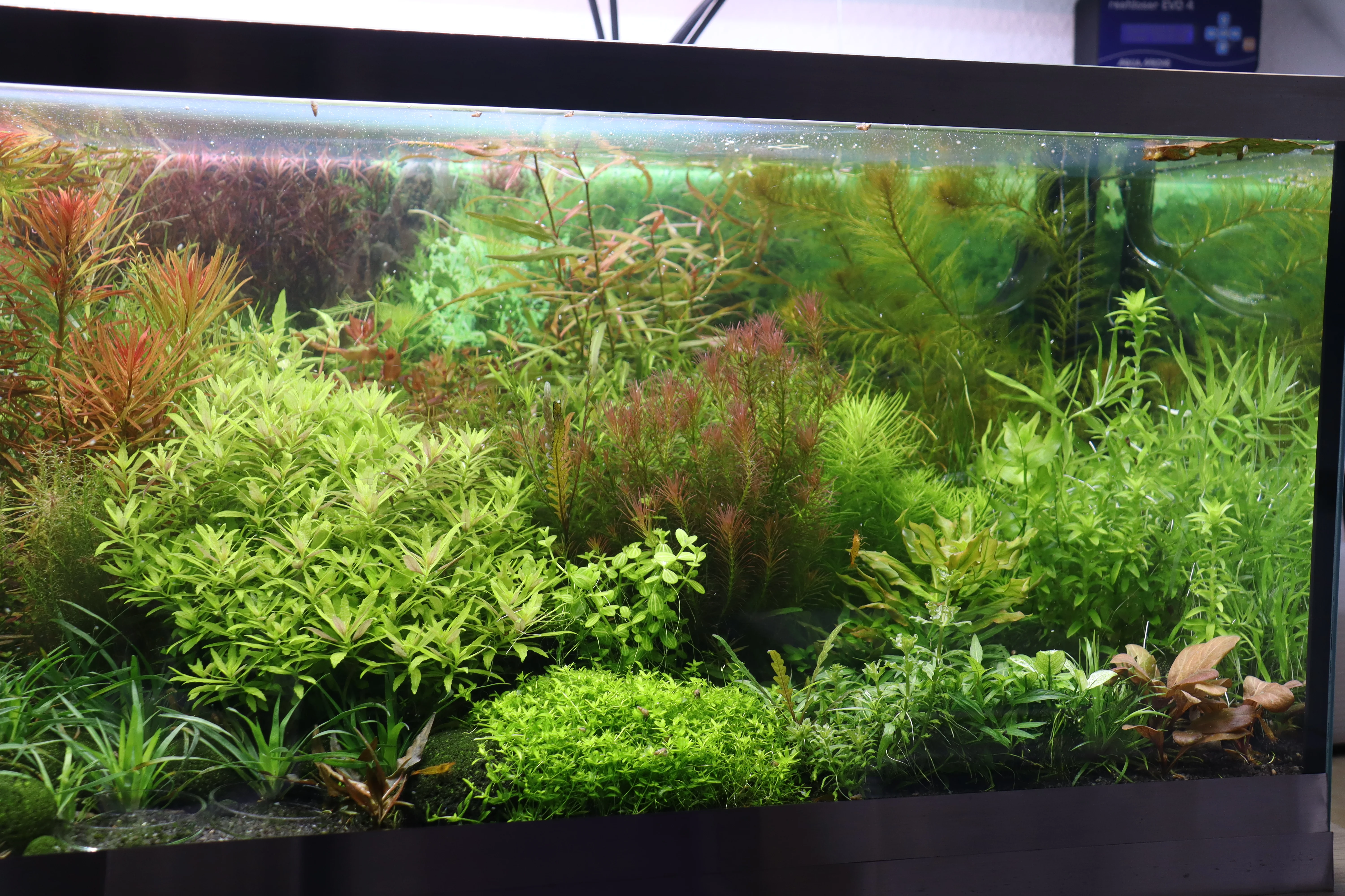 Pflanzen werden alle 14 Tage geschnitten. Mulm, Scheiben und Glaswaren wurden noch nie gereinigt. Es ist nichts an der Scheibe dran, im Becken sieht man keine Algen.