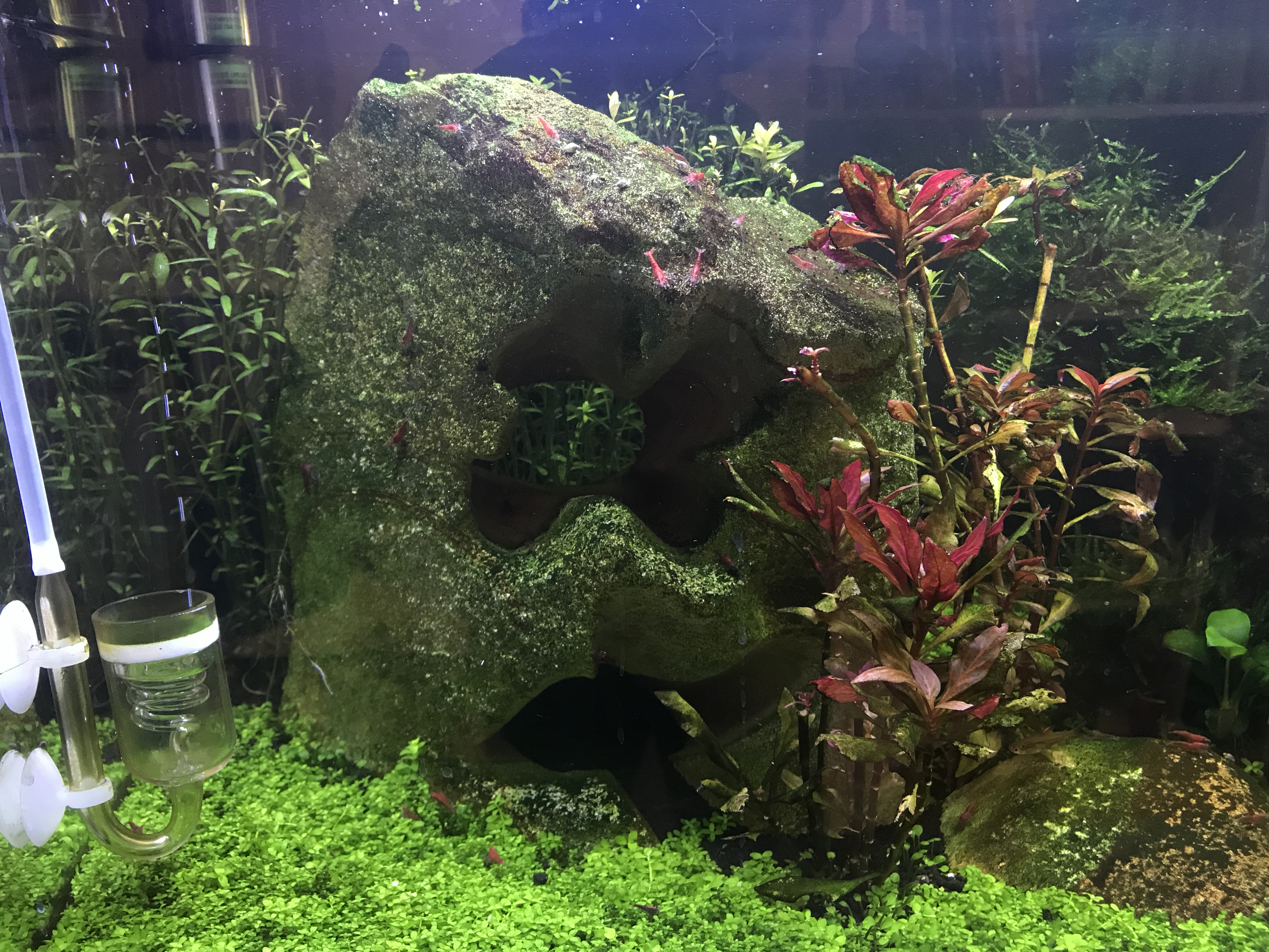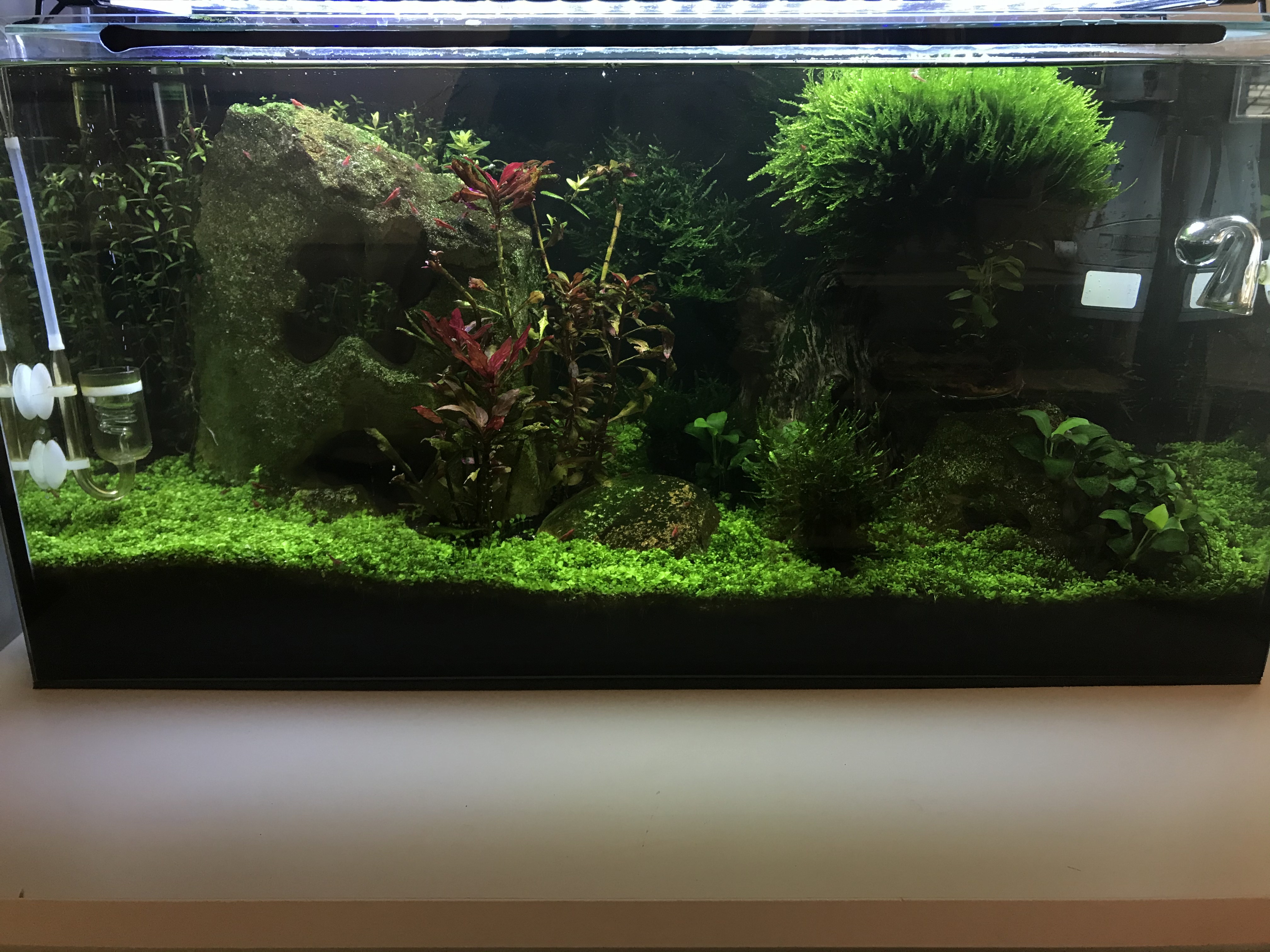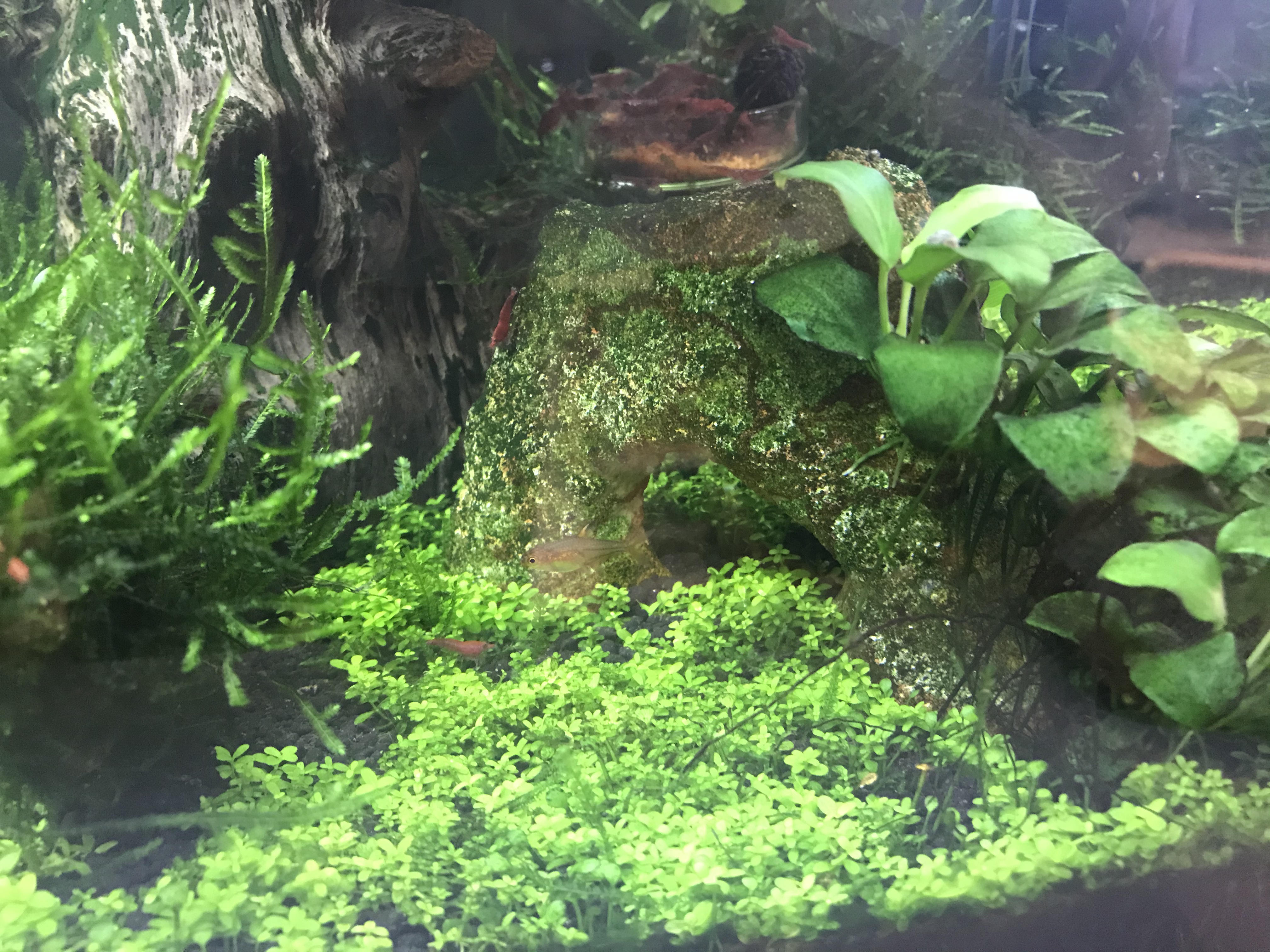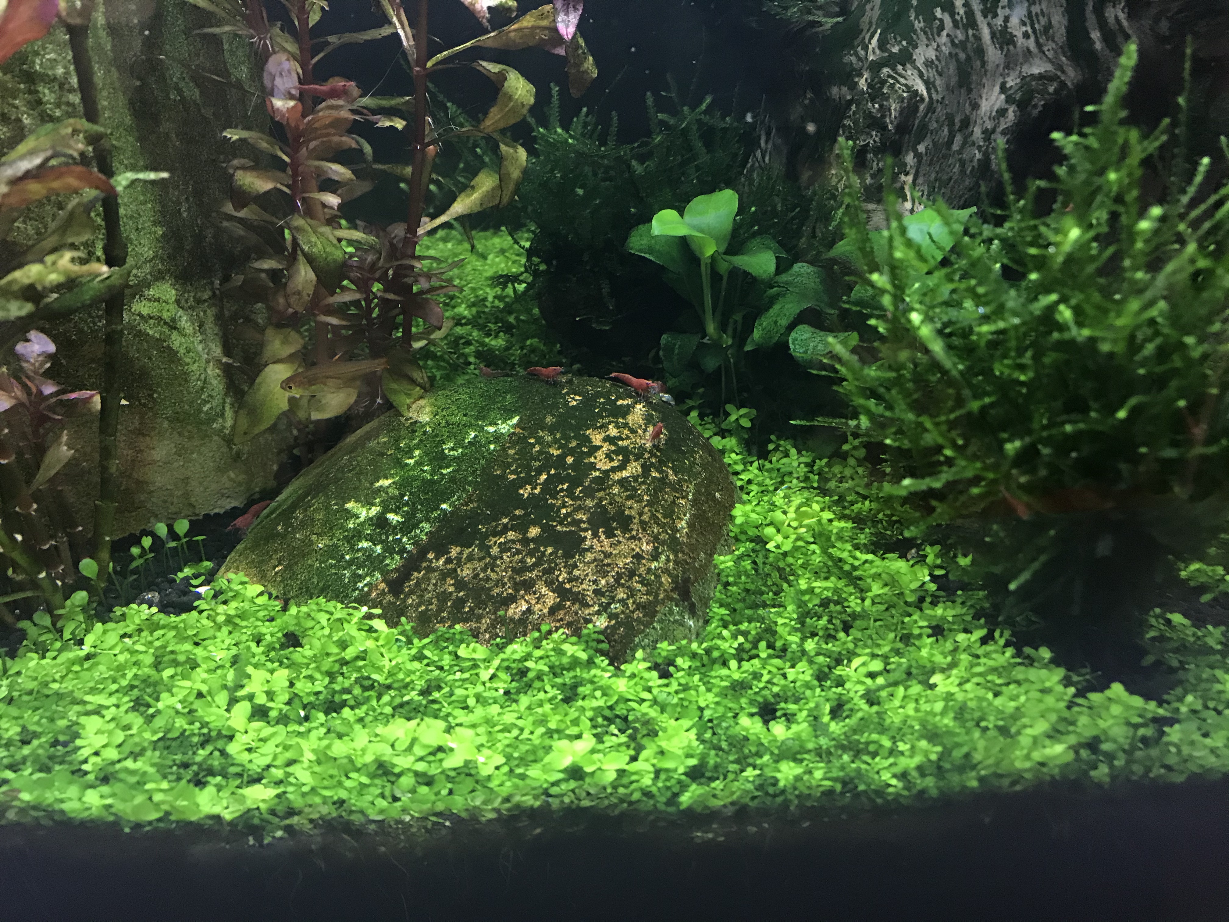 Zu meinem Becken: 54l Becken mit einer Wurzel drin, zwei Steinen, 6 Funkensalmlern, Red Fire Garnelen und der BodenGrund ist Soil.