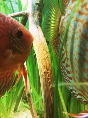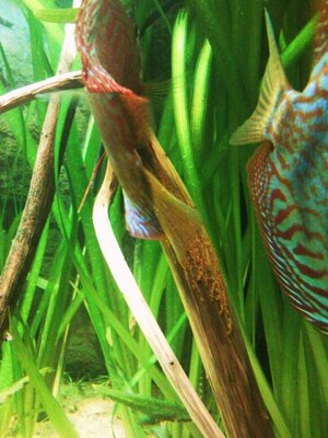 Ich hab mal heute versucht Bilder zu machen, wobei meine Panoramascheibe im Aufzuchtbecken nicht im Wege steht. Bin die sache mal anders angegangen und habe für die Paar Bilder heute mehr als 30 min aufgenommen. So das ich auch mal die Fischis vor die Linse bekomme, wie ich sie zuhause live sehe :shock: :wink: . Die Unterschiede zwischen den helleren und dunkleren werden immer Größer( ich meine damit nur die Farbintensität). Das mit dem Flaschenverschluss hab ich auch probiert aber die wollten einfach nicht :( , da hätte ich wohl jetzt noch dafur gesessen :lol: .