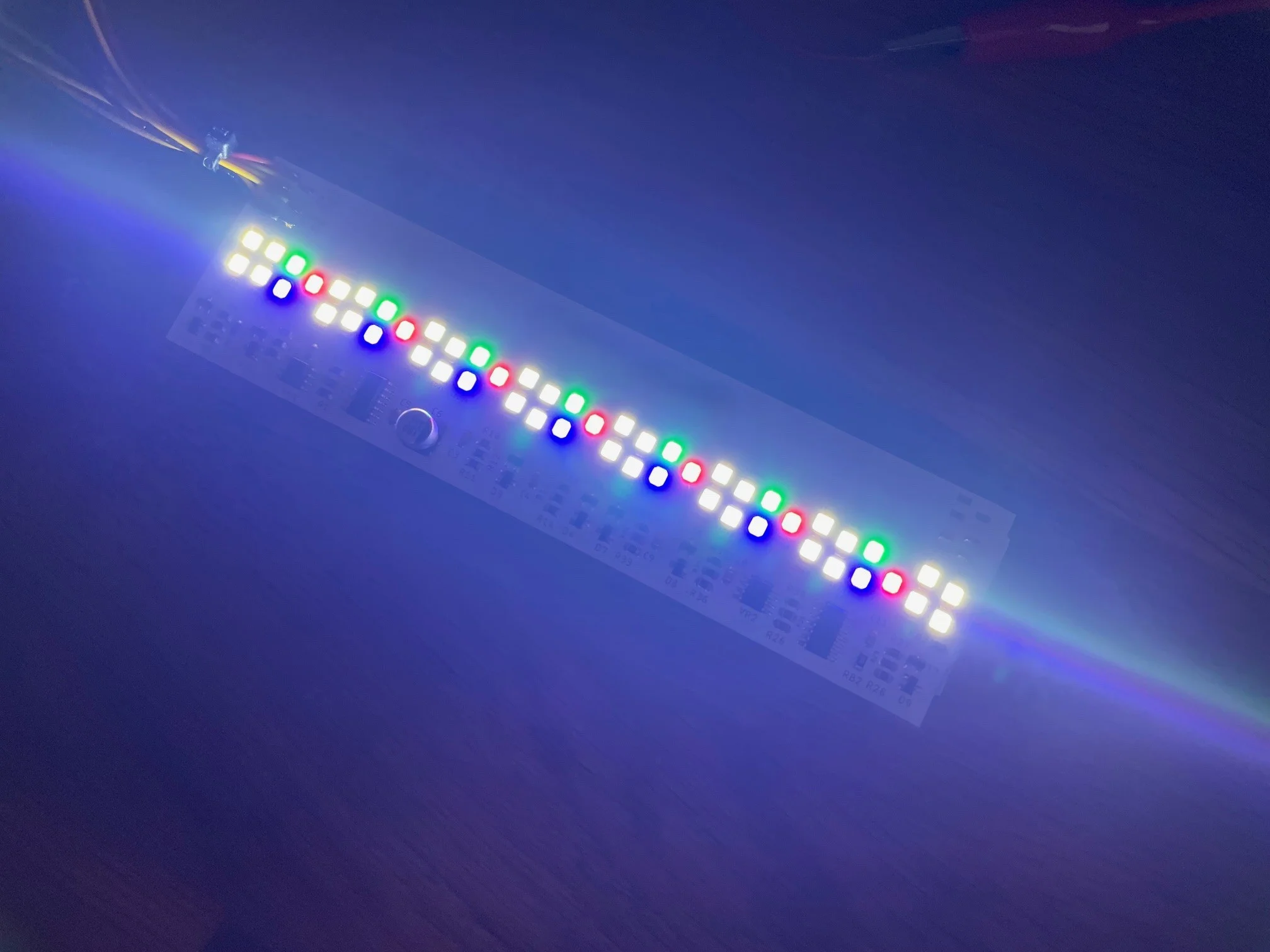 So ich bin jetzt einmal dazu gekommen den ersten Prototypen zu löten und zu testen. Leider musste ich etwas improvisieren, da ich nicht alle Bauteile in der korrekten Ausführung auf Lager hatte. Ich konnte deshalb nur weiß testen. Die farbigen LEDs kommen erst nächste Woche. Aber der erste Eindruck ist wirklich vielversprechend.