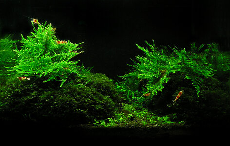Am heftigsten finde ich natürlich die Entwicklung vom Spiky und vom Fissidens, die als einzige Pflanzen von Anfang bis Ende integriert waren: Aus den dubios hellbraun-gelben Trieben, die ich als Spiky-Moos bekam, hat sich nach zwei Jahren das hübscheste Moos entwickelt, das ich je gezogen habe (und ich ernte regelmäßig große Portionen ab, im Wachstum ist es nun kaum zu bremsen). Und die paar Fitzelchen Fissidens fontanus sind mittlerweile Hauptbestandteil des Layouts.