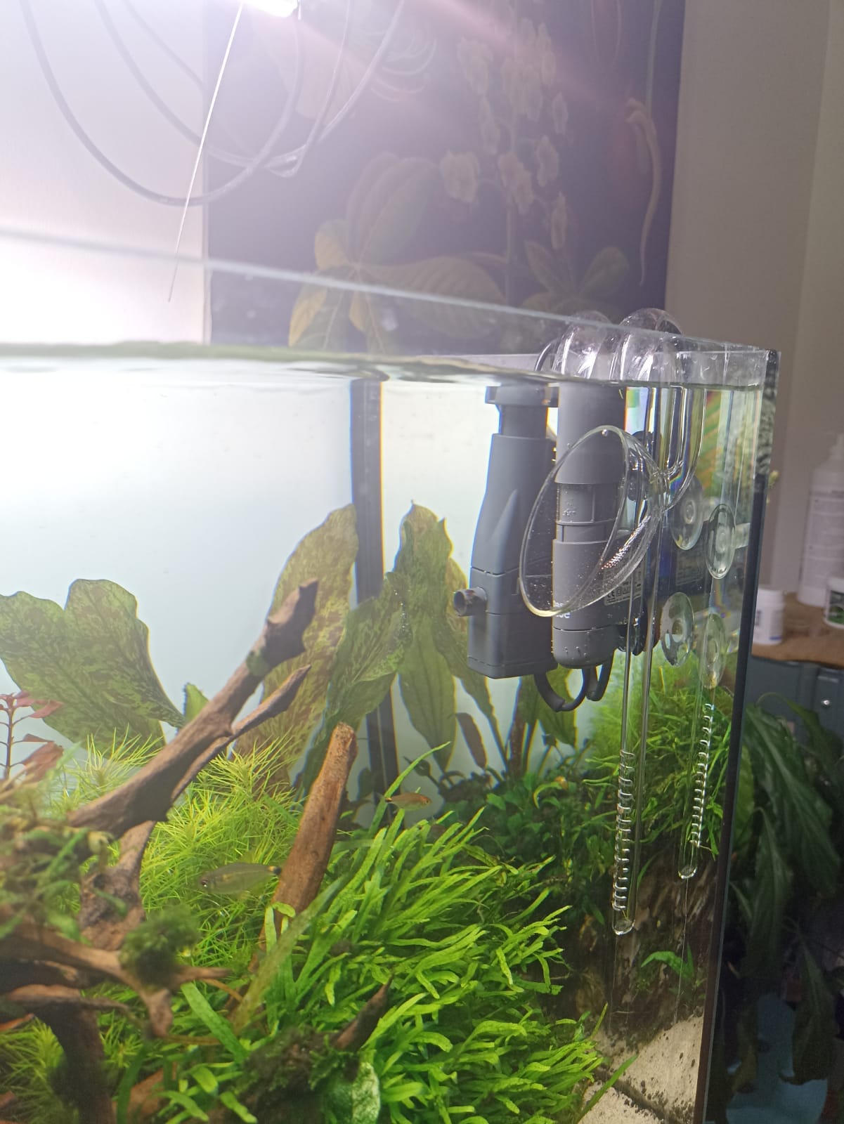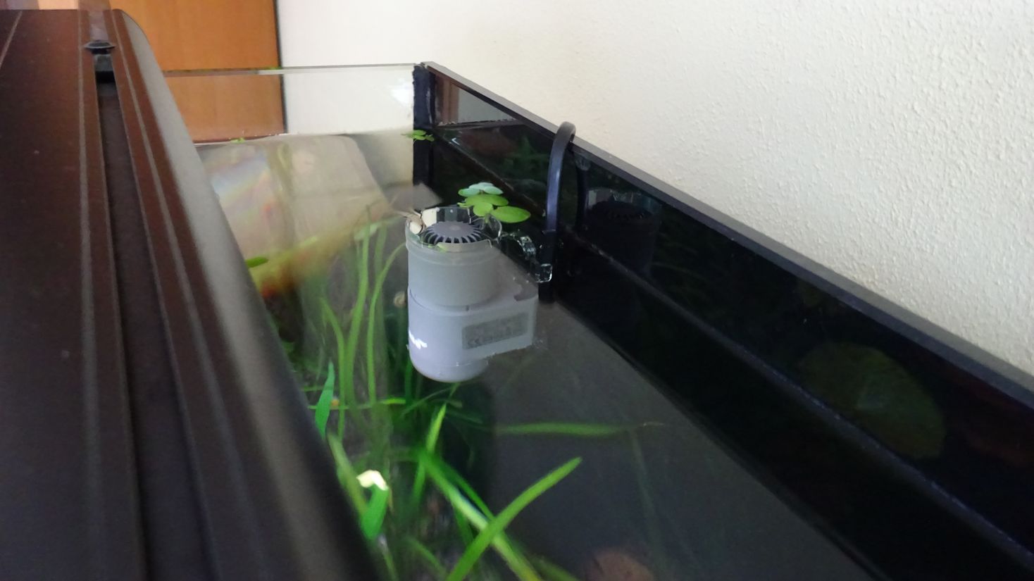 5. Obwohl sichtbar die Wasseroberfläche abegsaugt wird, hat er es in meinem 100 Liter Becken erst nach ca 1,5 Std geschafft die Kahmhaut abzuziehen.