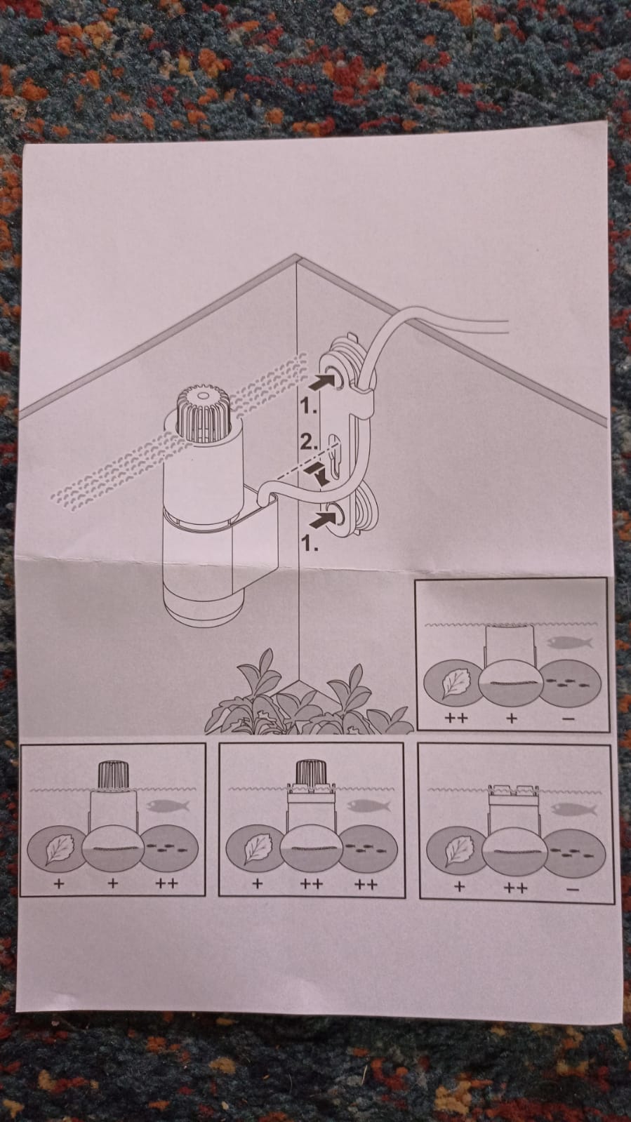 Ich habe dir mal die verschiedenen Möglichkeiten abfotografiert, wie Oase sich das gedacht hat wie man den Skimmer betreibt. Als Vergleich zur Stärke des Skimmers habe ich das Setting, welches im unteren rechten Bild abgebildet ist angenommen, da dieses dem Eheim Skimmer am nächsten kommt.