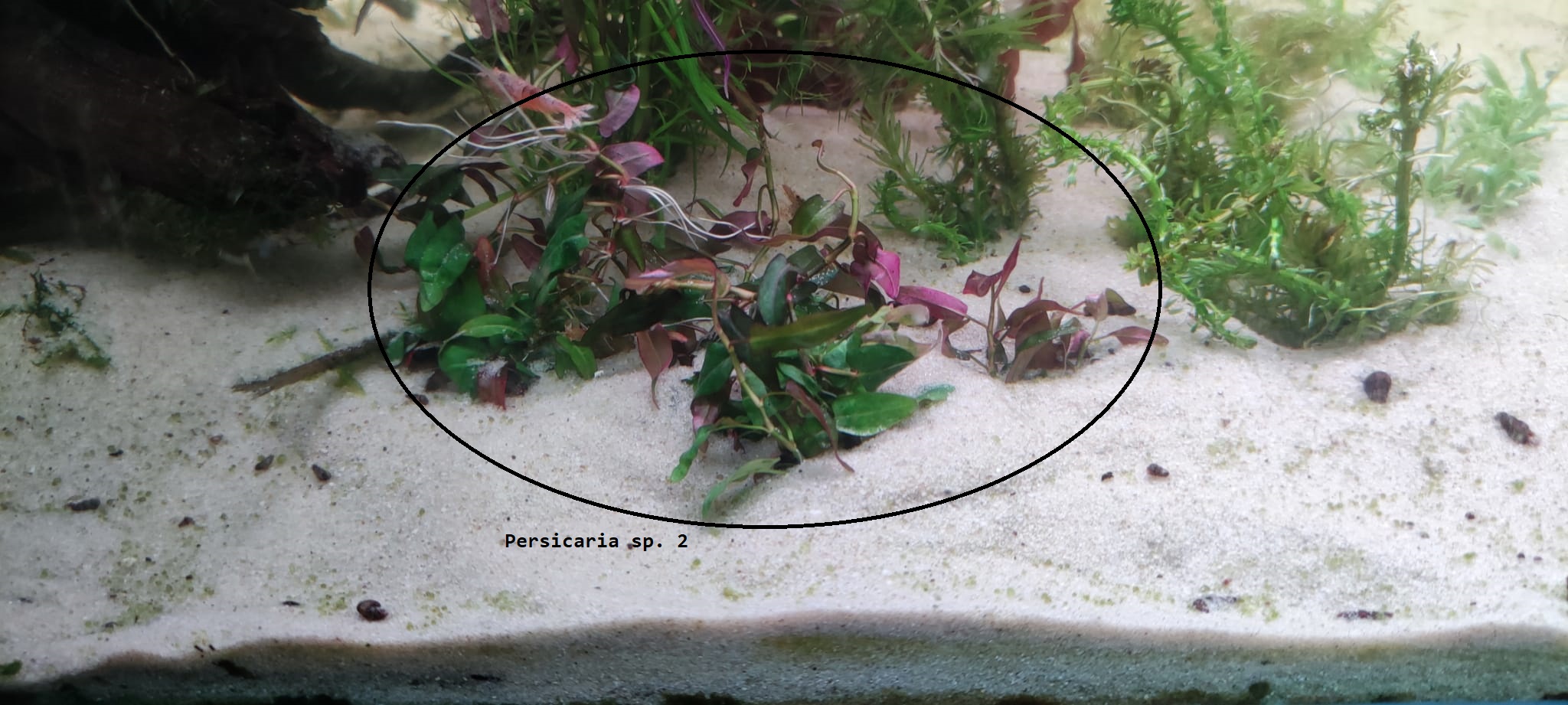 Dieser Wasserknöterich kam schon vor längerer Zeit in den Handel und wurde zunächst Polygonum sp. genannt. Er stammt wahrscheinlich aus dem tropischen Asien und ist noch nicht bis zur Art bestimmt worden. Persicaria sp. 2 kann über und unter Wasser wachsen. Ihre lanzettlichen, bis über 10 cm langen submersen Blätter nehmen rötliche bis violette Töne an, besonders bei guter Beleuchtung. Der Stängel wächst unter Wasser aufrecht.