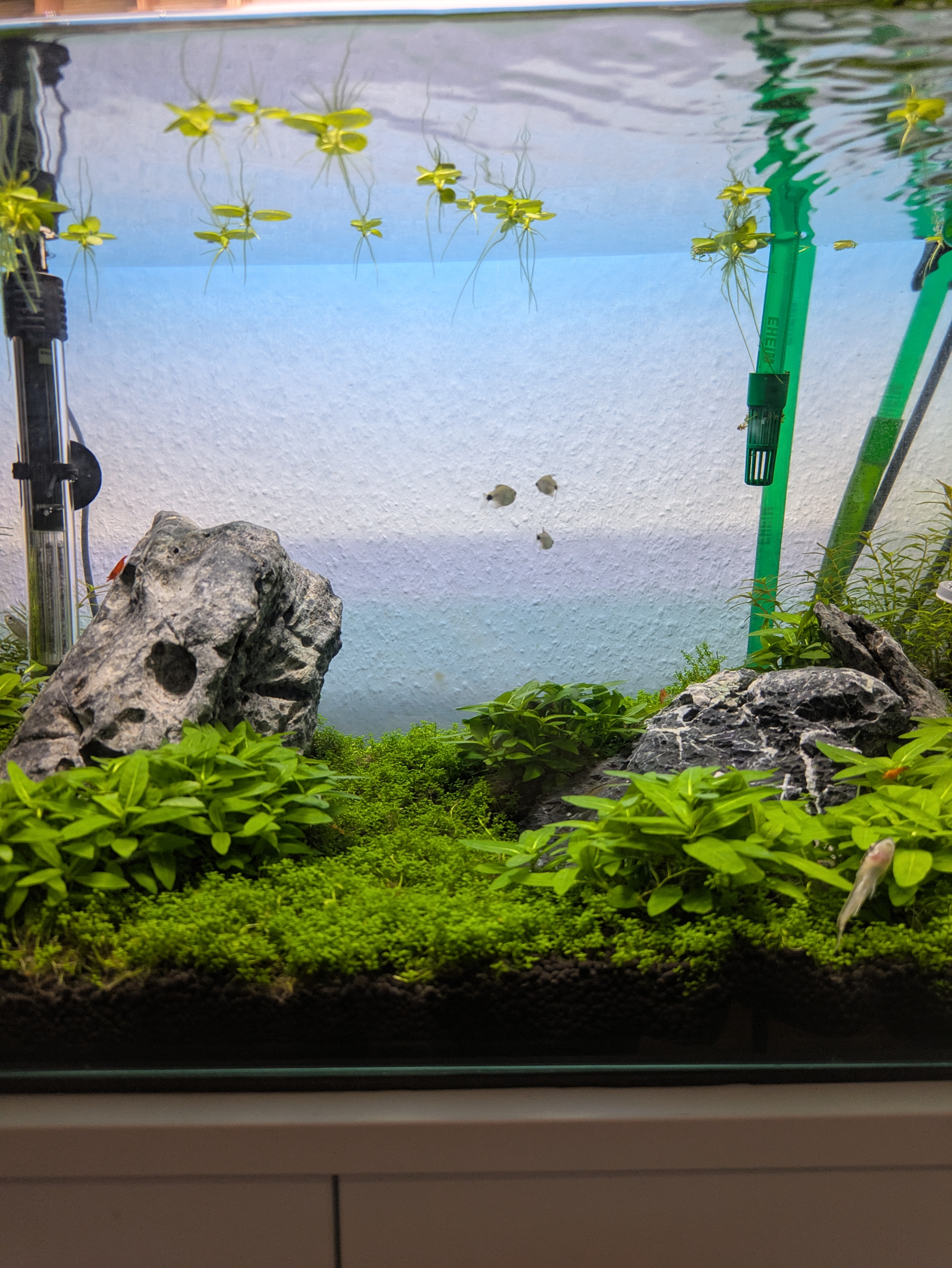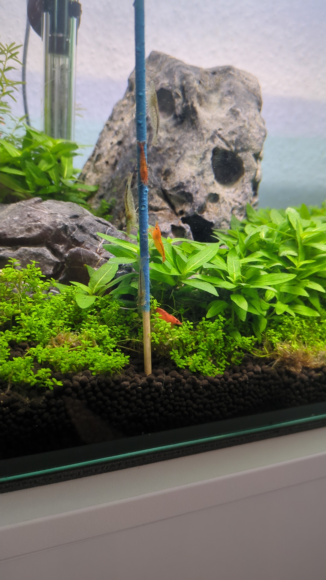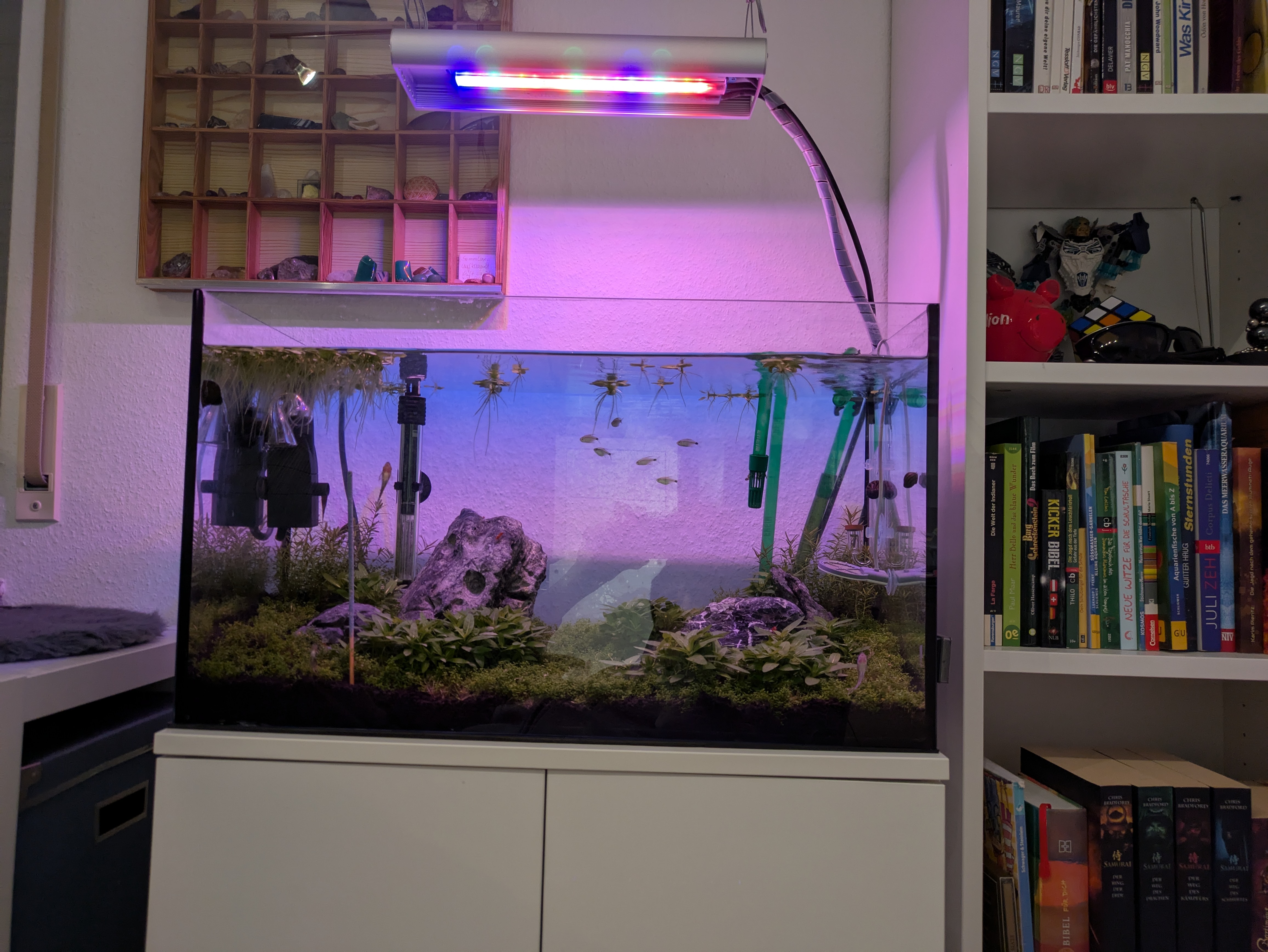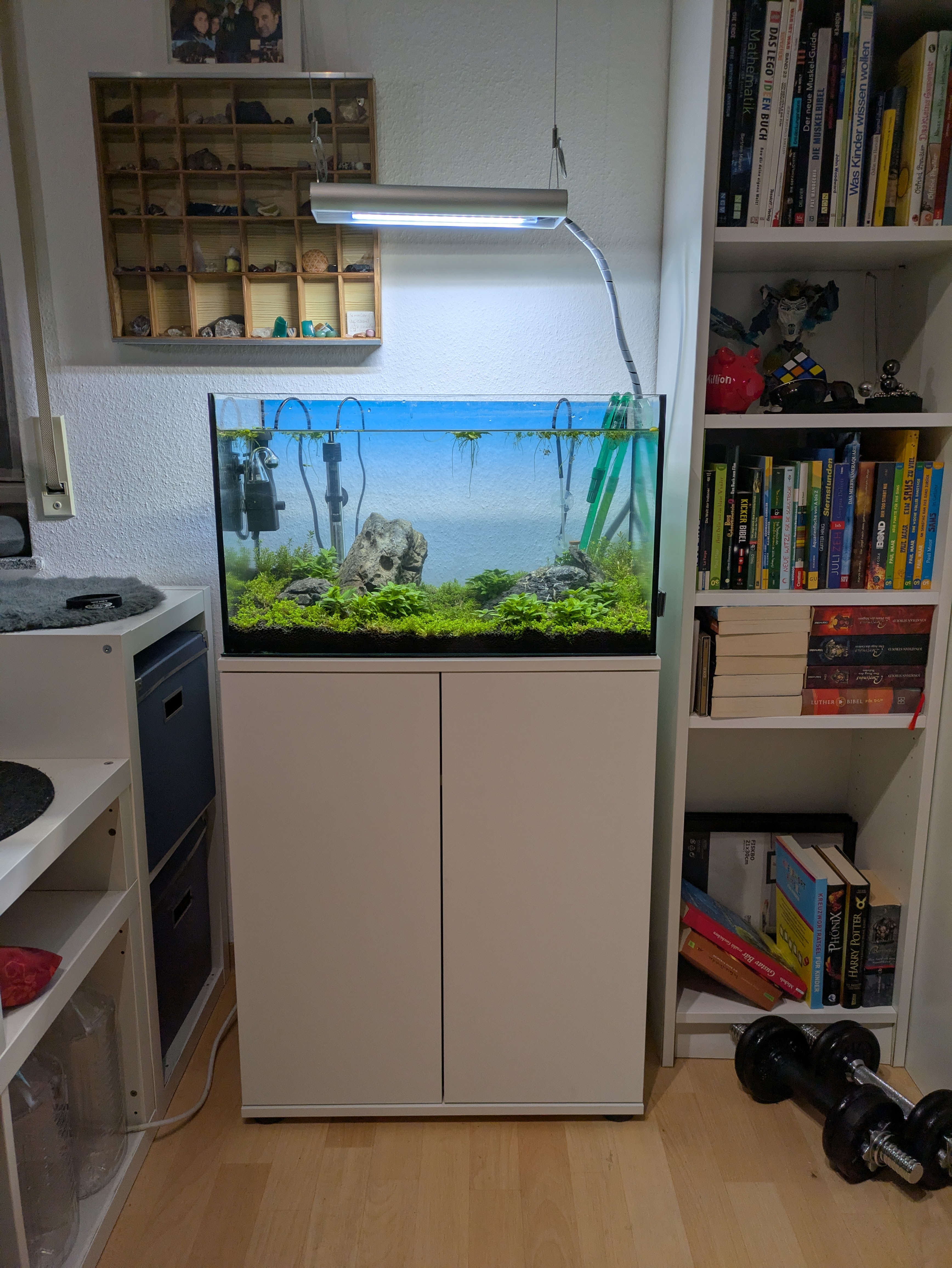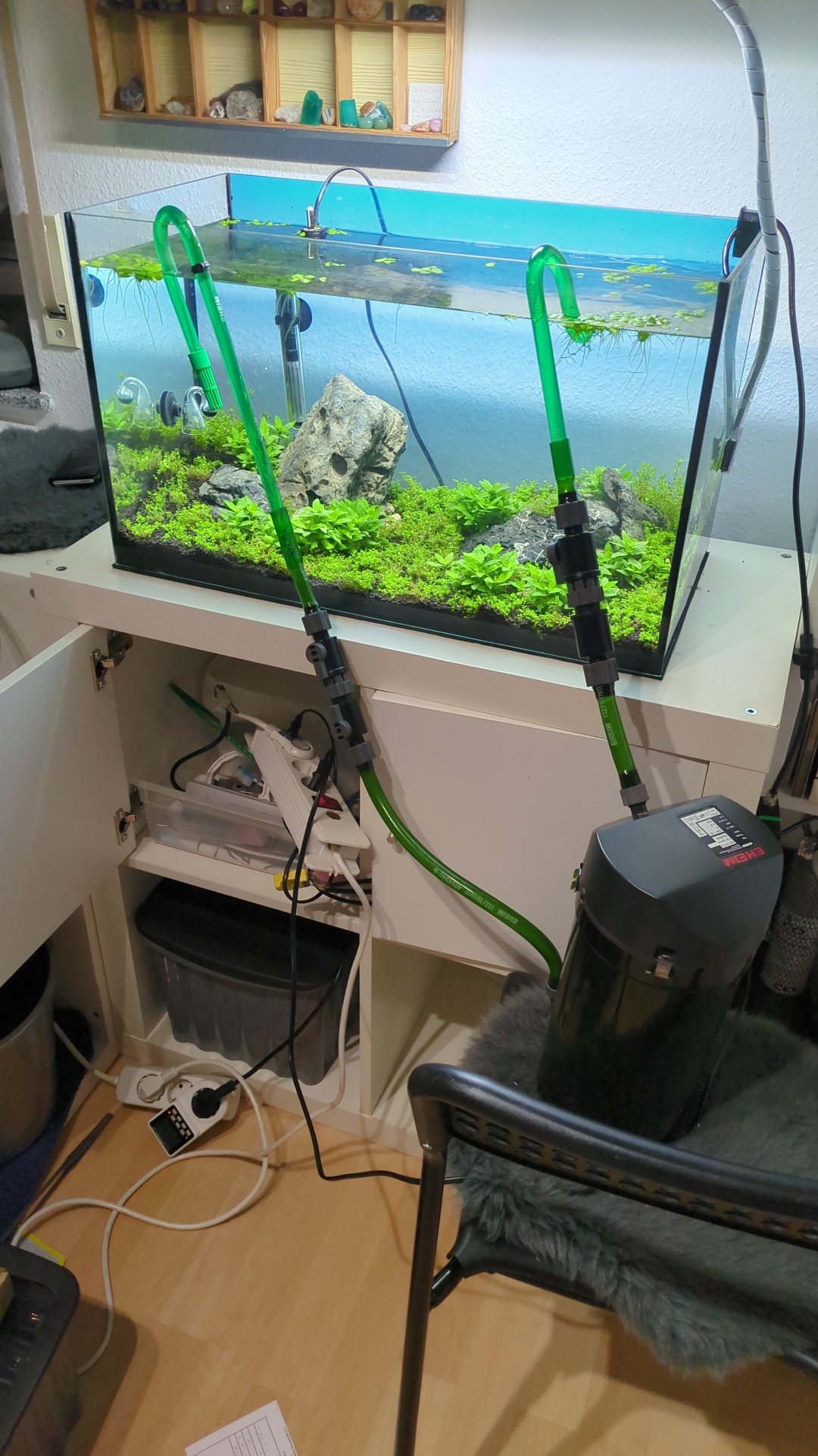 Allgemeines Update: mein Filter hatte eine undichte Dichtung, welche ich behoben habe, leider hat das mein Kallax nicht mitgemacht, weswegen ich jetzt einen Juwel Unterschrank gekauft habe. Morgen zieht dann das Becken um. Außerdem habe ich mir für die Kahmhaut einen Eheim Skim 350 bestellt, natürlich mit passendem Garnelenschutz und plane diesen am Tag 1h laufen zu lassen(je 30minuten vor der Nachtabschaltung und nach der Nachtabschaltung vom Co2) gegen die Kahmhaut. Außerdem werde ich mir einen Twinstar M5 zulegen um potentiellen Grünalgen den Garaus zu machen, da ich keine Lust habe den Spaß am Aquarium zu verlieren, sowie jede Menge Pflanzen,durch eine Grünalgenplage. Die Beleuchtung hat jetzt auch eine je 50 minütige Sonnenauf- und Untergangsphase. Im Anhang noch ein Bild vom Schrank, sowie von der Übergangslösung über Nacht.