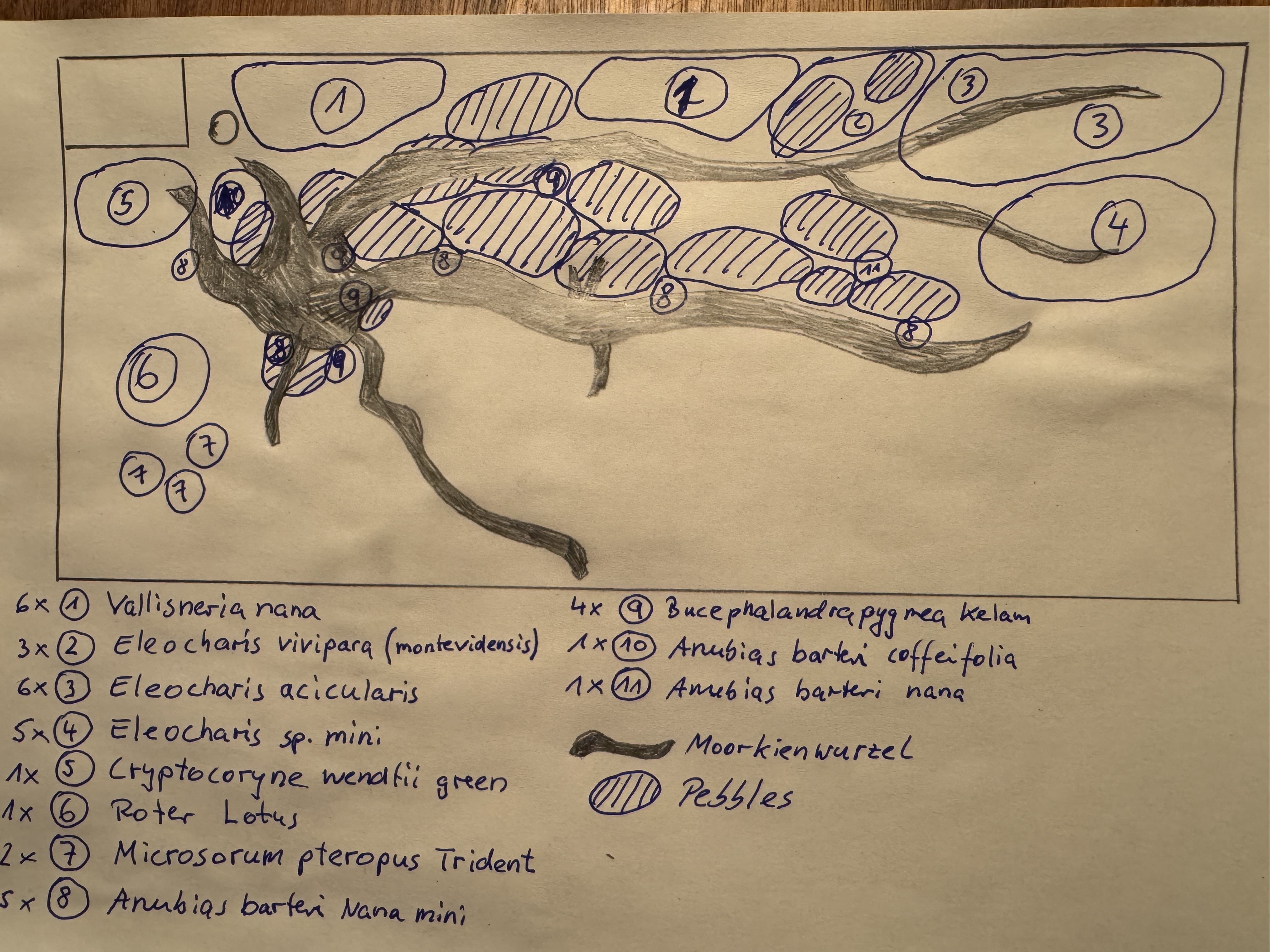 Bei den Pflanzen würde ich die Anordnung Tigerlotus/Cryptocoryne tauschen, da sonst von der Cryptocoryne nicht viel zu sehen sein wird. Das Hardscape kann ich von den Dimensionen schwierig einschätzen. Mir passiert es häufig, dass ich es zu klein plane. Es ist dann schnell überwachsen. Da kann man mutig sein. Viel Freude mit dem neuen Becken!