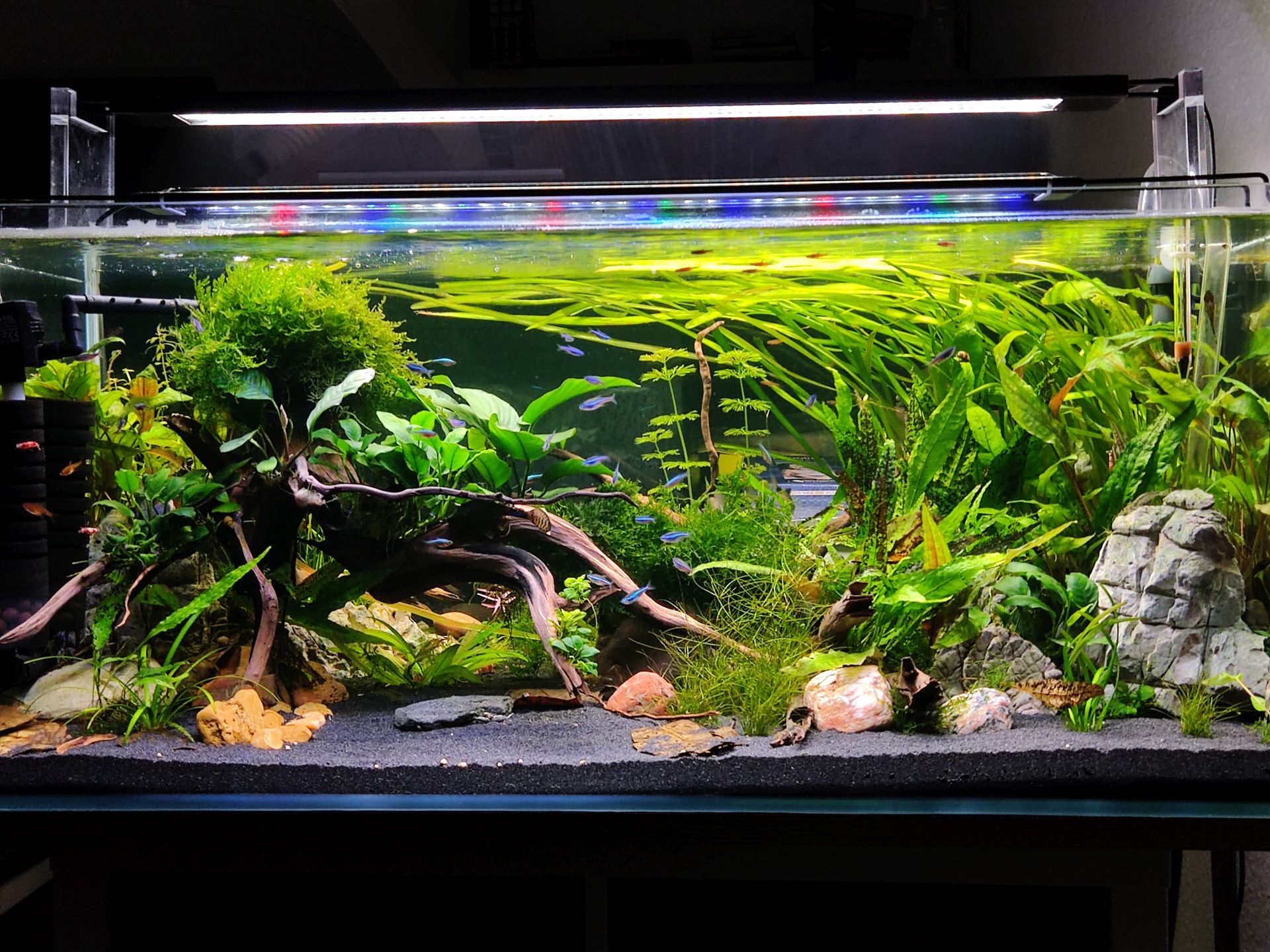 Hier nun die Bilder von meinen noch Halbchaosbecken. Da ich den Filter nun zum ersten mal reinigen will seit ich das Becken komplett neu gemacht habe lasse ich noch alles Wuchern damit der Verlust der positiven Bakterien nicht so ins Gewicht fällt und nein natürlich werde ich nicht alles komplett reinigen, aber ich gehe da einfach auf Nummer sicher und wenn 3-4 Wochen danach um sind werde eich auch das Aquarium zum ersten mal entrümpeln. Sprich Einige Pflanzen werden ausgedünnt oder komplett entfernt.