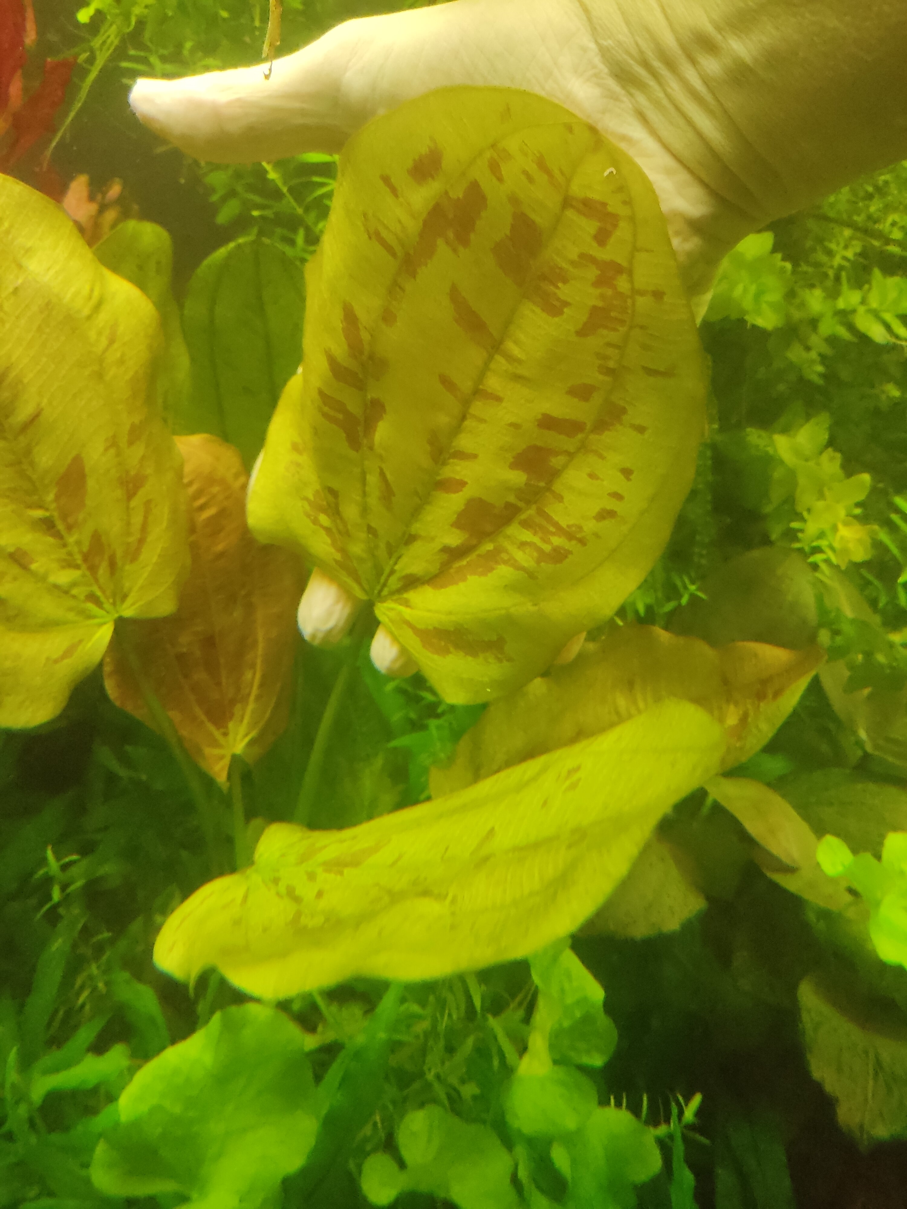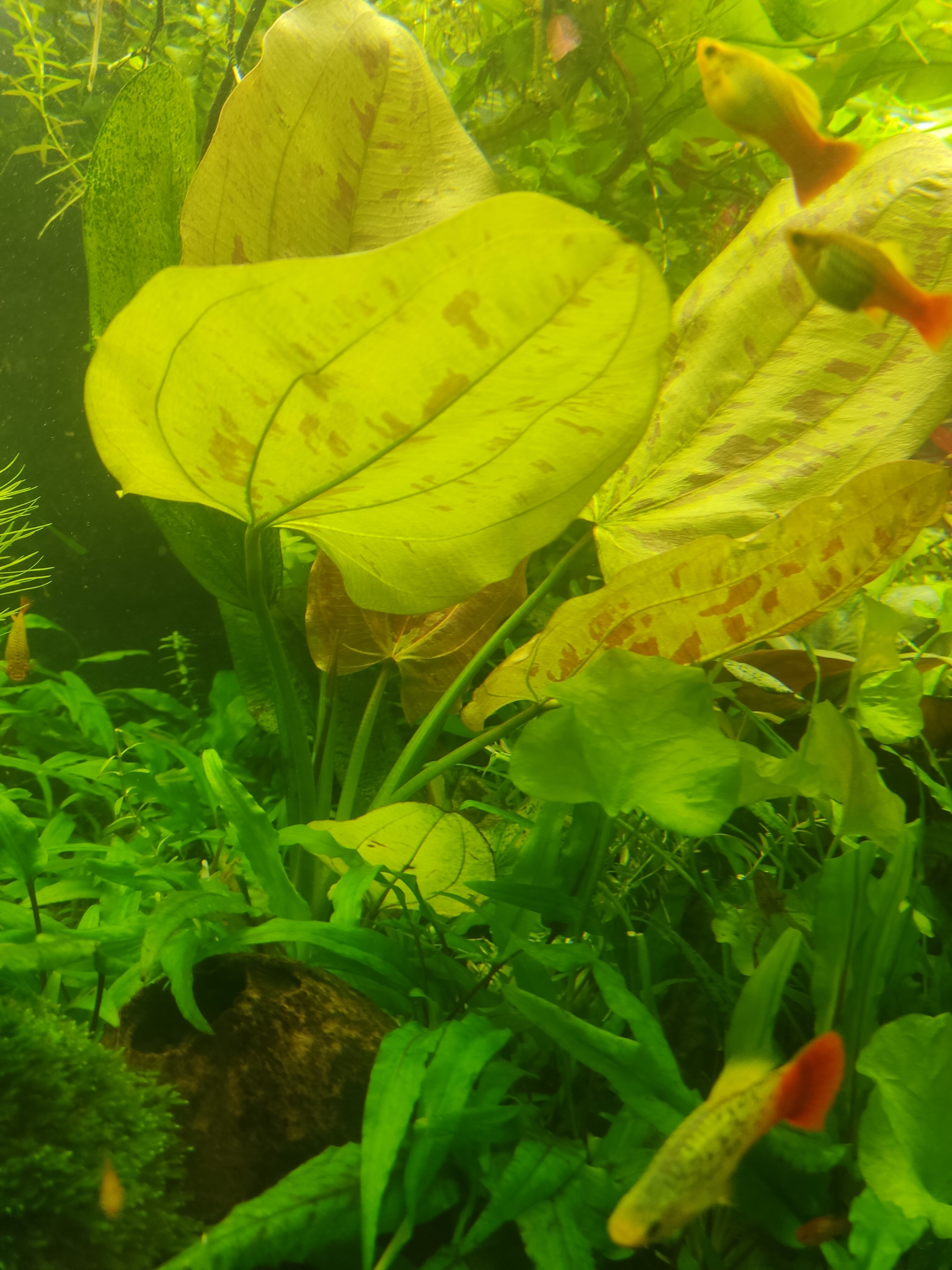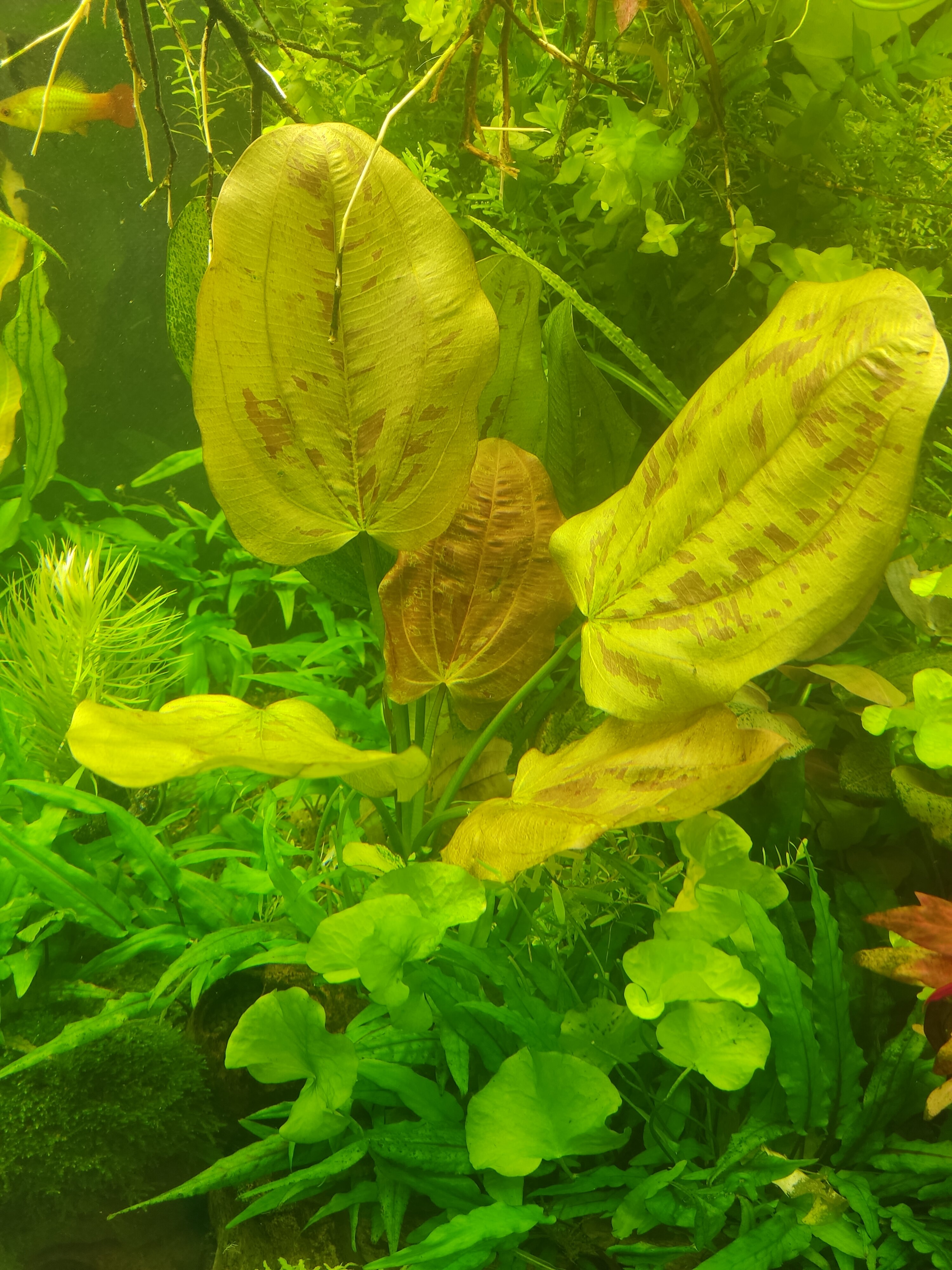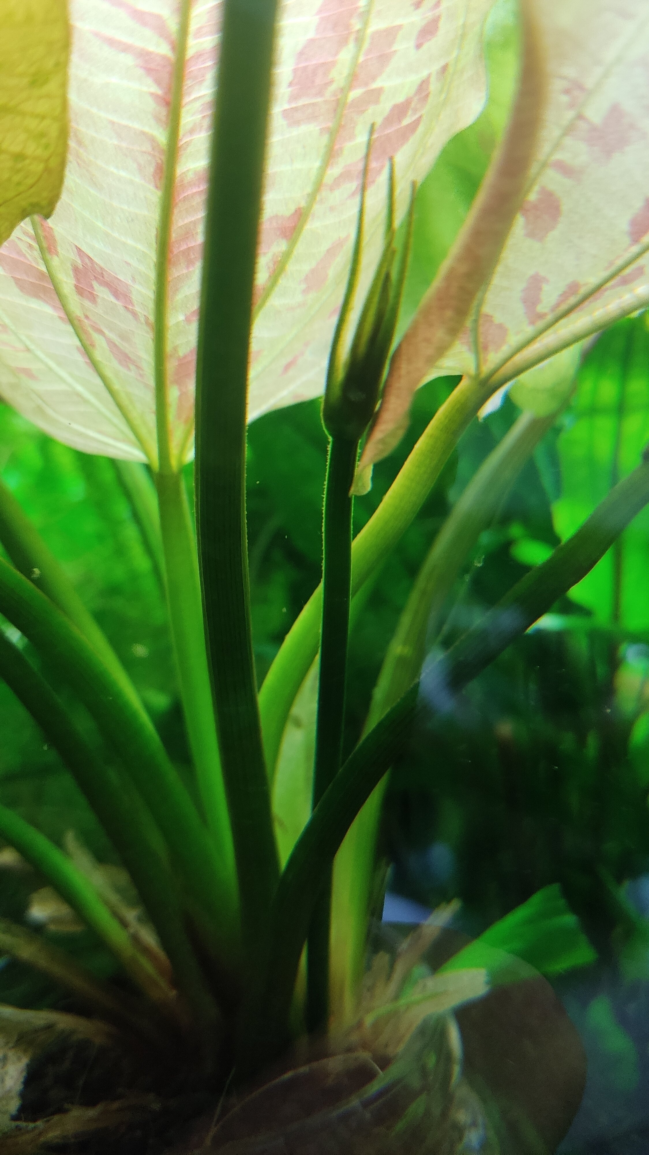 Im dicht bepflanzten und immer wieder mit Grünalgenbelägen versehenen Aquarium hat sich eine Pflanze verabschiedet, die andere hat eine Wuchshöhe von 27cm erreicht.