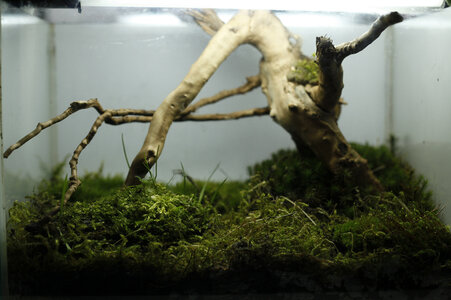 In das Kleine sind nun nach einem Ausflug mit den Kindern etliche Waldmoose eingezogen. Und die eine Wurzel, die schon vor etlichen Jahren nie unter Wasser bleiben wollte.